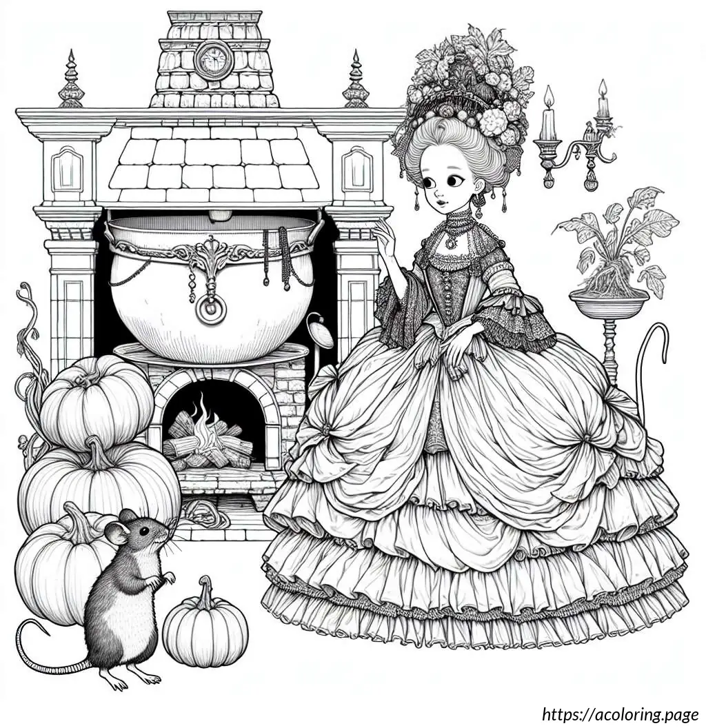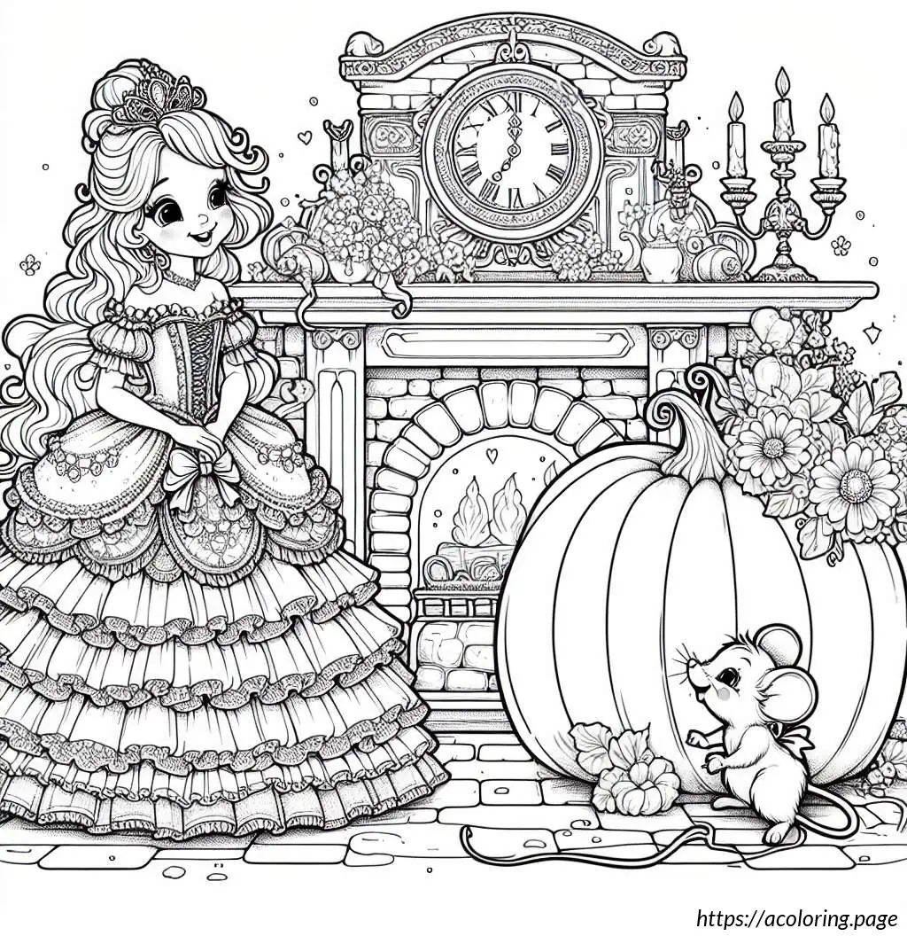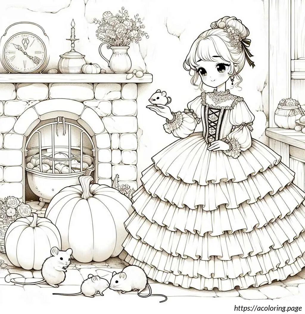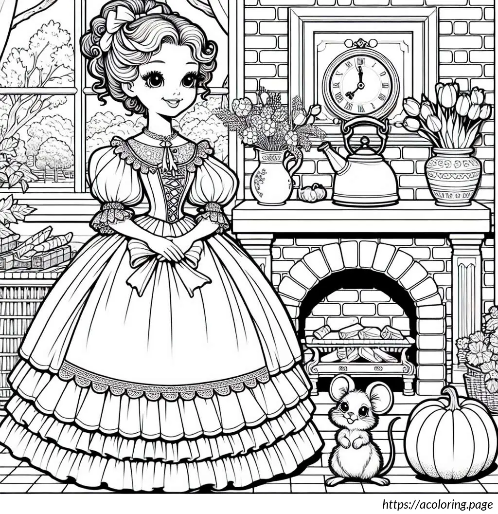This image is a line drawing intended for coloring. It features a whimsical scene with a young girl resembling a fairy tale character, perhaps Cinderella, as she interacts with a small mouse. The setting appears to be a rustic kitchen corner beside a large fireplace. The girl is wearing an elegant ball gown with ruffles and a corset; her expression is one of gentle interaction as she kneels down to seemingly communicate with the mouse.
