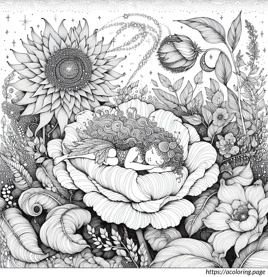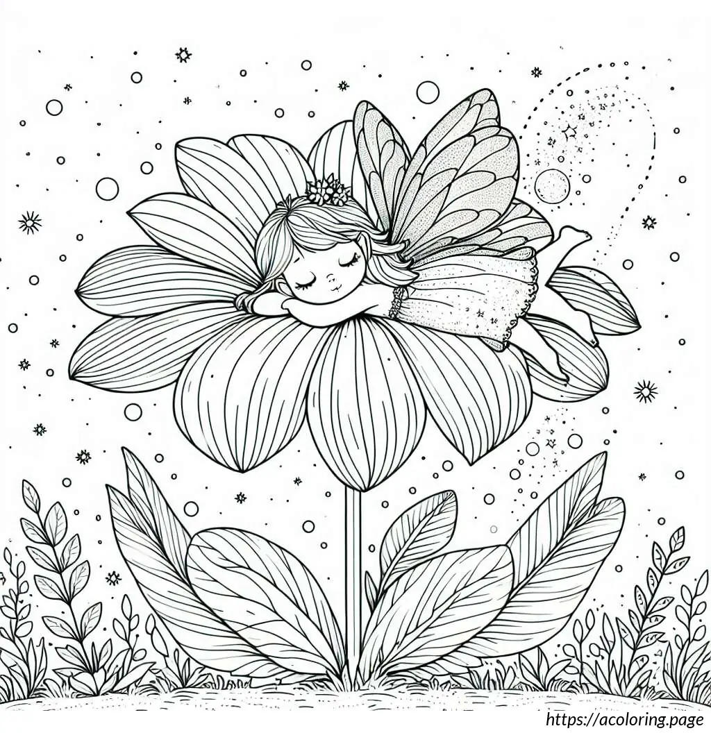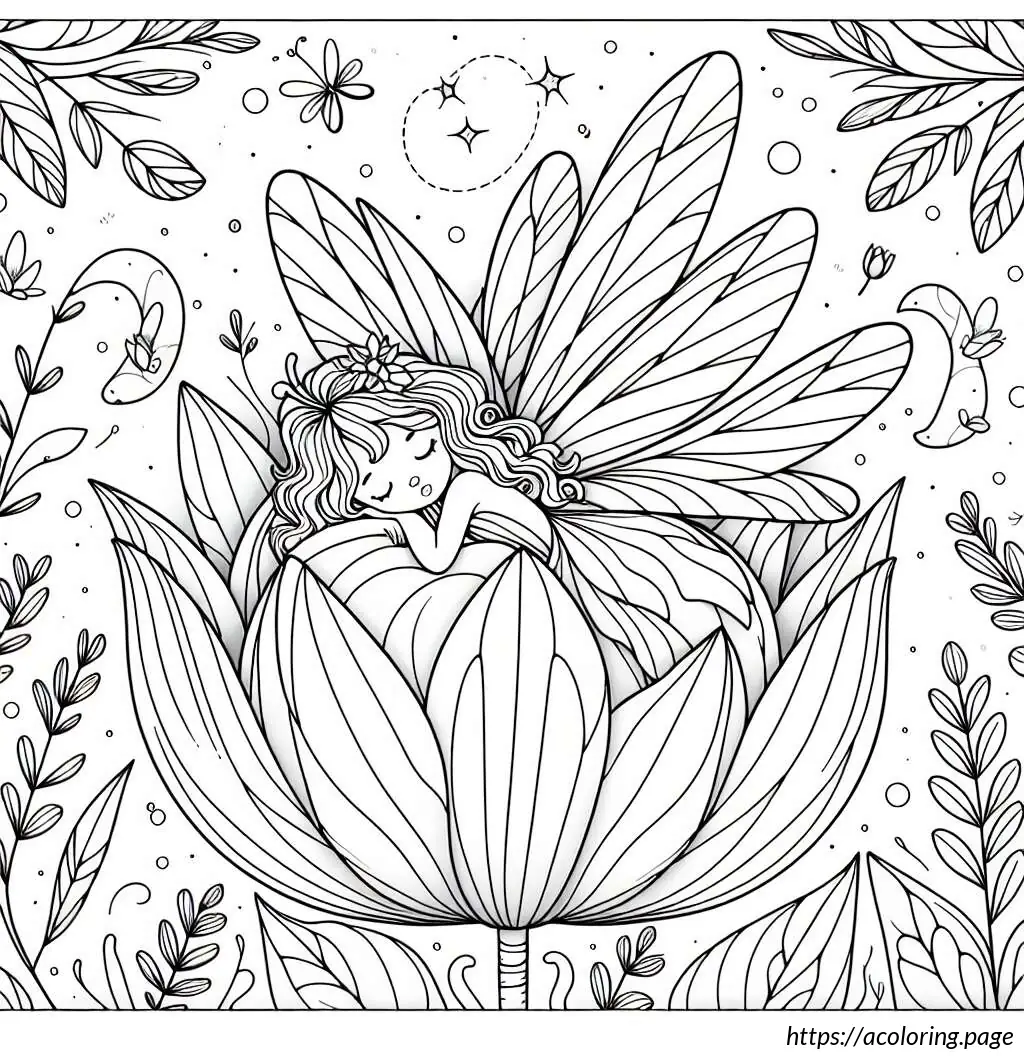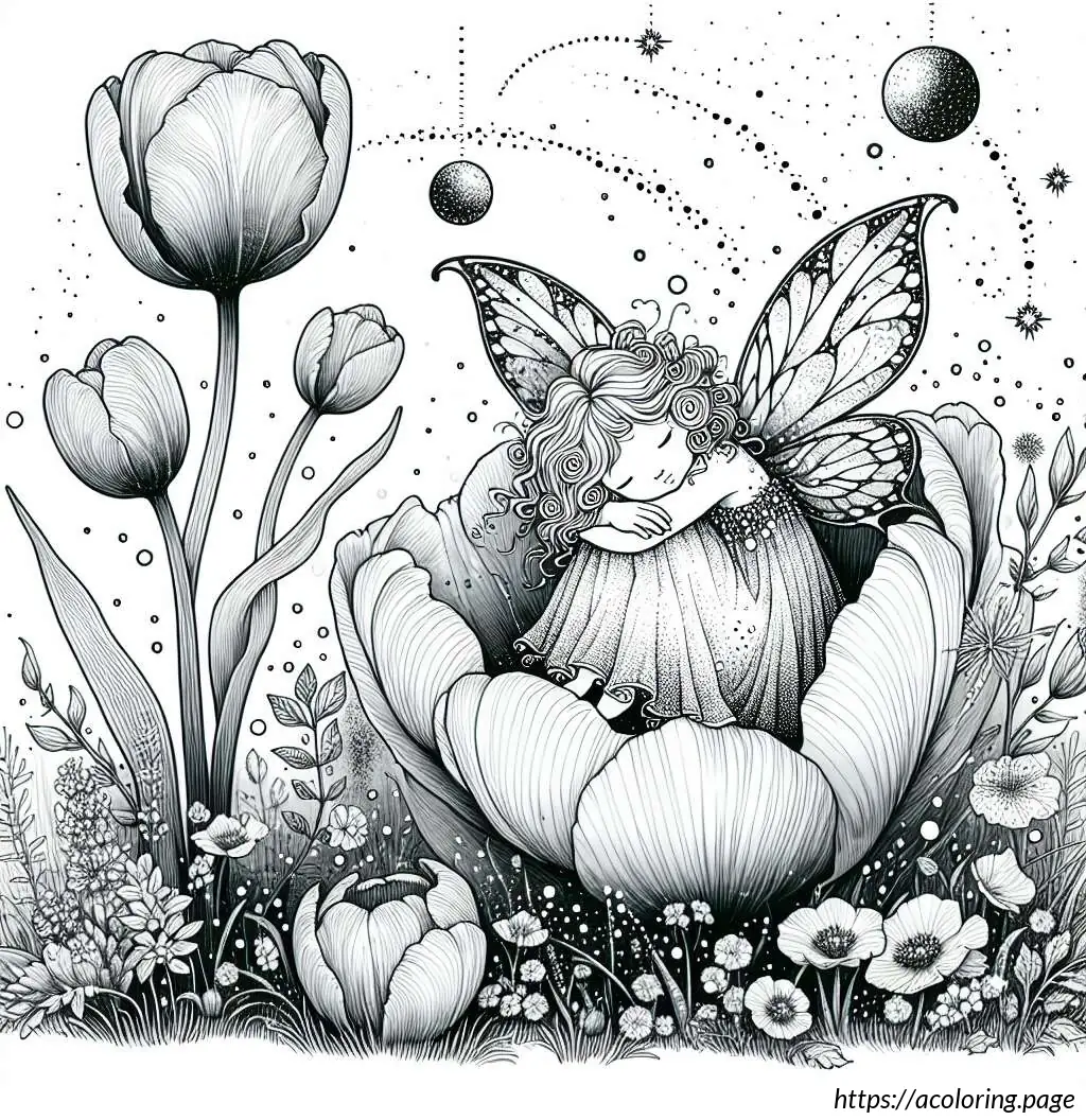 This image is a black-and-white line drawing designed to be a coloring page. The central feature of the image is a fairy sleeping peacefully. This fairy is gentle-looking with curly hair, and is nestled within the petals of a tulip. The fairy’s wings are slender and pointy, resembling those of dragonflies.