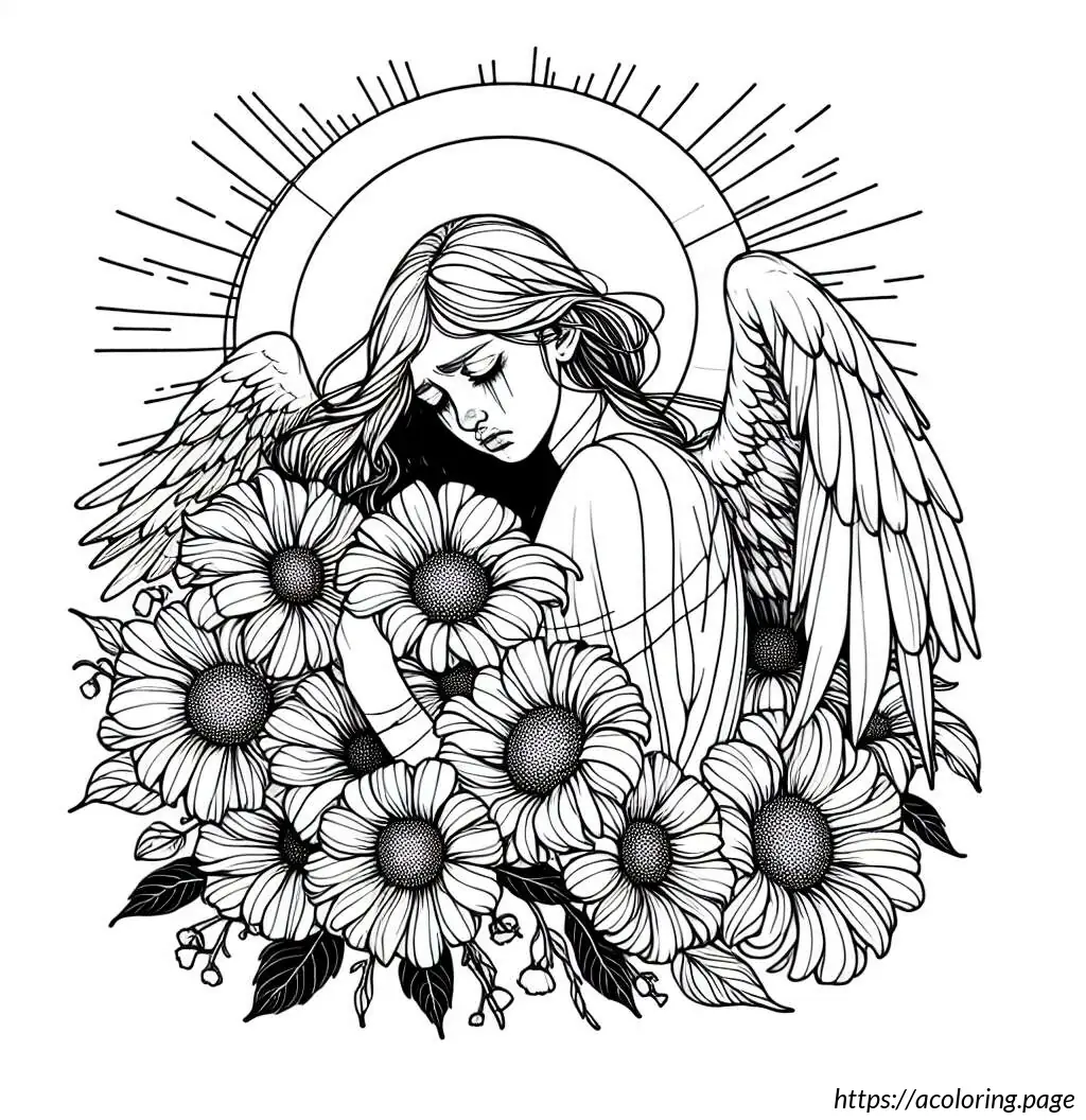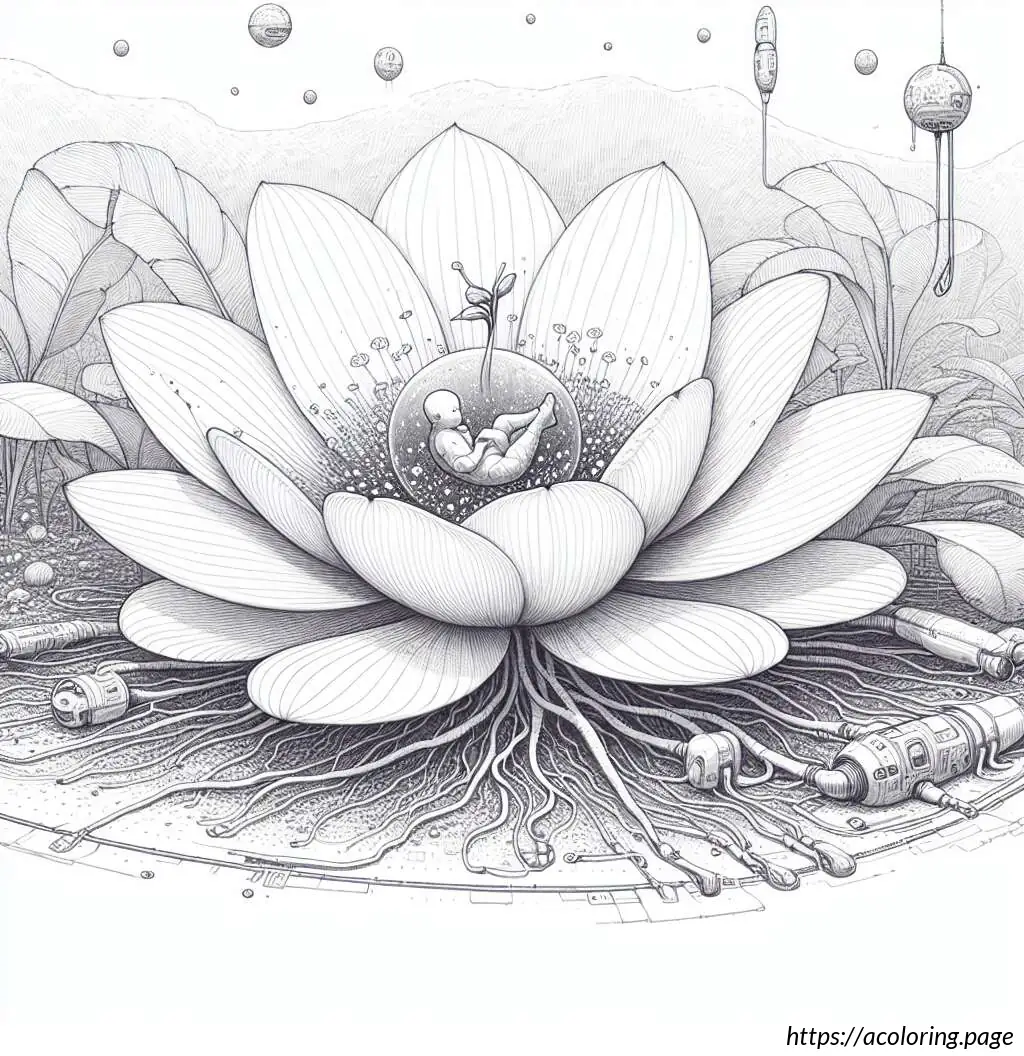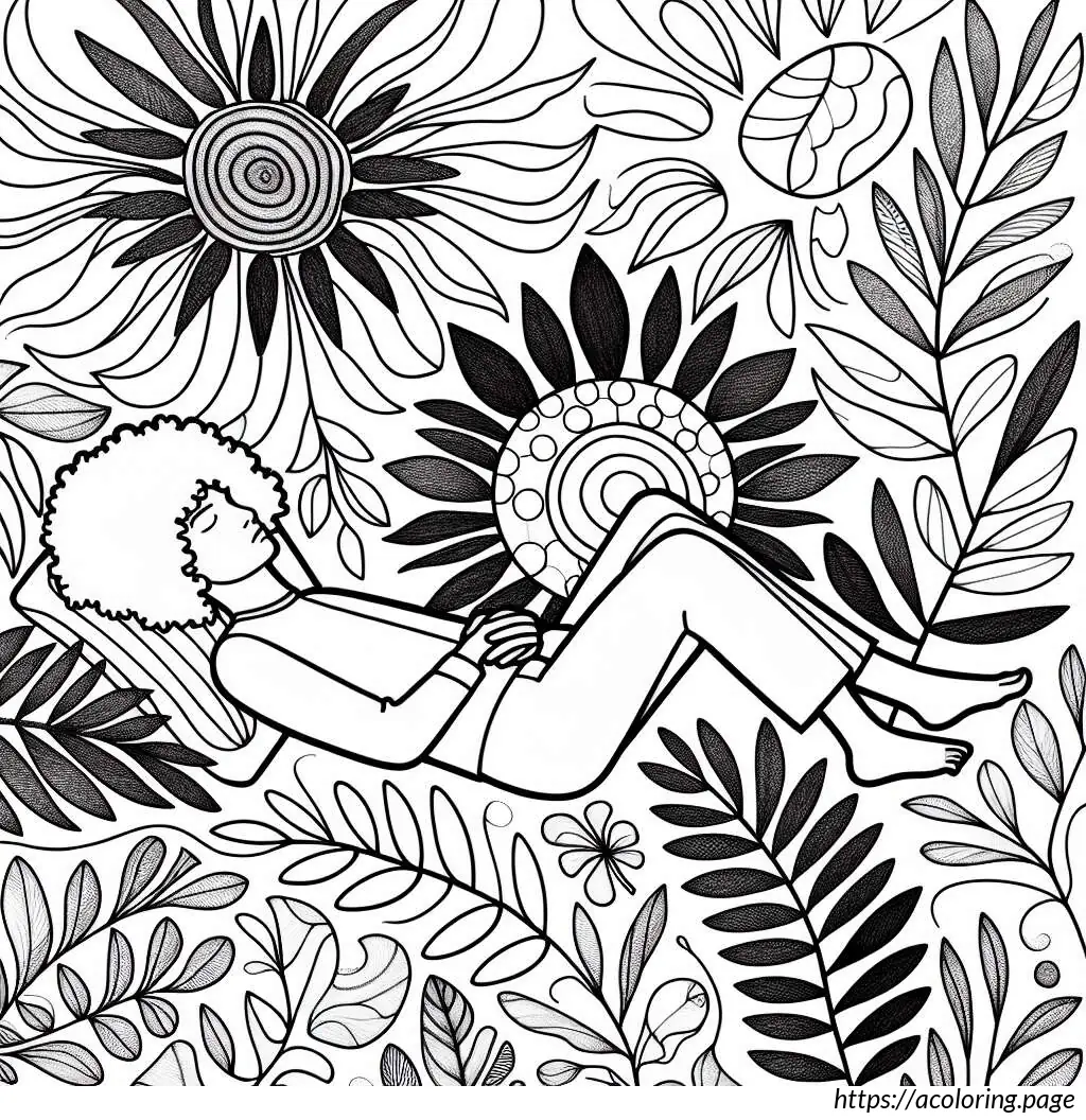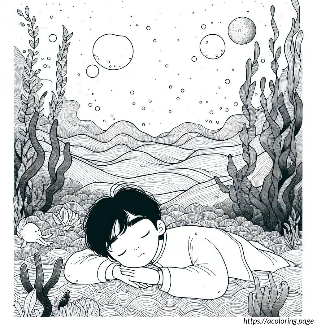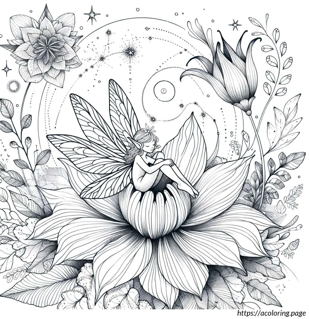This image is a black-and-white line drawing designed to be a coloring page. The central feature of the image is a fairy sleeping peacefully. This fairy is gentle-looking with curly hair, and is nestled within the petals of a tulip. The fairy’s wings are slender and pointy, resembling those of dragonflies.