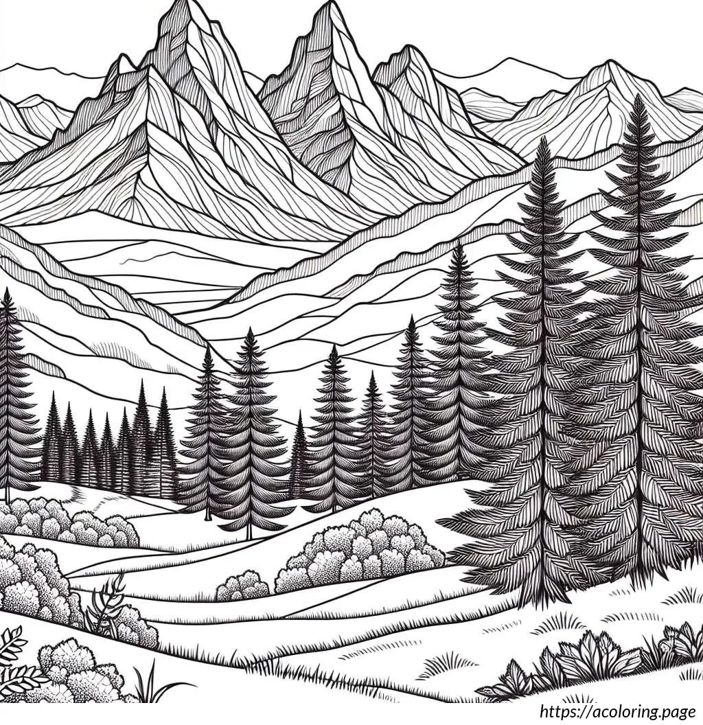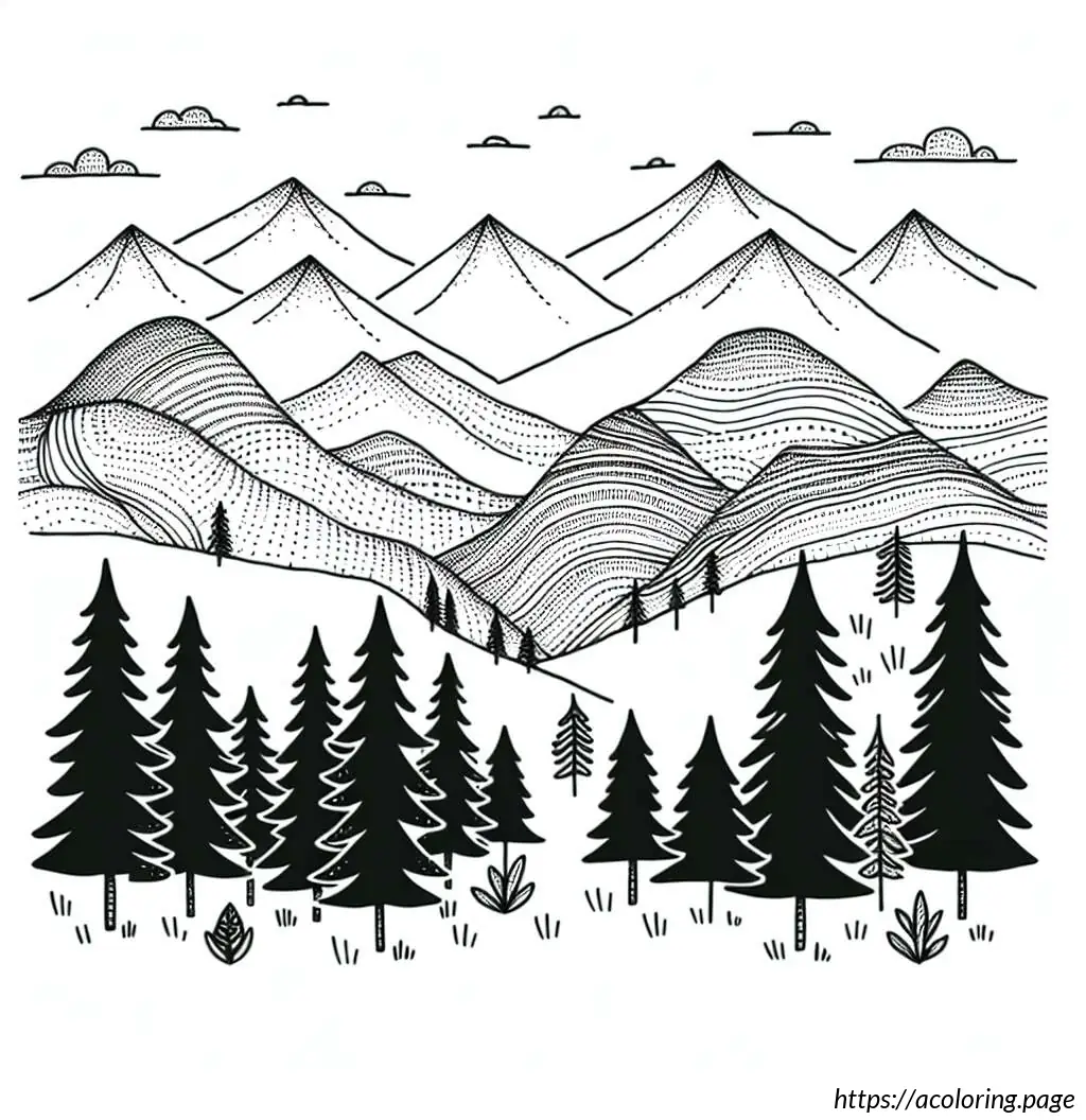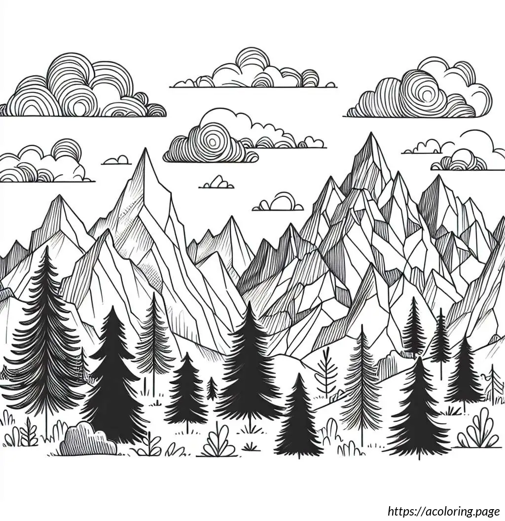 This image is a simple black and white line drawing depicting a mountainous landscape. The composition features several jagged mountain peaks in the background, which are represented with bold, thick lines that define their rocky and uneven surfaces. In the foreground, there are multiple pine trees of varying sizes. These trees are drawn with wavy, serrated lines to symbolize their needle-covered branches.