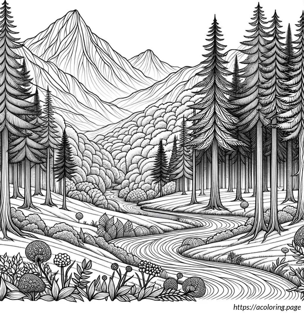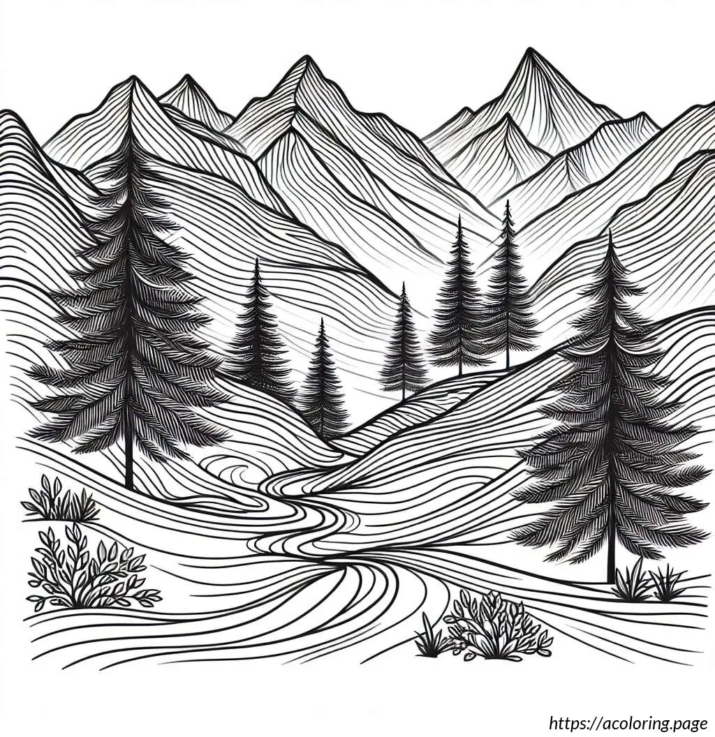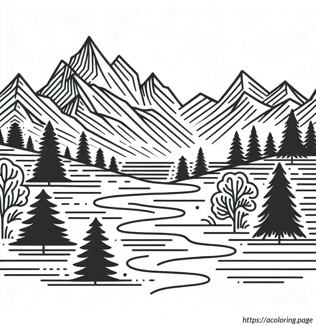 There is a winding path or river that meanders through the middle ground, cutting through the trees and stretching towards the mountains. The lines that form this path are smooth and curvy, suggesting a gentle flow. The overall lack of detail and the use of abstract shapes give the drawing a minimalist and expressive feel, focusing more on the contours and overall shapes than on intricate details. This style can be appealing for coloring activities or as a stylistic choice for conveying the essence of a natural scene with simplicity.