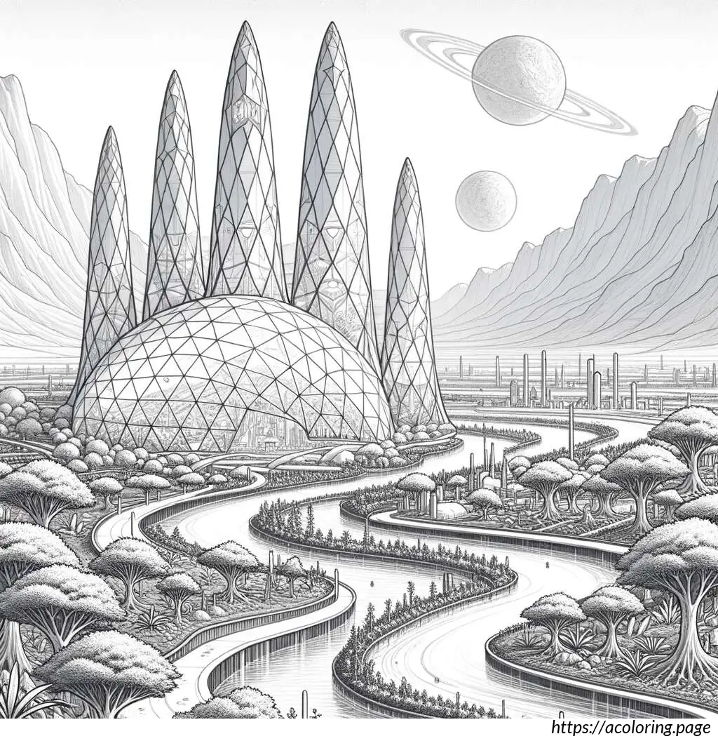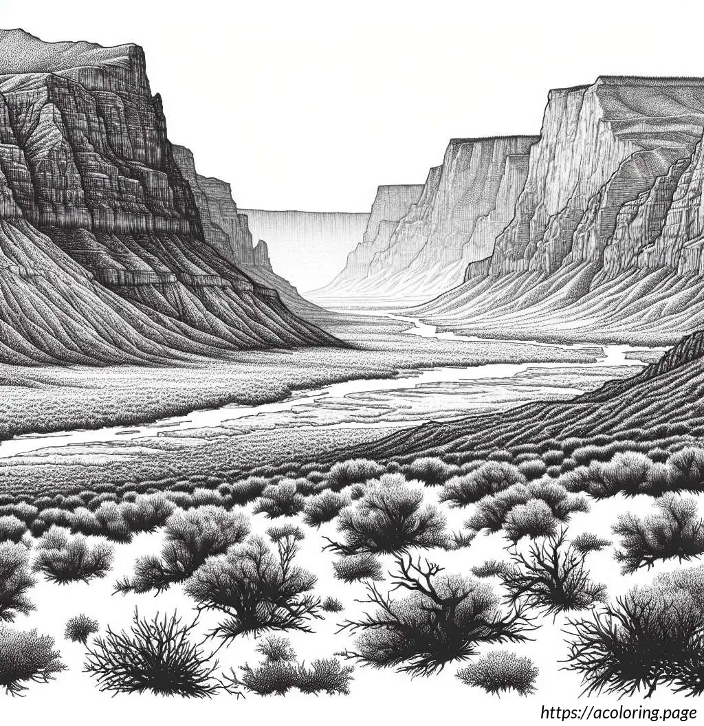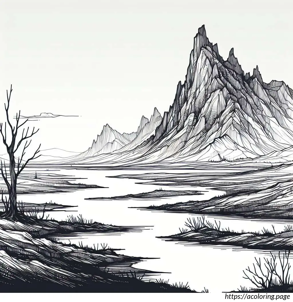 There is a winding path or river that meanders through the middle ground, cutting through the trees and stretching towards the mountains. The lines that form this path are smooth and curvy, suggesting a gentle flow. The overall lack of detail and the use of abstract shapes give the drawing a minimalist and expressive feel, focusing more on the contours and overall shapes than on intricate details. This style can be appealing for coloring activities or as a stylistic choice for conveying the essence of a natural scene with simplicity.