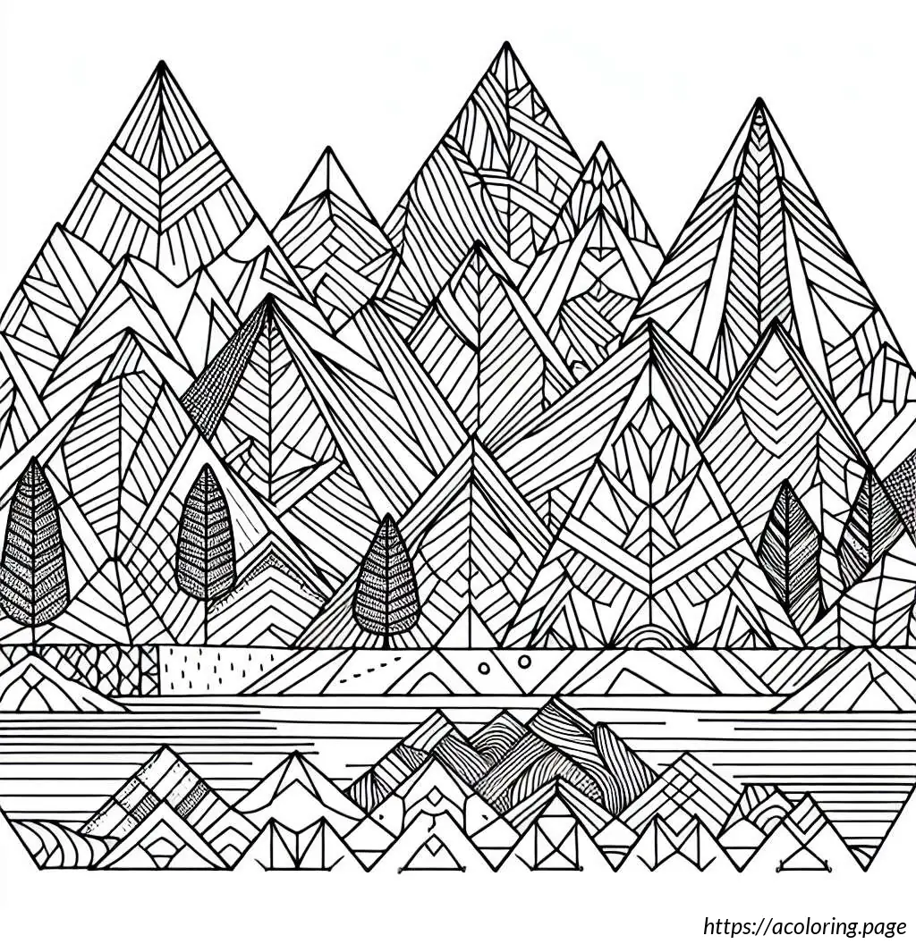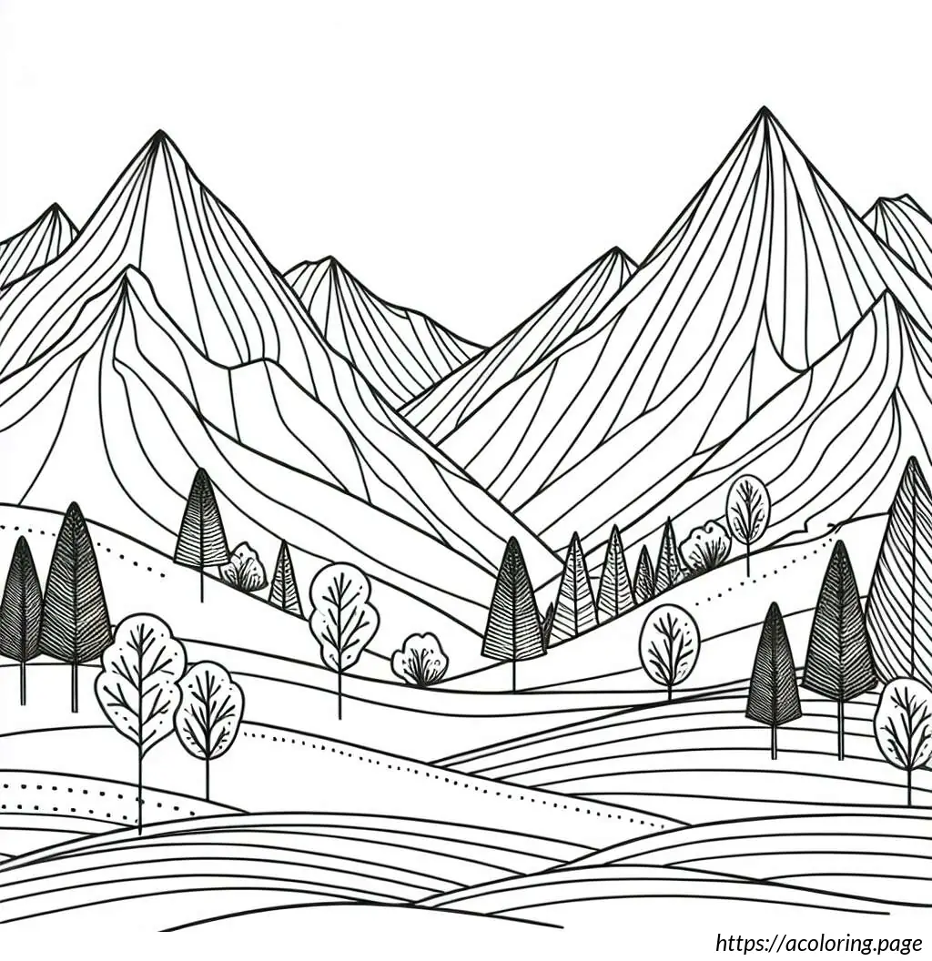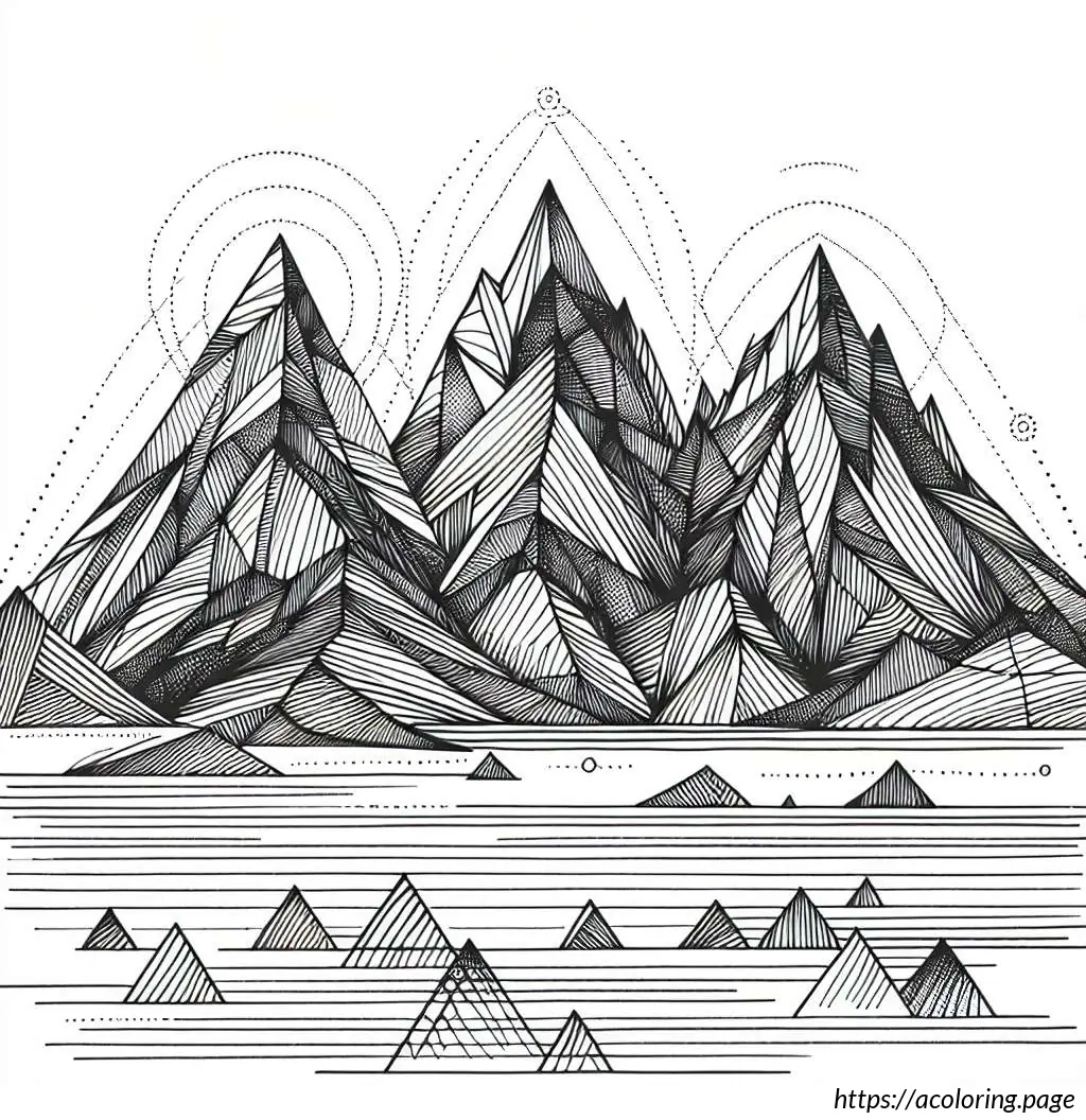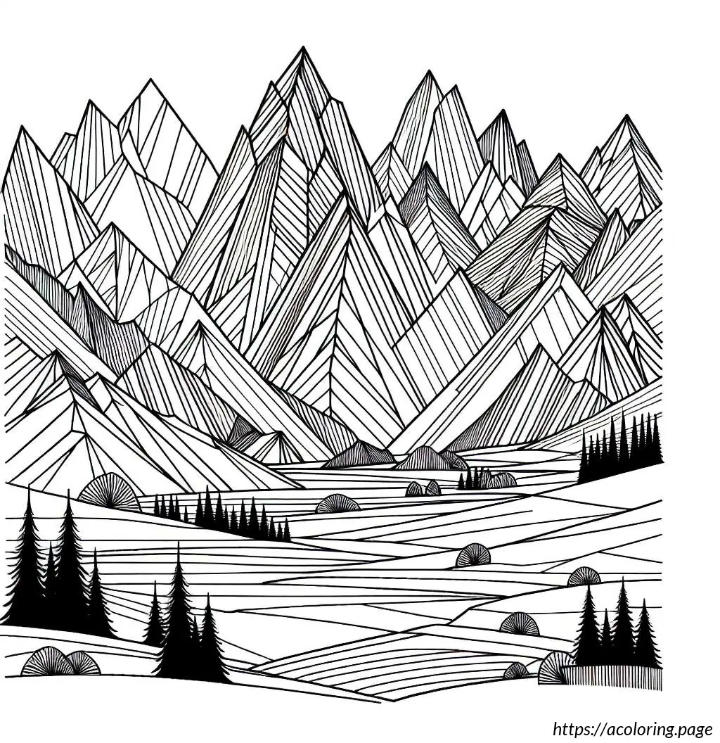 This image is a simple line drawing that depicts a mountainous landscape. It features a range of triangular and jagged mountain peaks, differing in size and perspective, creating a sense of depth. Some smaller triangular shapes at the base of these mountains resemble trees. The foreground includes lines that suggest a plain or a valley leading up to these mountains. There are also angular forms that might represent distant hills or additional geographical features in the background. The whole image is composed of black outlines on a white background, giving it a stark, graphic look. This style is common in coloring books or as a minimalist art print.