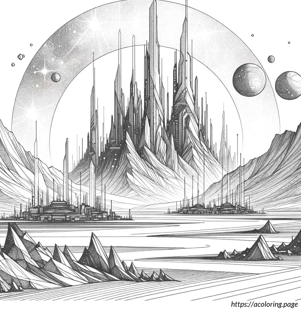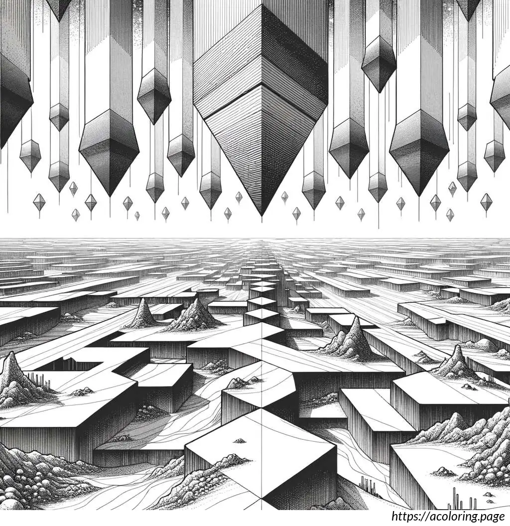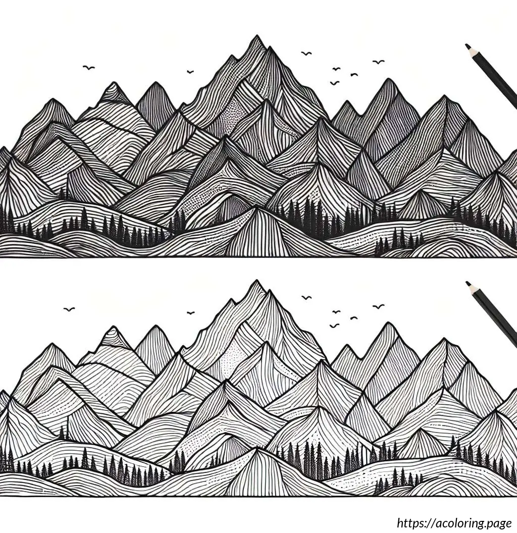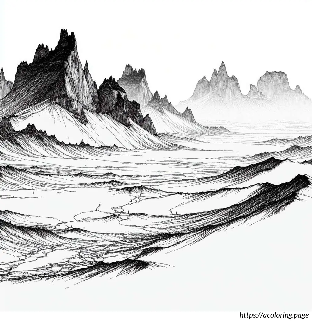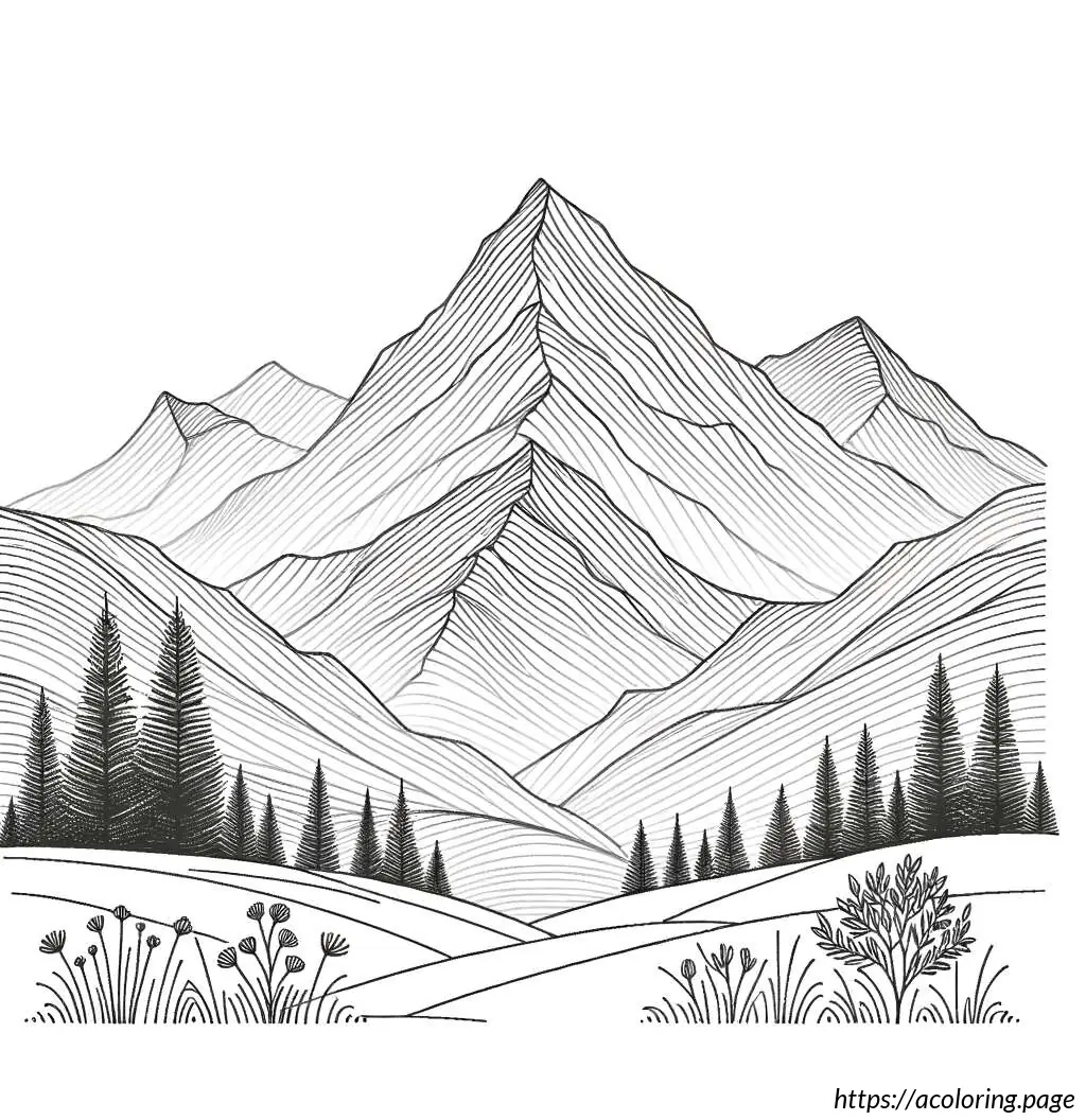 This image is a simple line drawing that depicts a mountainous landscape. It features a range of triangular and jagged mountain peaks, differing in size and perspective, creating a sense of depth. Some smaller triangular shapes at the base of these mountains resemble trees. The foreground includes lines that suggest a plain or a valley leading up to these mountains. There are also angular forms that might represent distant hills or additional geographical features in the background. The whole image is composed of black outlines on a white background, giving it a stark, graphic look. This style is common in coloring books or as a minimalist art print.