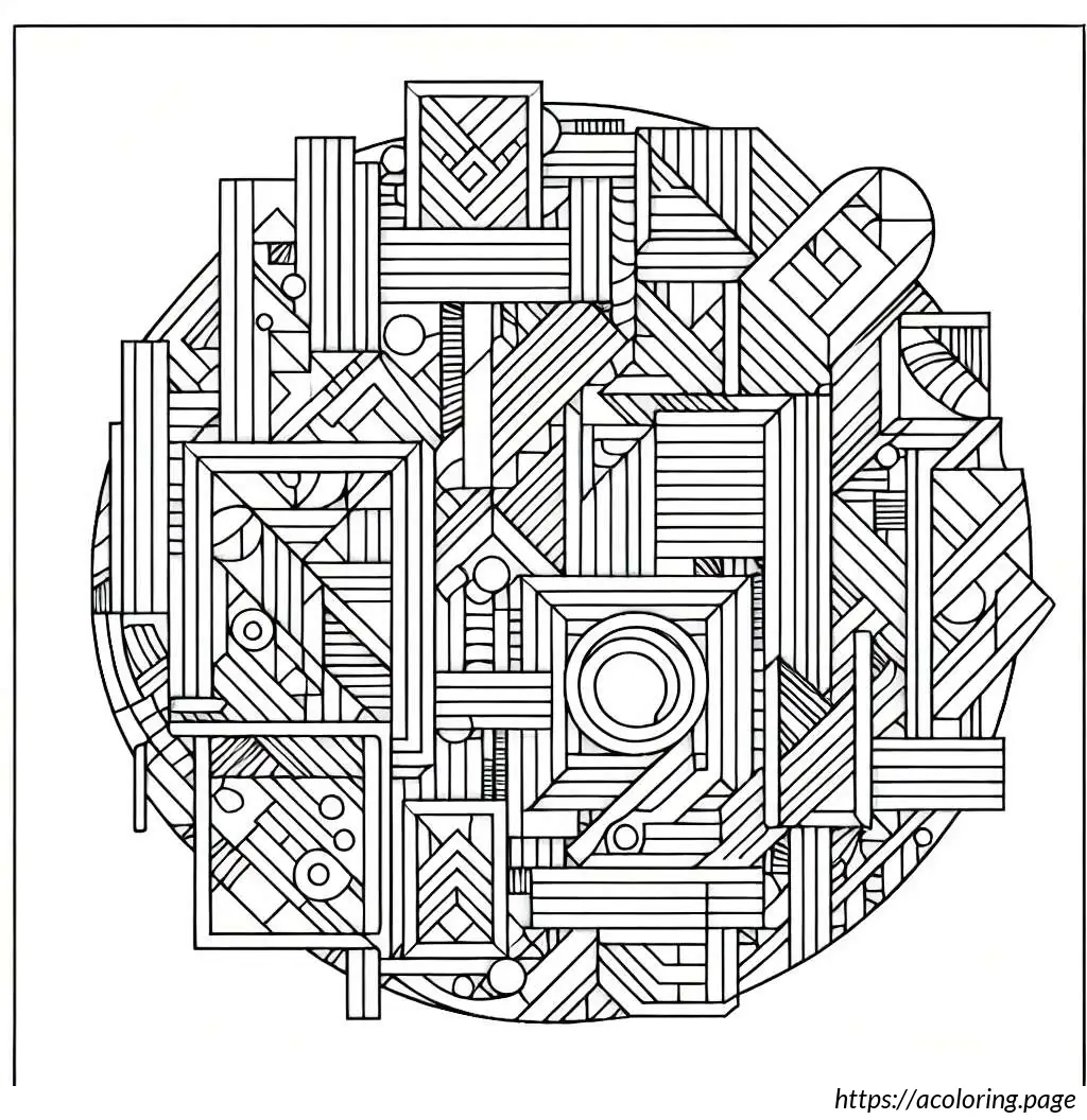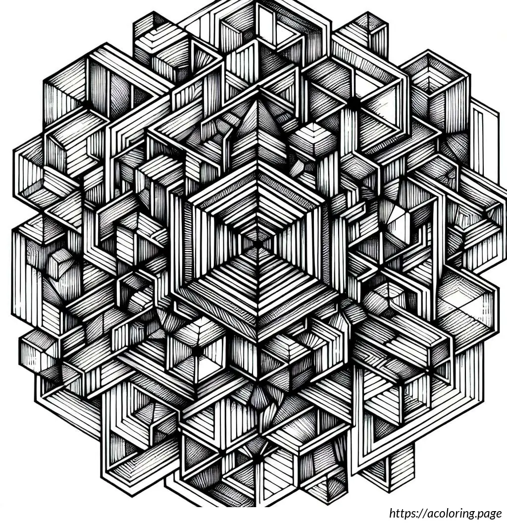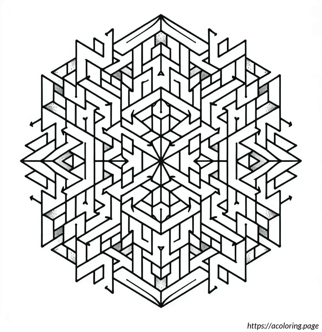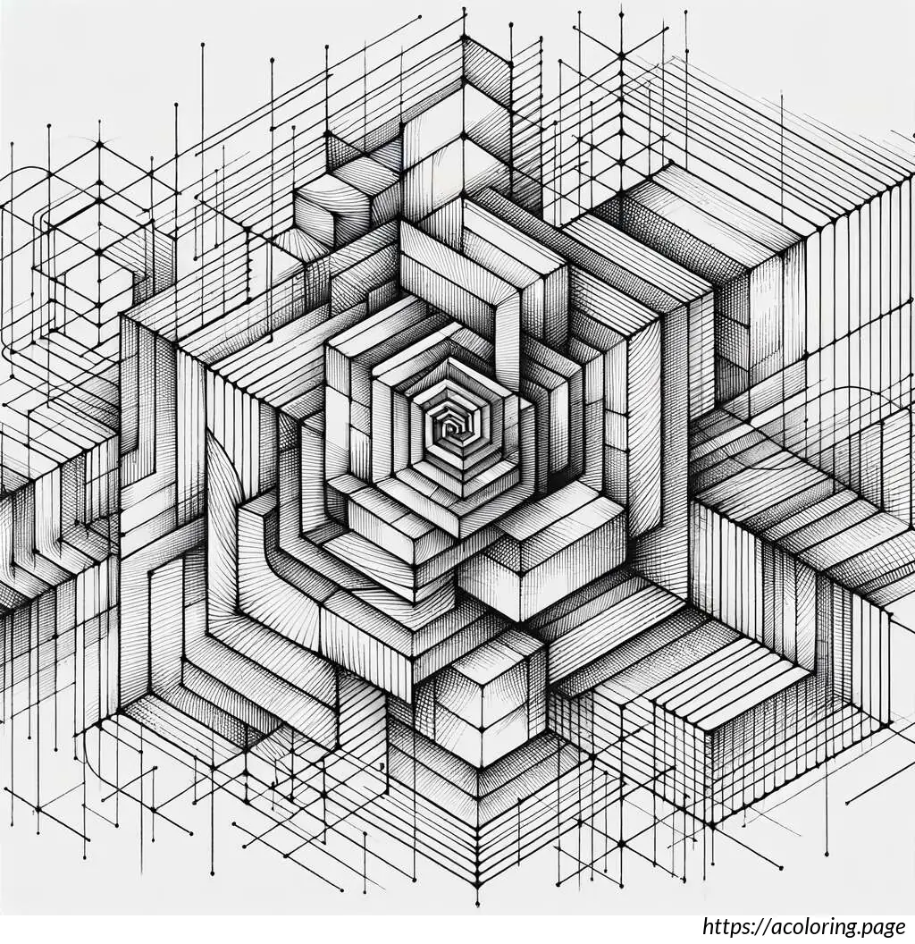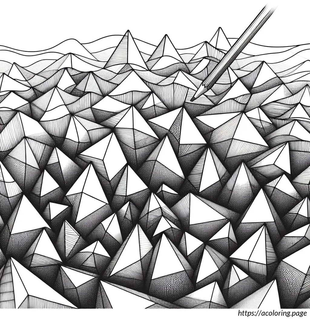 The image features a series of abstract geometric shapes, predominantly in the form of nested, irregular pentagons within which are centered triangles. These shapes vary in size and perspective, creating a sense of depth and a fragmented appearance reminiscent of a kaleidoscope or a complex crystal structure. The lines are bold and black, creating strong contrasts, and each shape is outlined with varying thickness, suggesting shadows and three-dimensionality. The overall composition is intricate and appears non-representational, inviting the viewer to interpret the repetitive yet varying forms.