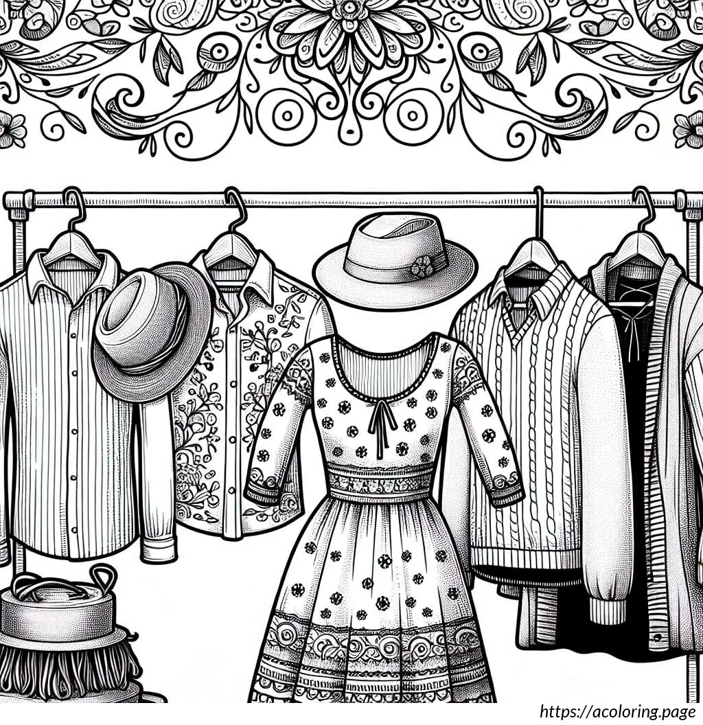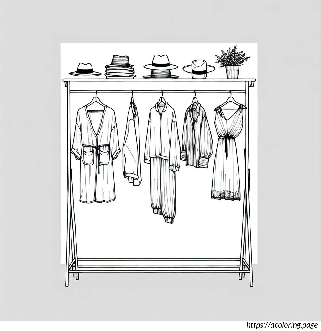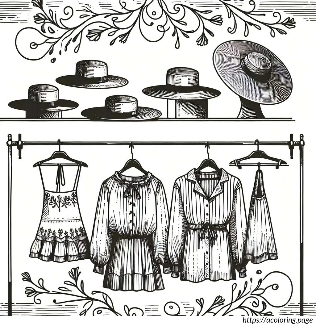 The clothes have simple patterns and look casual, and the hats add a stylish touch to the assortment. The drawing has clean lines, suitable for coloring or other educational purposes in teaching about different types of clothes and apparel.