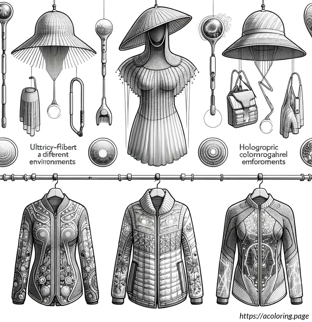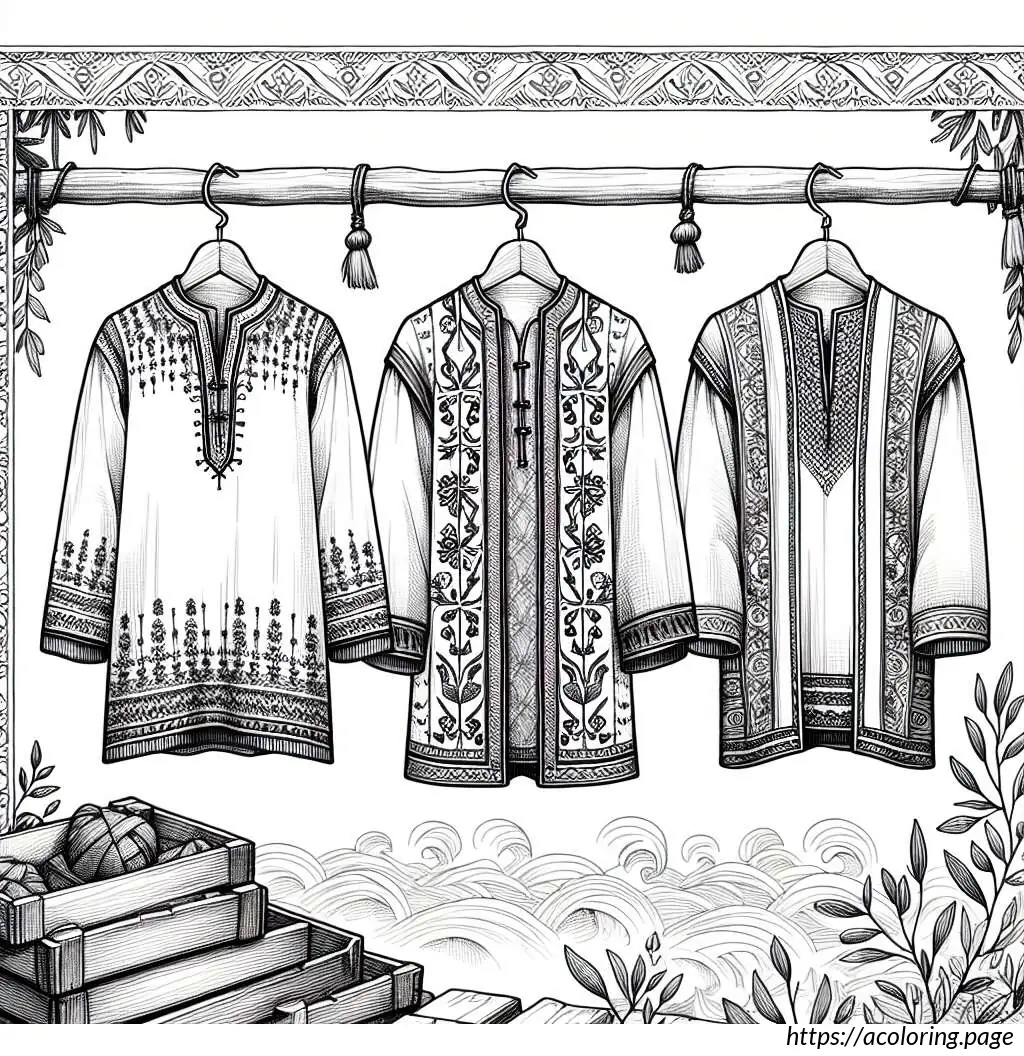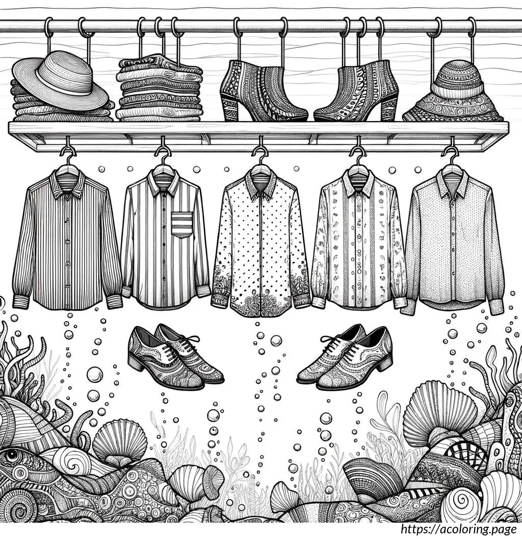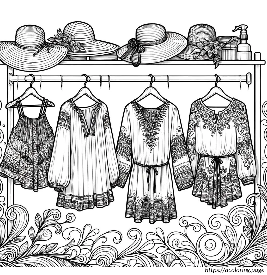 The clothes have simple patterns and look casual, and the hats add a stylish touch to the assortment. The drawing has clean lines, suitable for coloring or other educational purposes in teaching about different types of clothes and apparel.