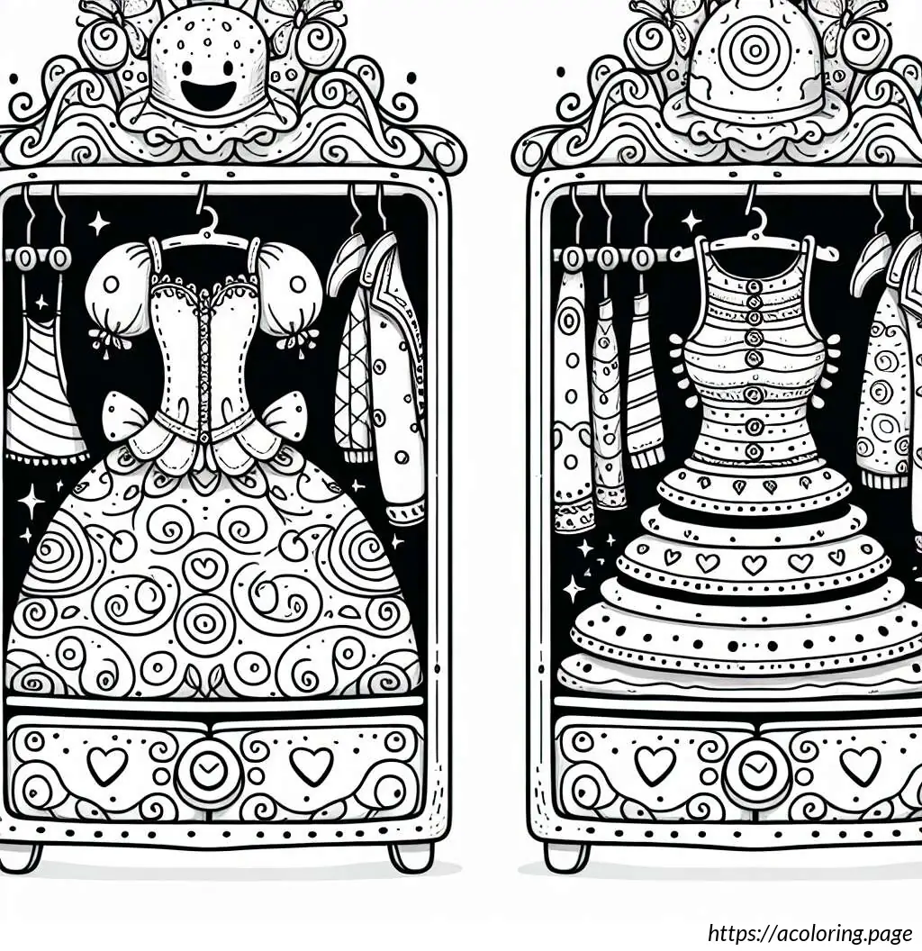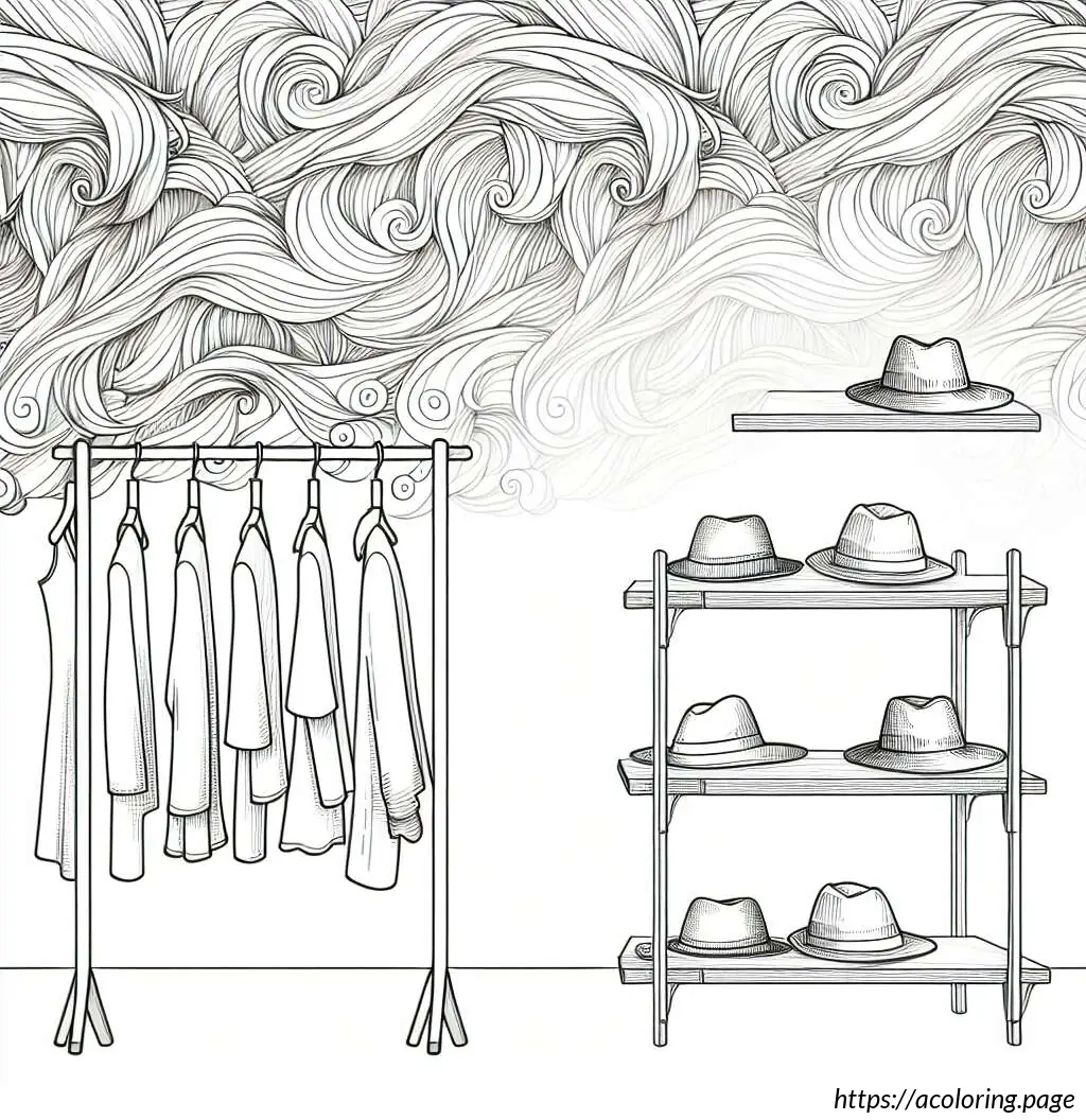 This image features a black and white illustration of various clothes and hats displayed on shelves and hanging from hangers. The top of the image shows a decorative border with swirl patterns. Below it, there are two shelves. The topmost shelf displays two hats, one taller and cylindrical, the other wider and sloping. The shelf below features three pieces of clothing: