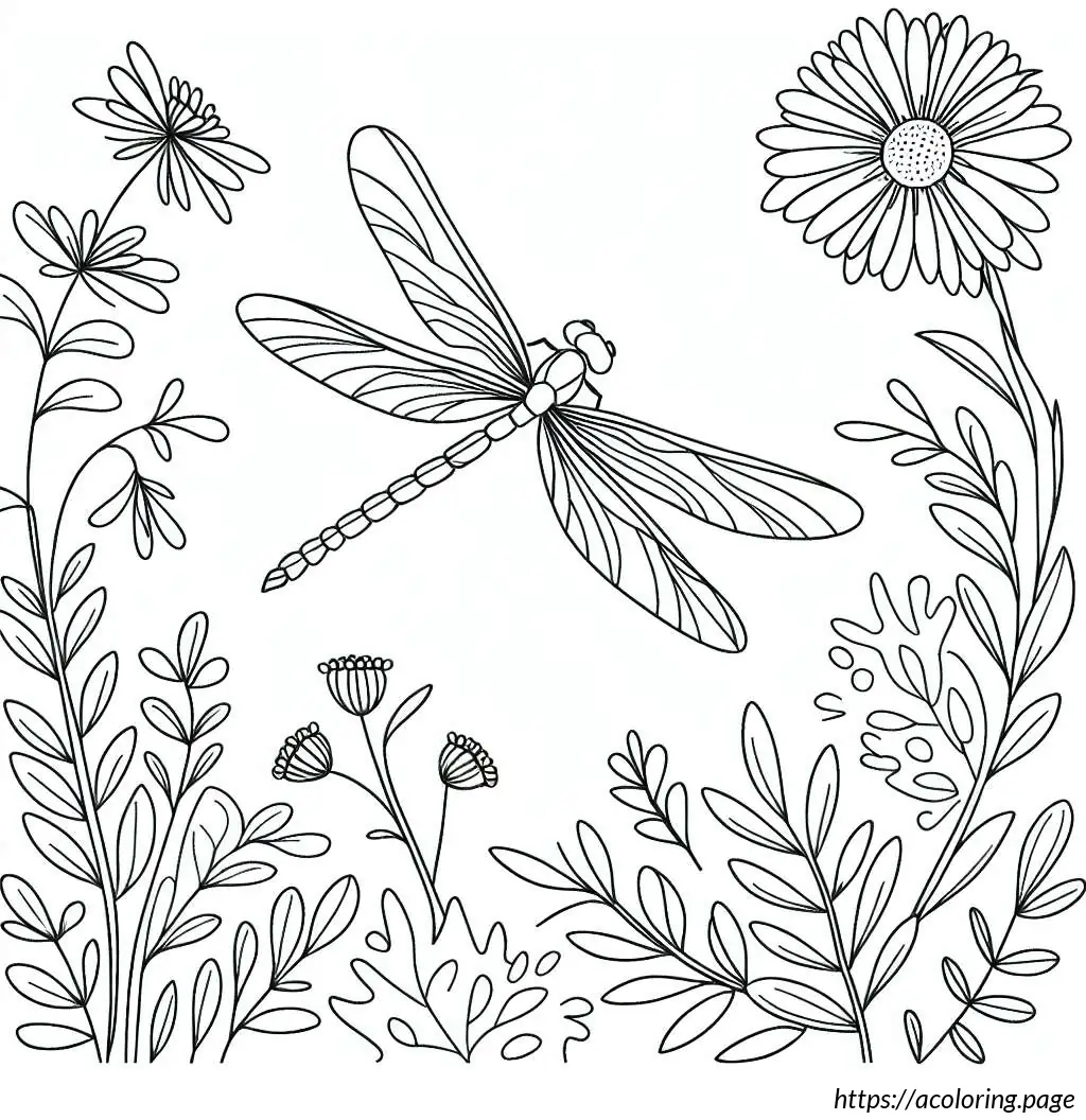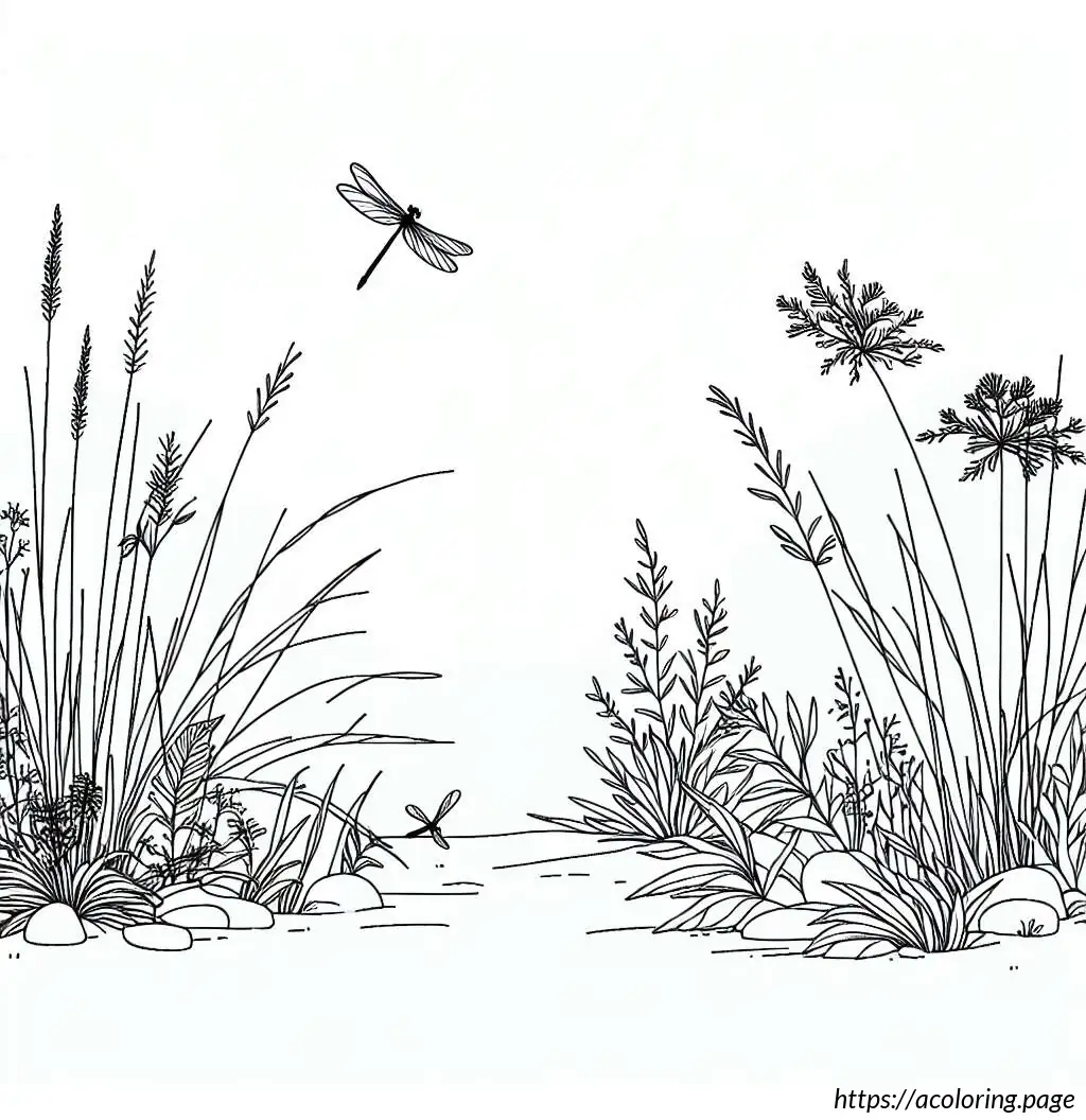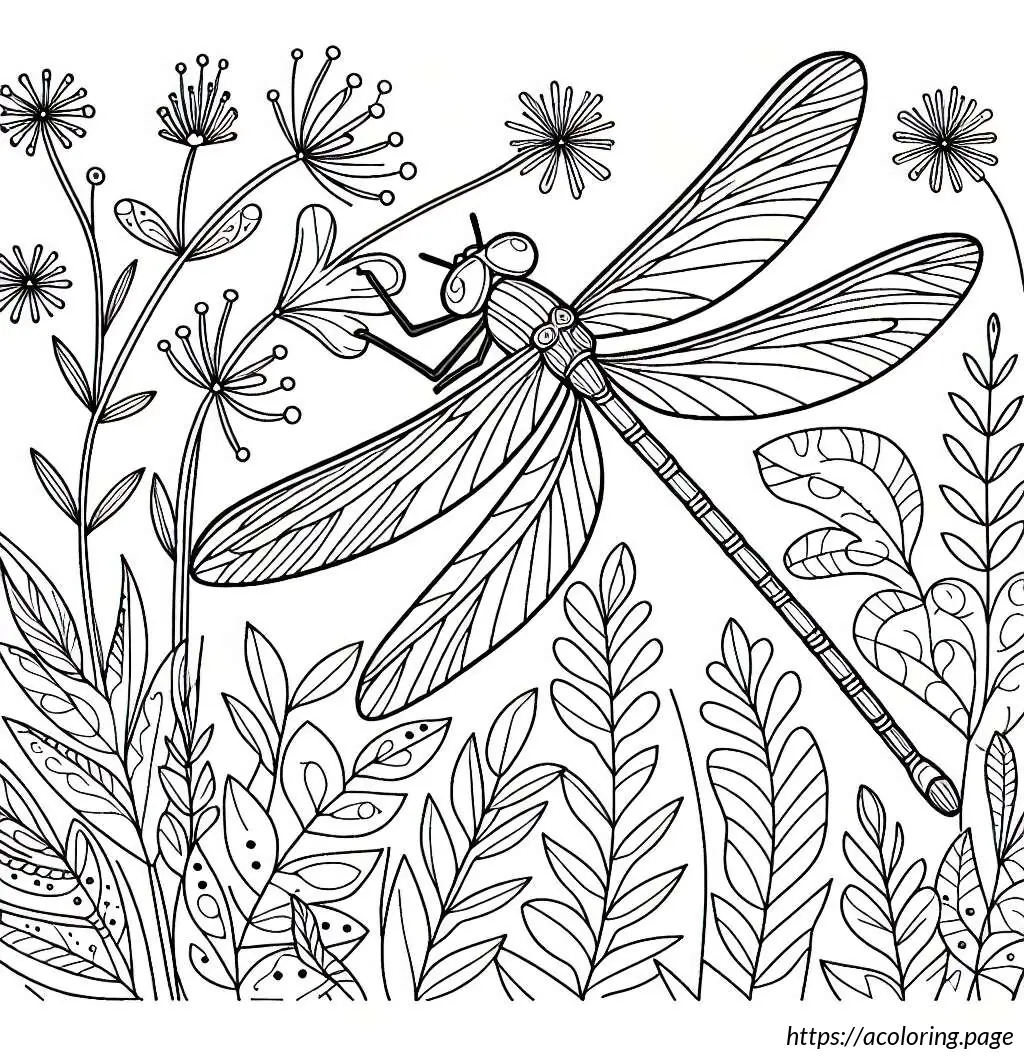 The image is a black and white line drawing that shows a scene in a natural environment, focusing on plant and insect life. It depicts a dragonfly hovering above what appears to be a body of water. The dragonfly is detailed with large, veined wings and a segmented body, typical features that represent its anatomy.