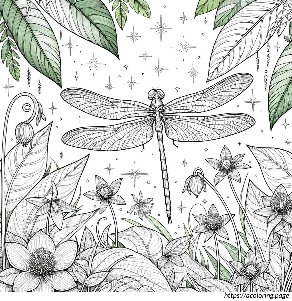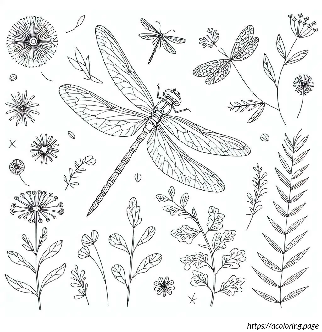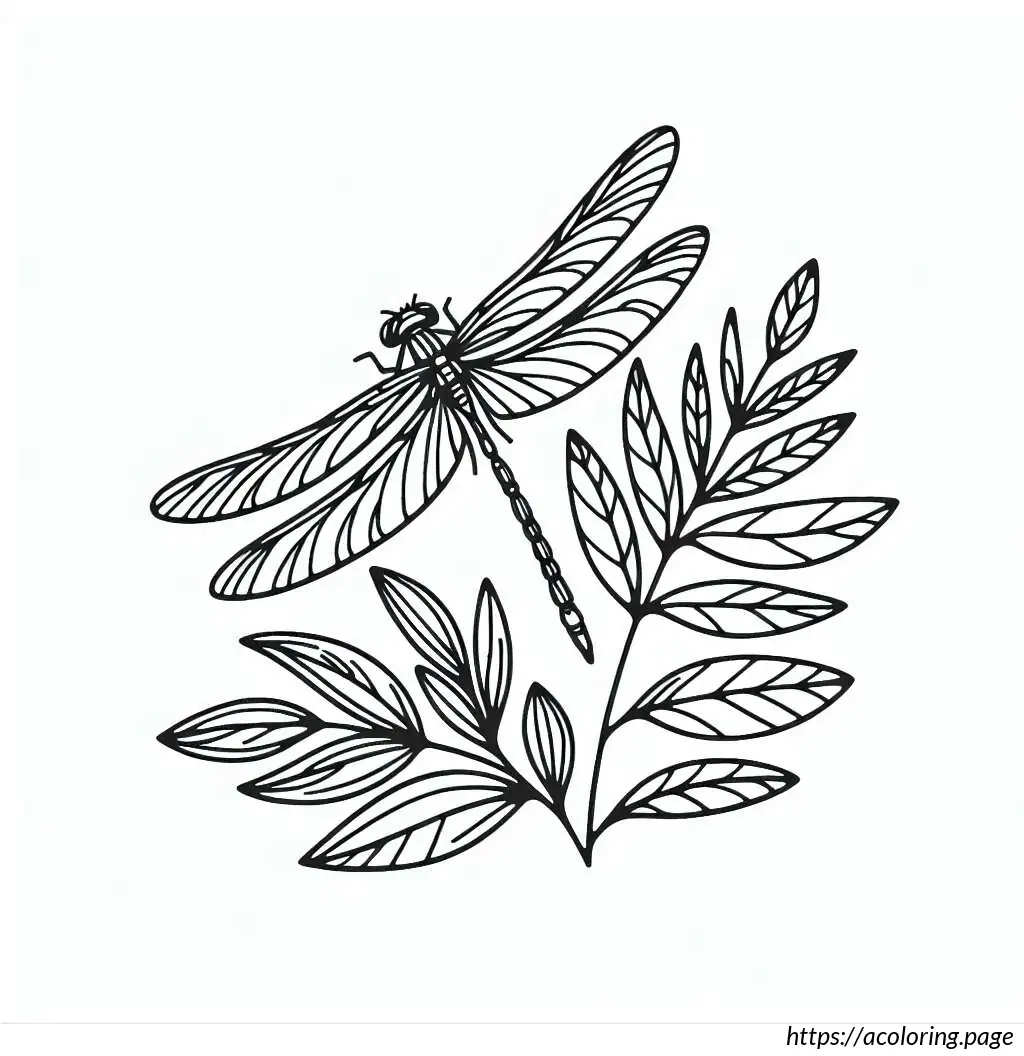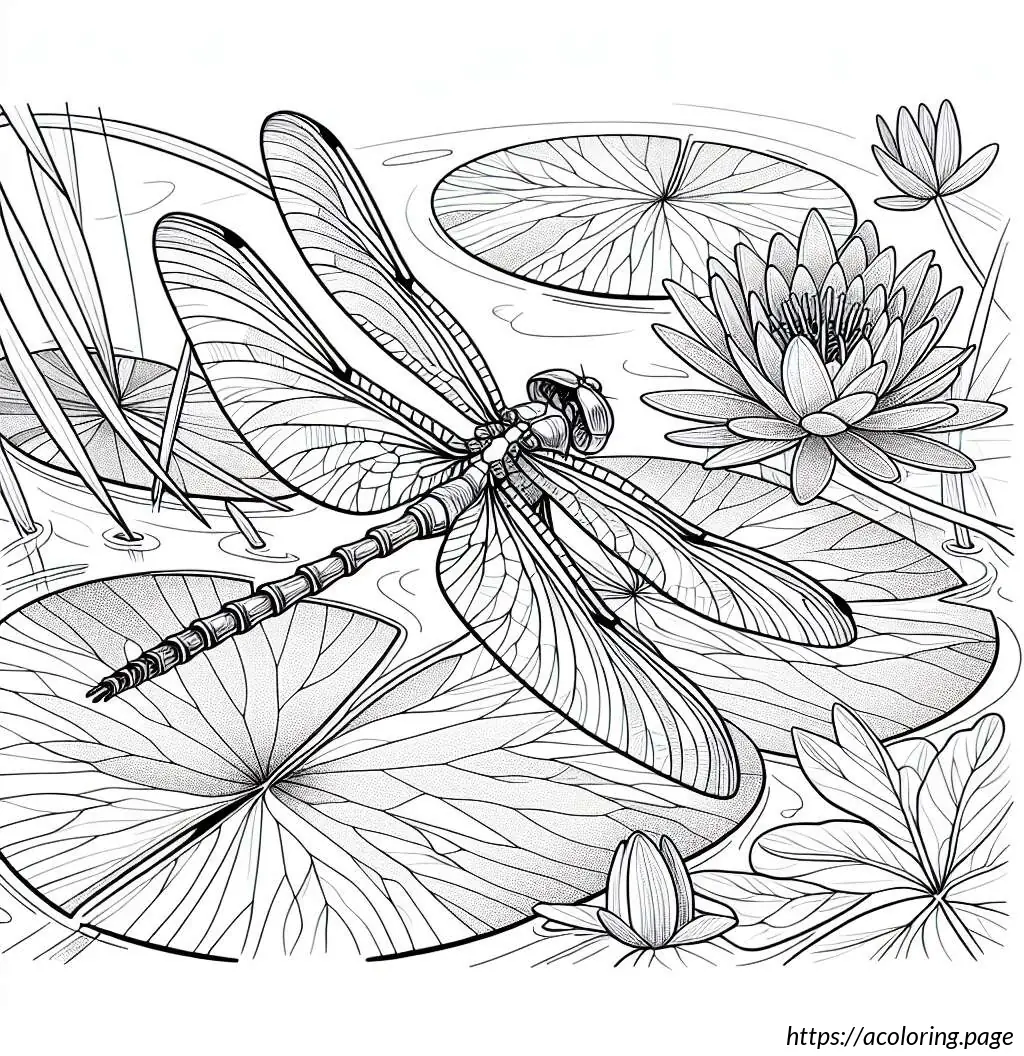 The image is a black and white line drawing that shows a scene in a natural environment, focusing on plant and insect life. It depicts a dragonfly hovering above what appears to be a body of water. The dragonfly is detailed with large, veined wings and a segmented body, typical features that represent its anatomy.