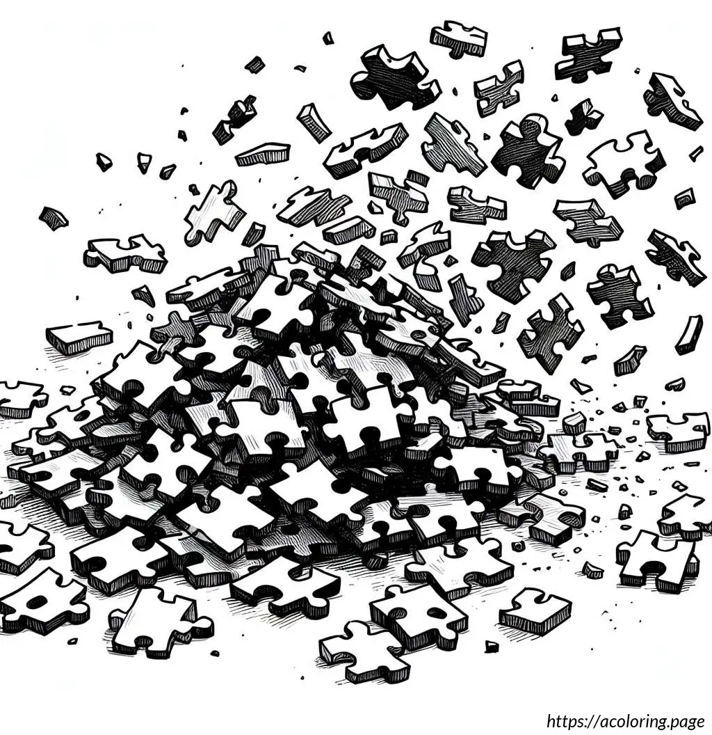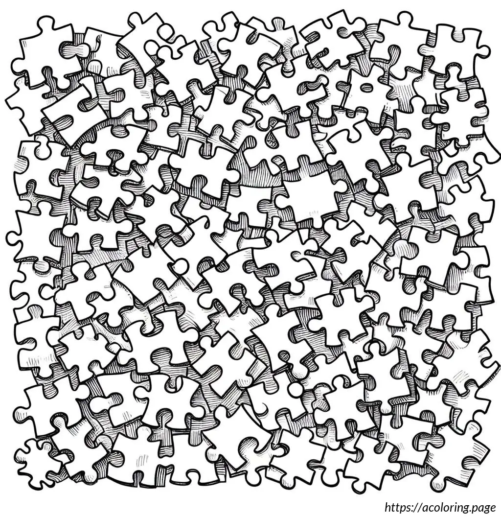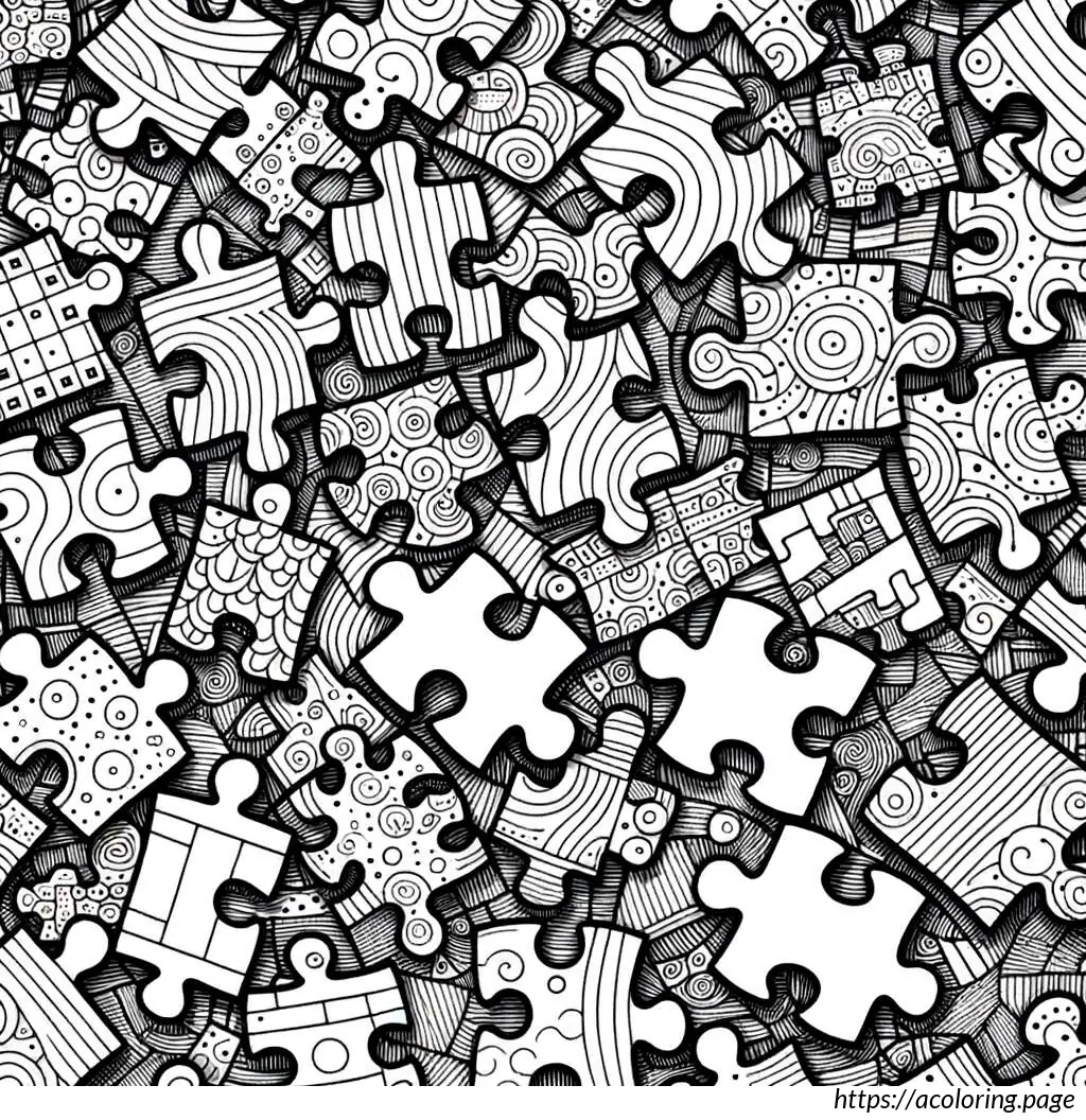 This image is a black and white line drawing of puzzle pieces. The puzzle pieces appear scattered and disconnected, with some overlap and varying orientations. Each piece has unique inner patterns consisting of different simple geometric shapes like squares, triangles, and swirls. The image has a dynamic, somewhat abstract feel, due to the way the pieces are arranged and the diversity in their patterns. The overall composition seems to fill the frame without any clear borders, giving the illusion of a continuous, unbounded puzzle.