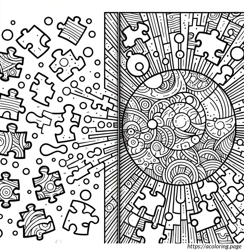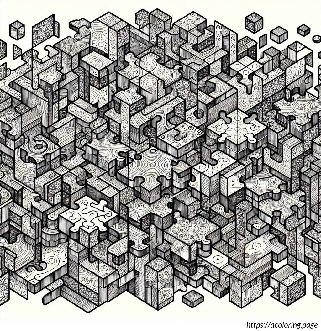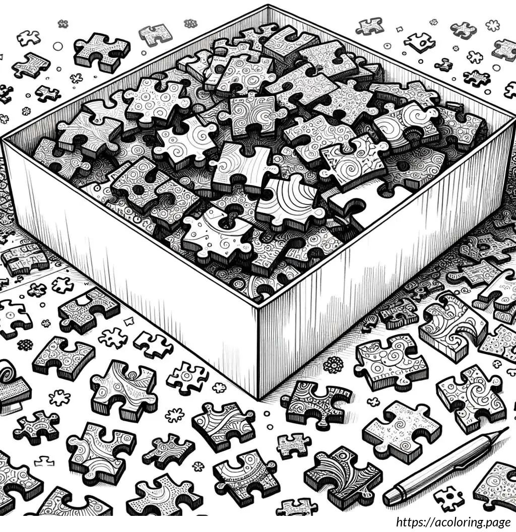 This image is a black and white line drawing of puzzle pieces. The puzzle pieces appear scattered and disconnected, with some overlap and varying orientations. Each piece has unique inner patterns consisting of different simple geometric shapes like squares, triangles, and swirls. The image has a dynamic, somewhat abstract feel, due to the way the pieces are arranged and the diversity in their patterns. The overall composition seems to fill the frame without any clear borders, giving the illusion of a continuous, unbounded puzzle.