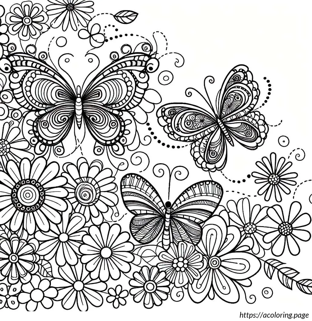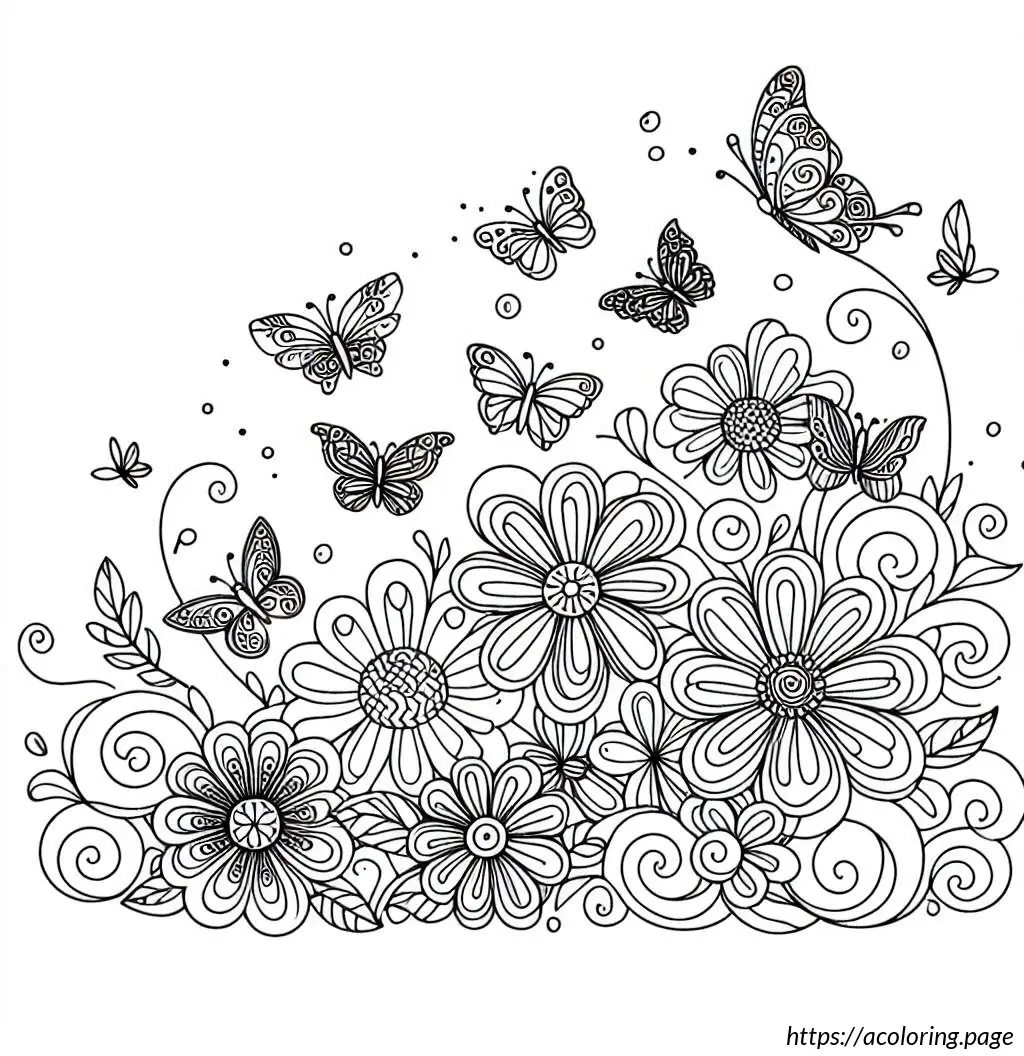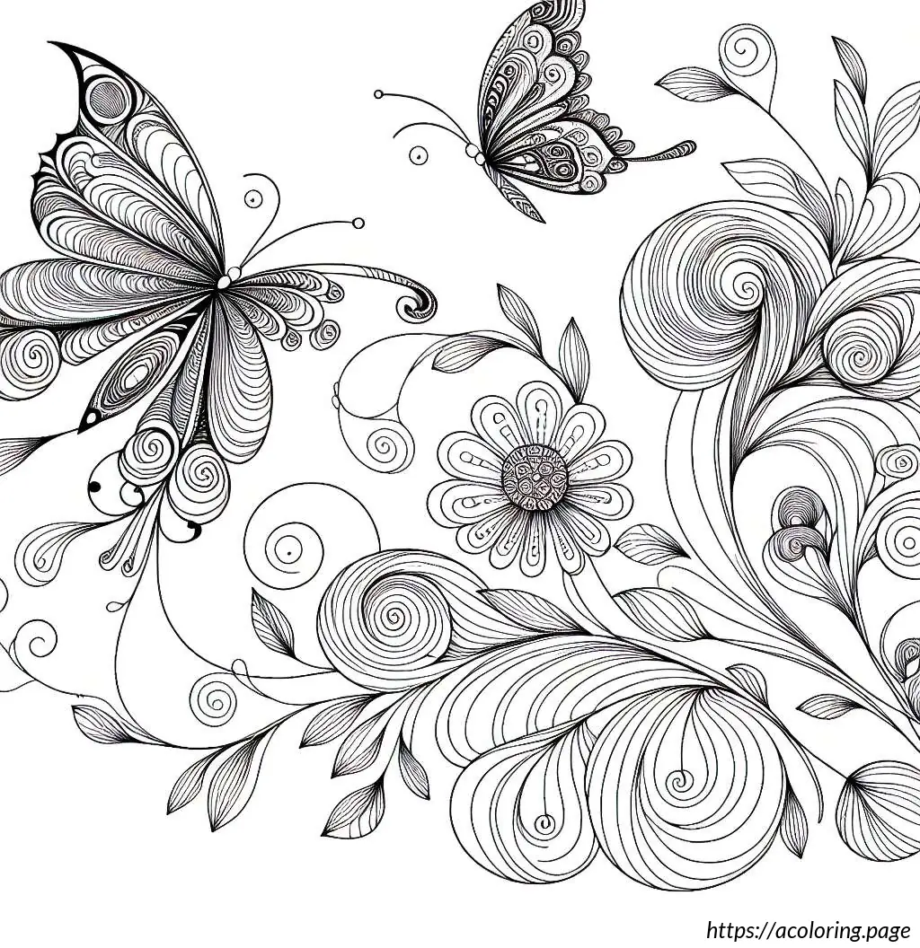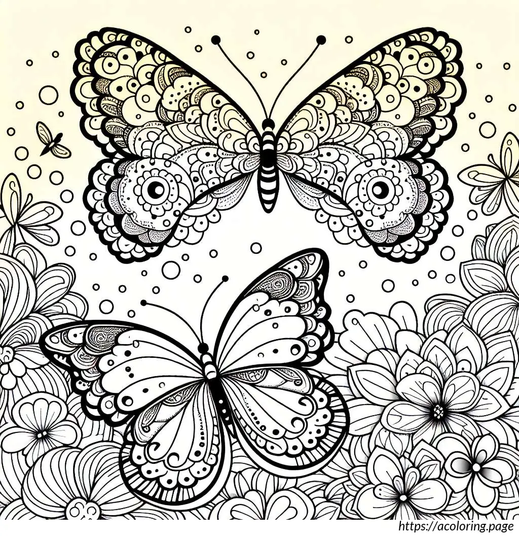 This image is a black and white line drawing suitable for coloring. The composition includes a floral background pattern and two central butterfly figures. The background features several loosely drawn, stylized flowers with spiral patterns at their centers, which adds a whimsical touch. The two butterflies are depicted with various details on their wings—such as striped and dotted patterns—which help to distinguish their segments and add visual interest. Overall, the image is designed in a simplistic and bold outline style, ideal for coloring activities that allow for personalized color choices by the user.