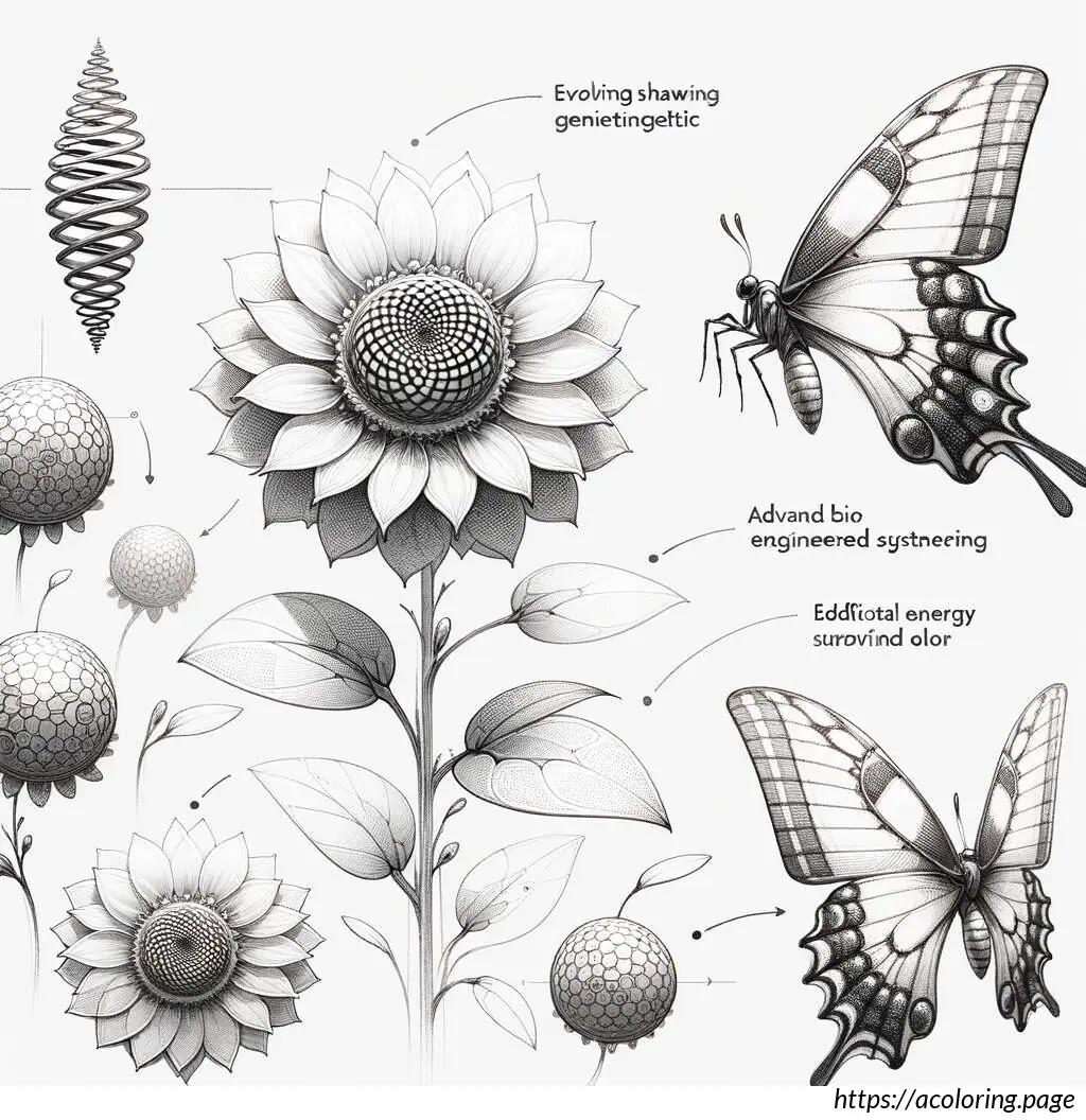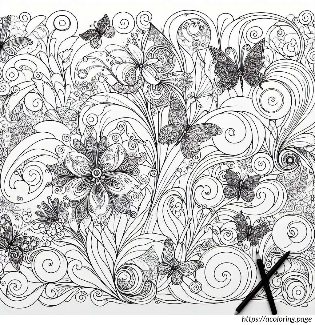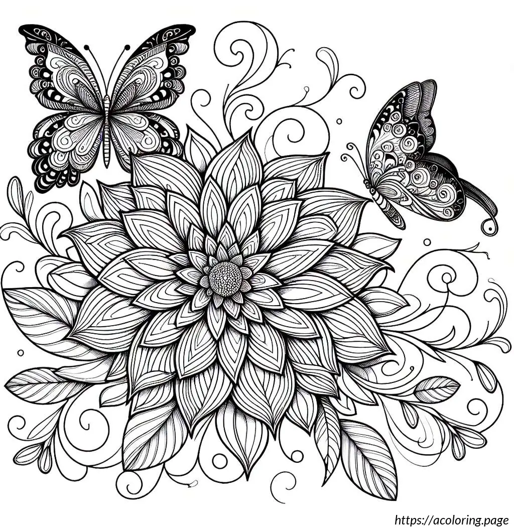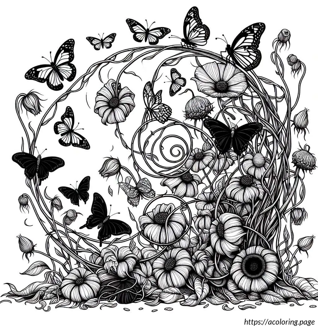 This image is a black and white line drawing suitable for coloring. The composition includes a floral background pattern and two central butterfly figures. The background features several loosely drawn, stylized flowers with spiral patterns at their centers, which adds a whimsical touch. The two butterflies are depicted with various details on their wings—such as striped and dotted patterns—which help to distinguish their segments and add visual interest. Overall, the image is designed in a simplistic and bold outline style, ideal for coloring activities that allow for personalized color choices by the user.