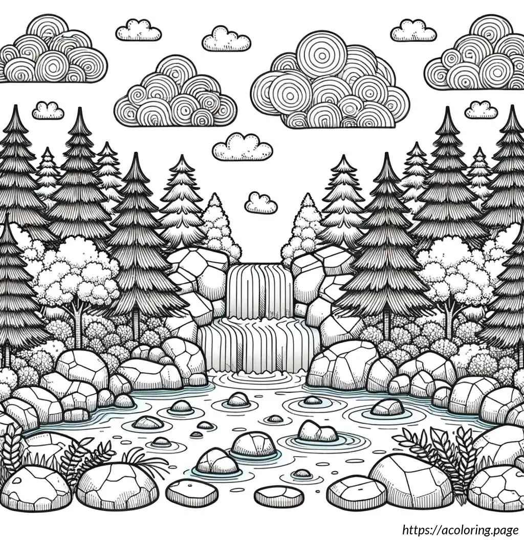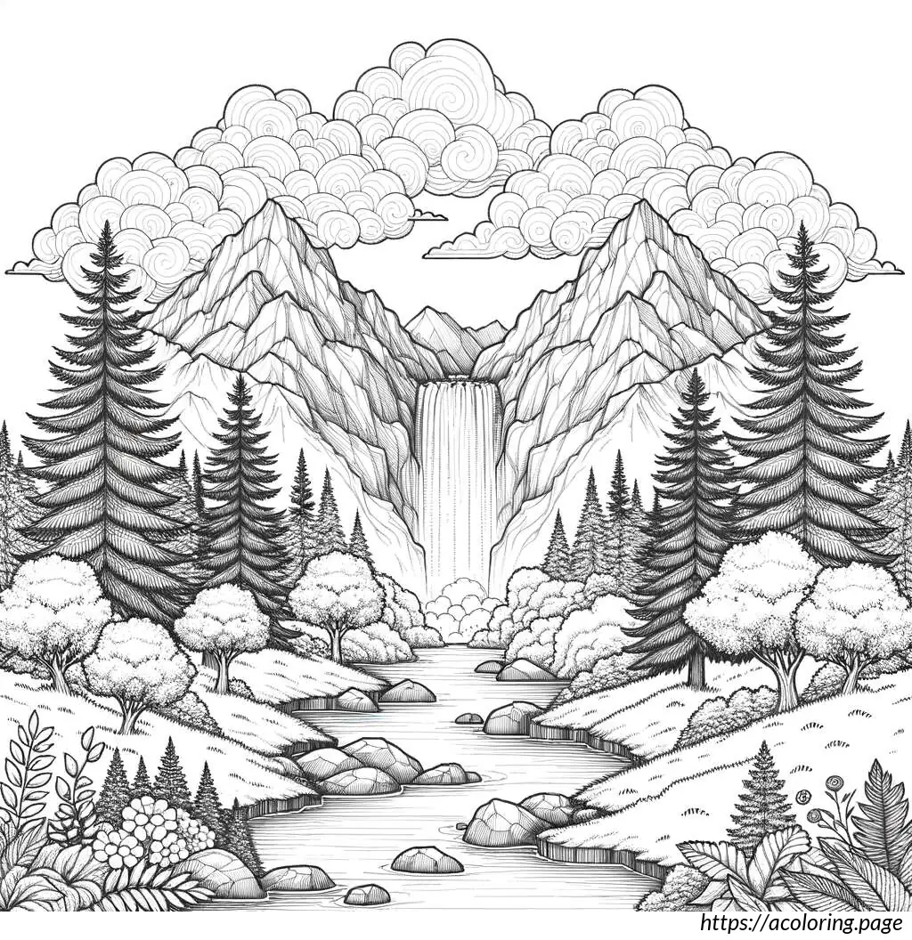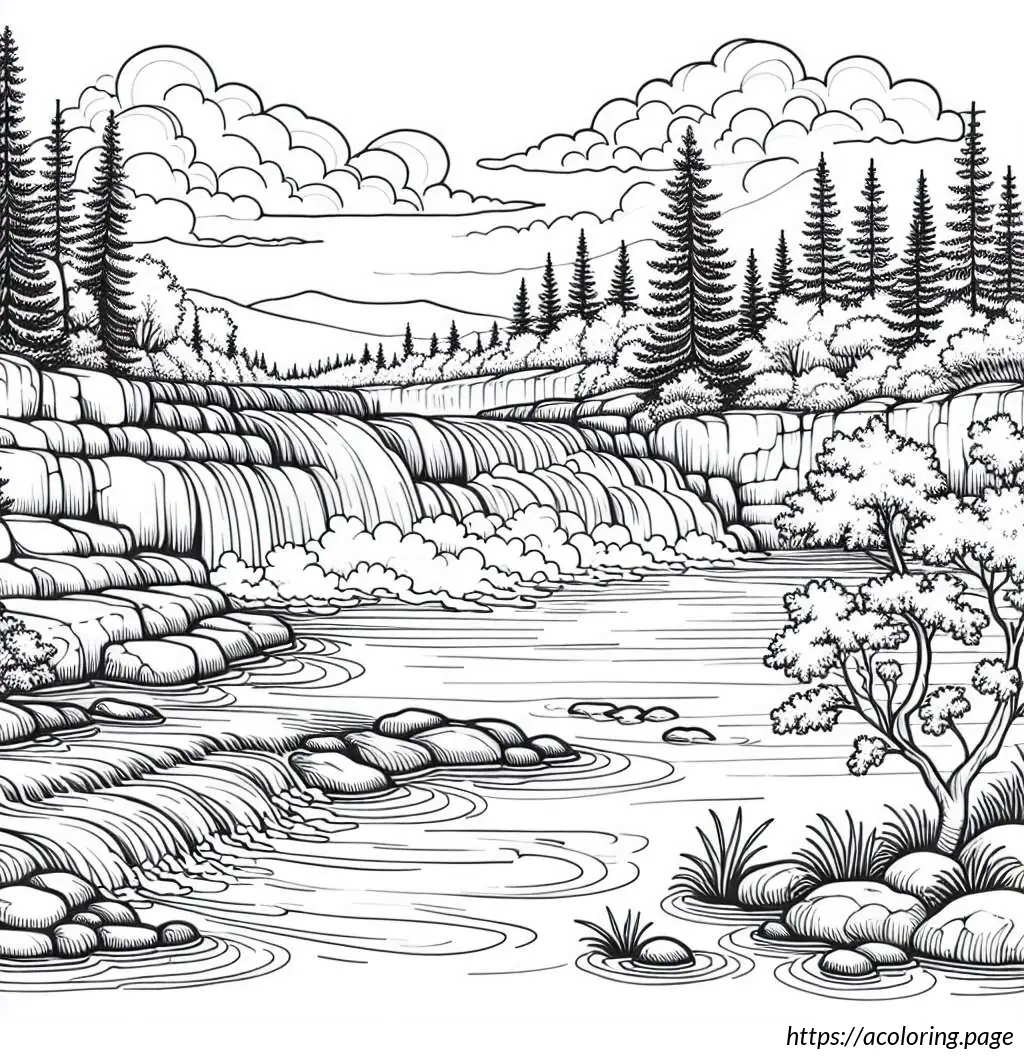 Waterfall and River: Toward the middle and left portion of the image, there is a waterfall cascading down into a flowing river, which winds through the scene with several small pools depicted along its course.