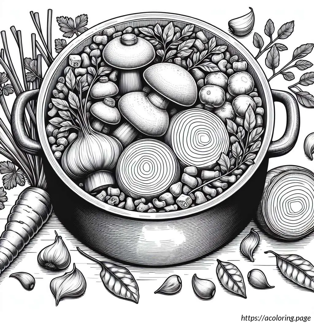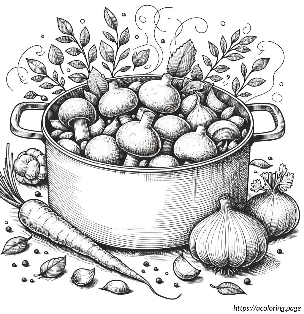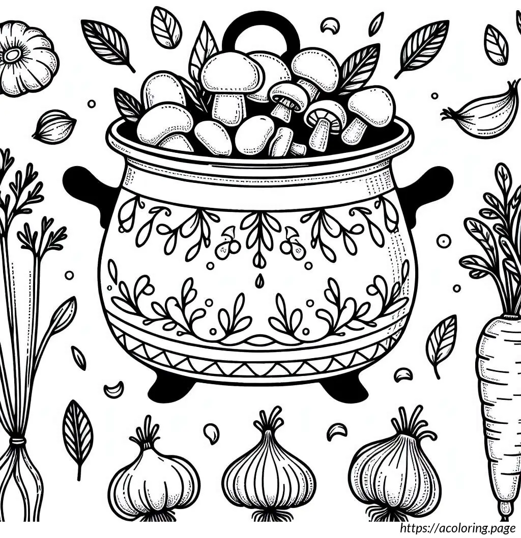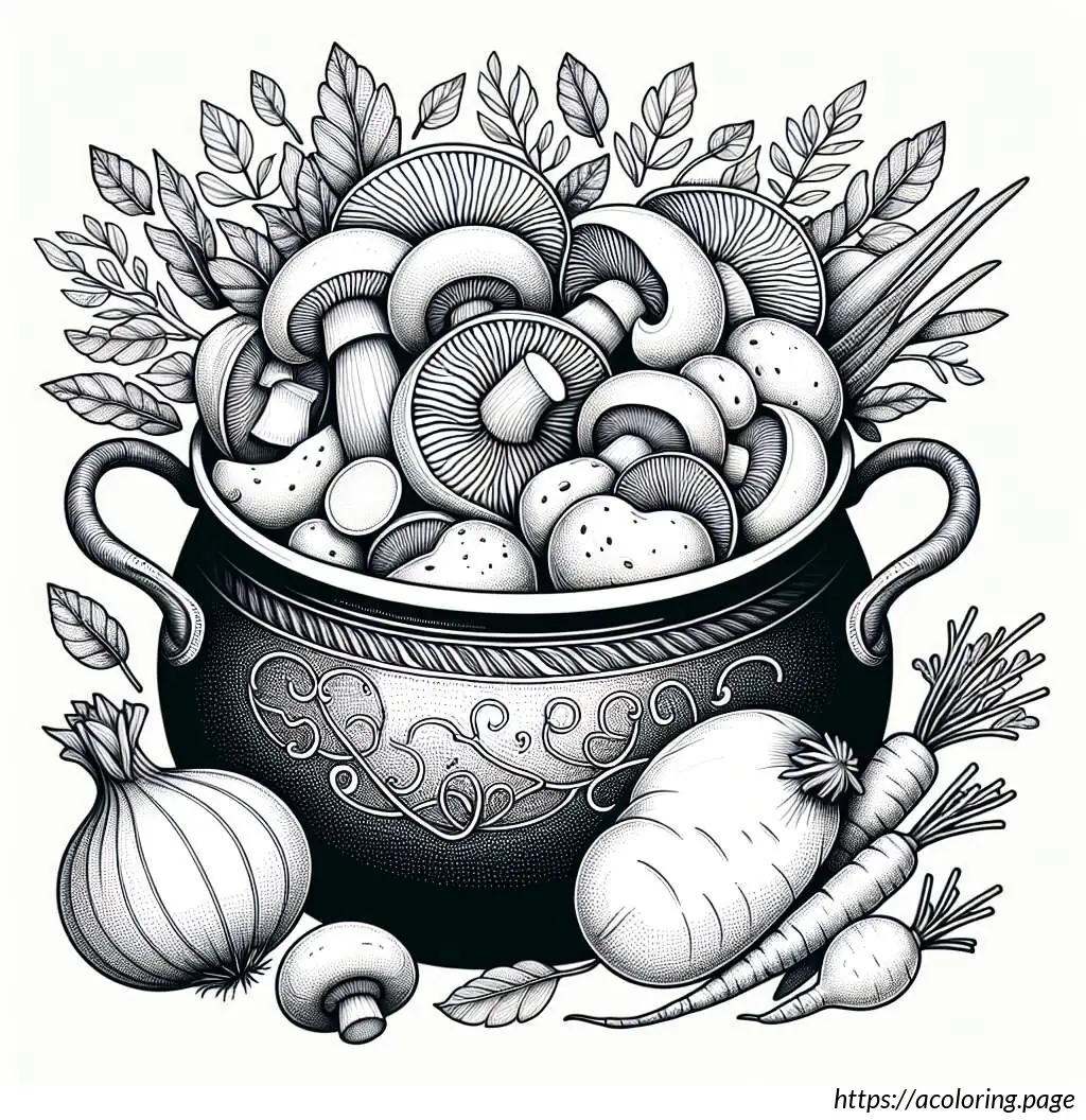 The image is a black and white illustration of a pot filled with a variety of vegetables. The pot itself is stylized with handles and an intricate rim. Inside the pot, there are several distinct layers of vegetables. At the top, we see whole mushrooms with detailed gills. Below the layer of mushrooms, there are slices of mushrooms interspersed with chunks of possibly potatoes, and rounded vegetable slices that could be onions. At the edges of the image, outside the pot, there are additional vegetables depicted for added context: a carrot with leaves at the left side and an onion at the bottom left. There are also several leaves scattered at the bottom right, which could indicate herbs or additional garnishments. The drawing is detailed, emphasizing the textures of the vegetables, making it particularly suitable for coloring activities or educational purposes.