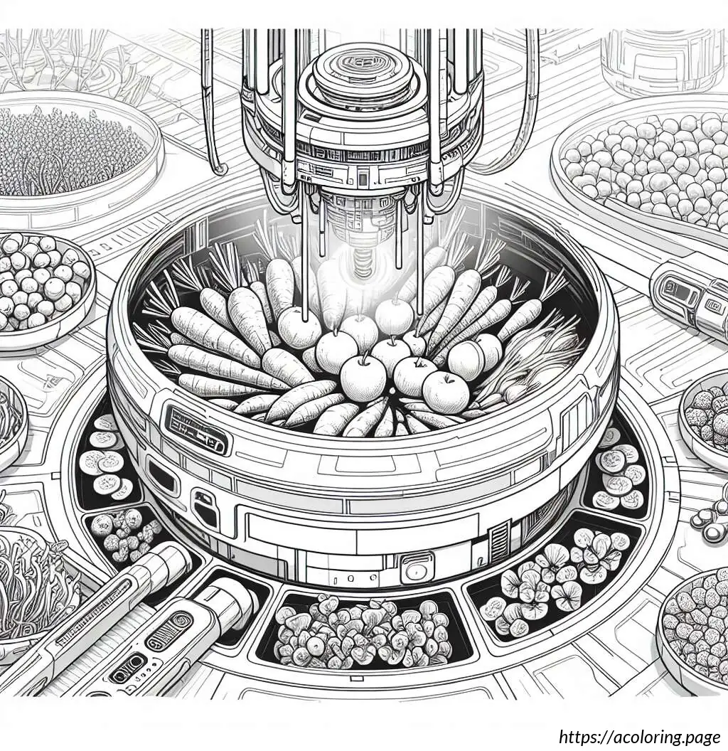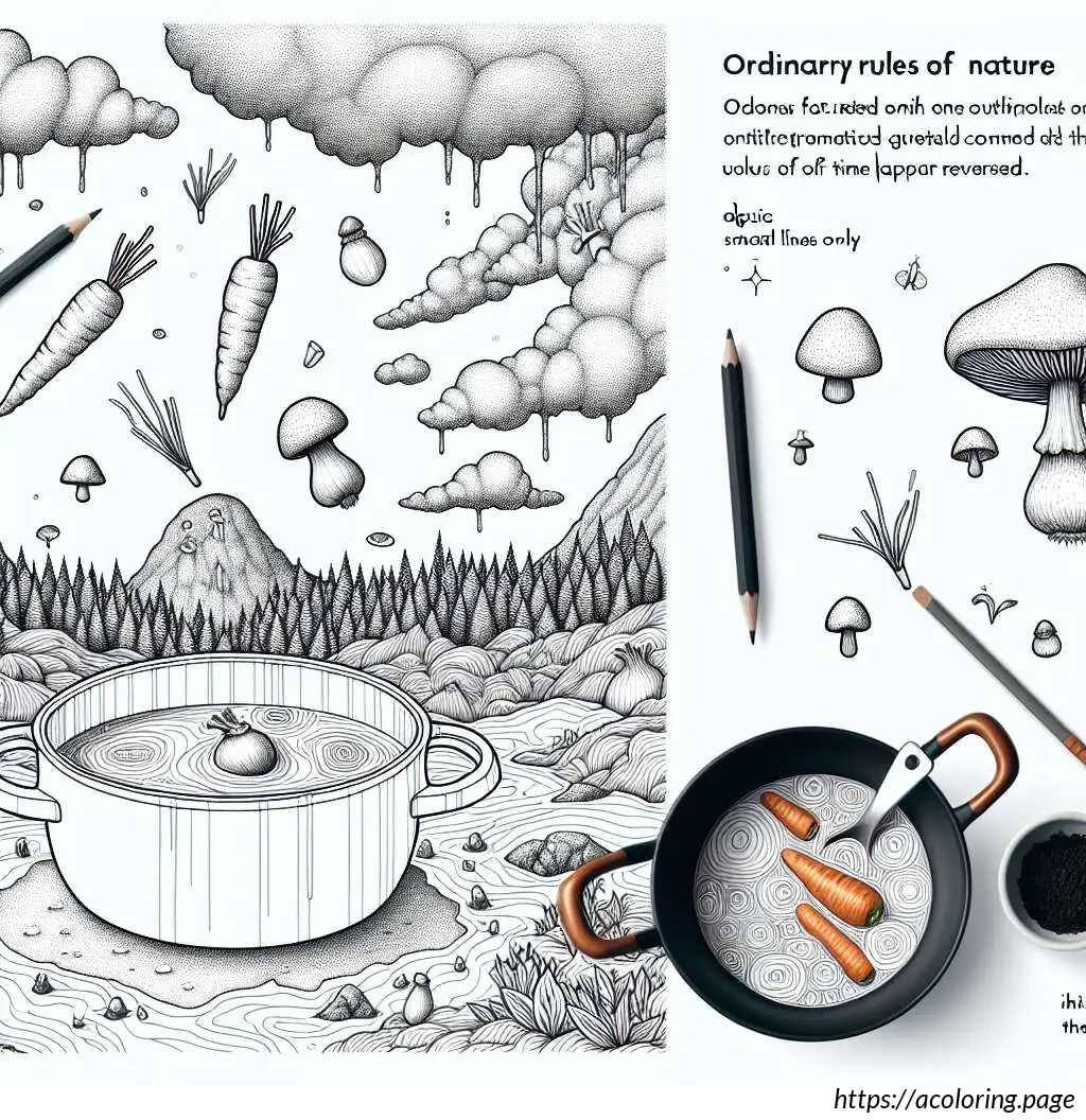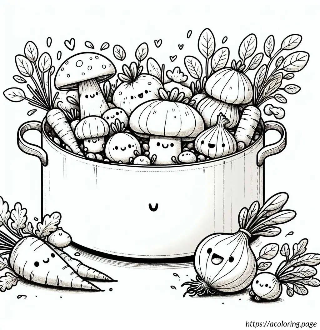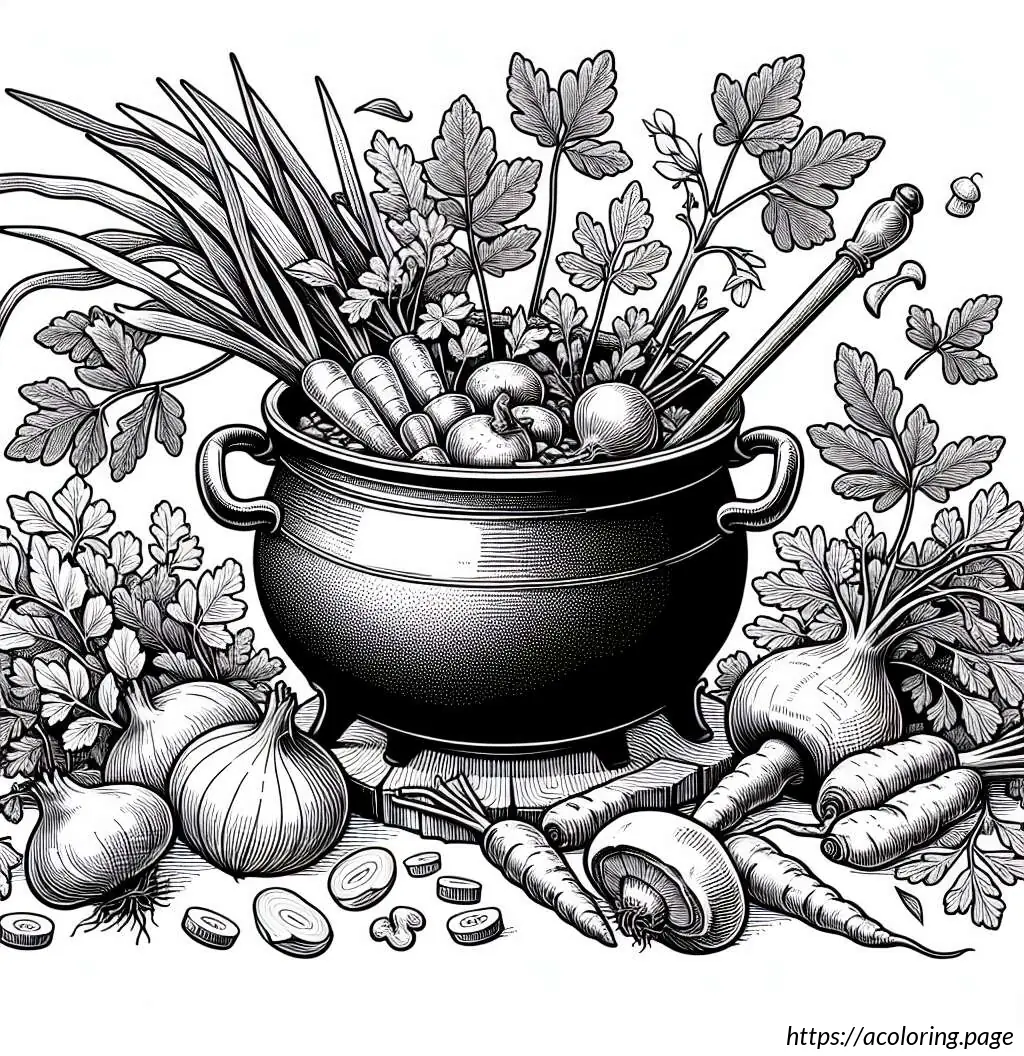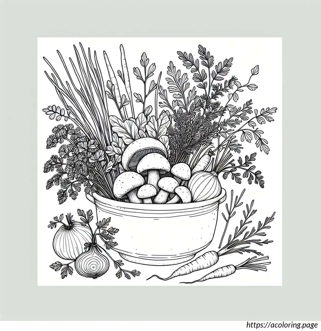 The image is a black and white illustration of a pot filled with a variety of vegetables. The pot itself is stylized with handles and an intricate rim. Inside the pot, there are several distinct layers of vegetables. At the top, we see whole mushrooms with detailed gills. Below the layer of mushrooms, there are slices of mushrooms interspersed with chunks of possibly potatoes, and rounded vegetable slices that could be onions. At the edges of the image, outside the pot, there are additional vegetables depicted for added context: a carrot with leaves at the left side and an onion at the bottom left. There are also several leaves scattered at the bottom right, which could indicate herbs or additional garnishments. The drawing is detailed, emphasizing the textures of the vegetables, making it particularly suitable for coloring activities or educational purposes.
