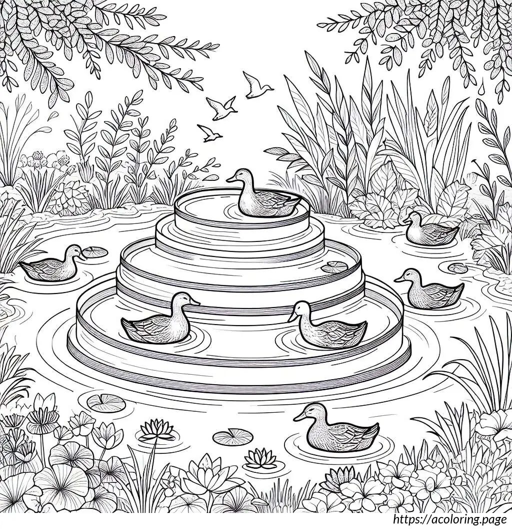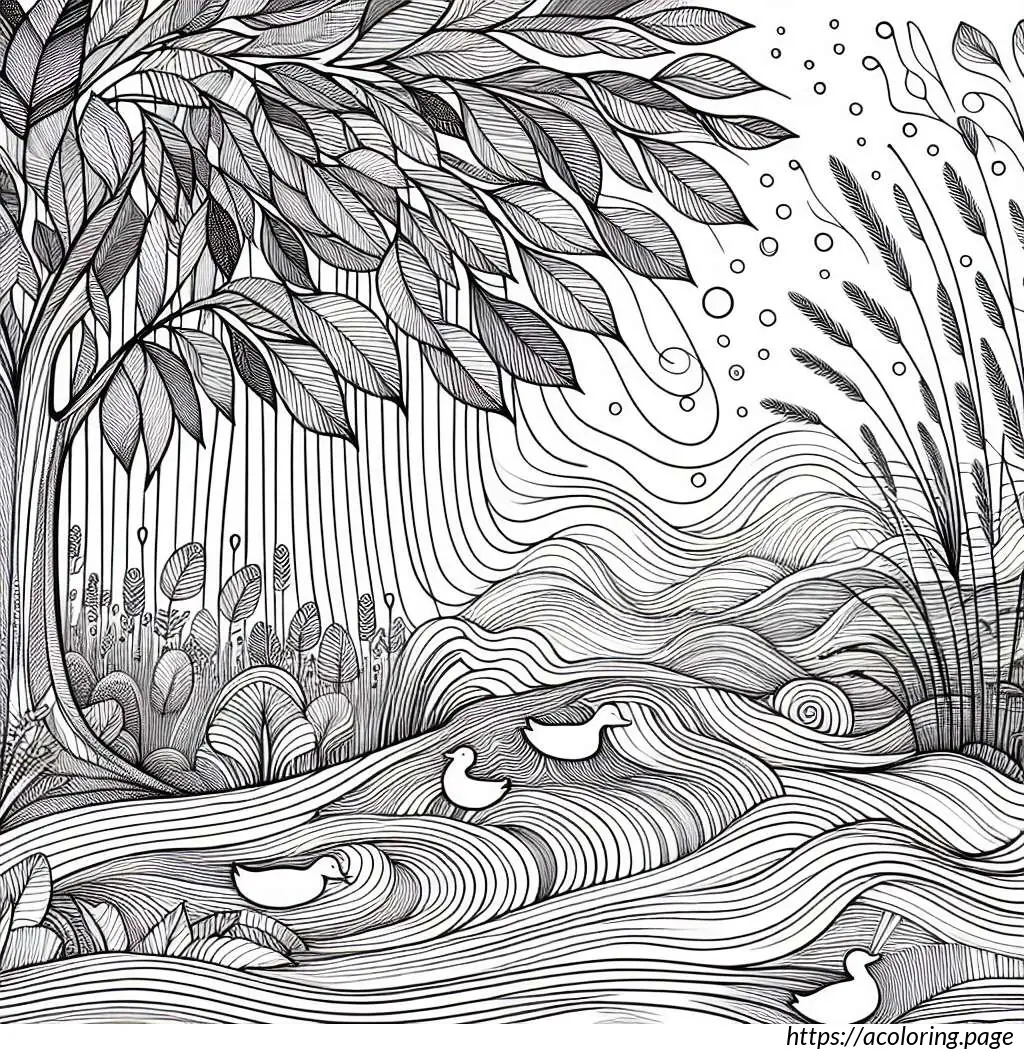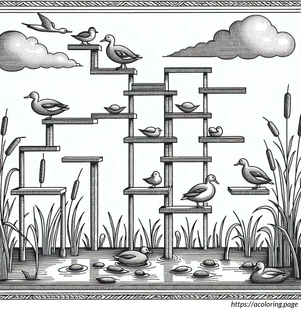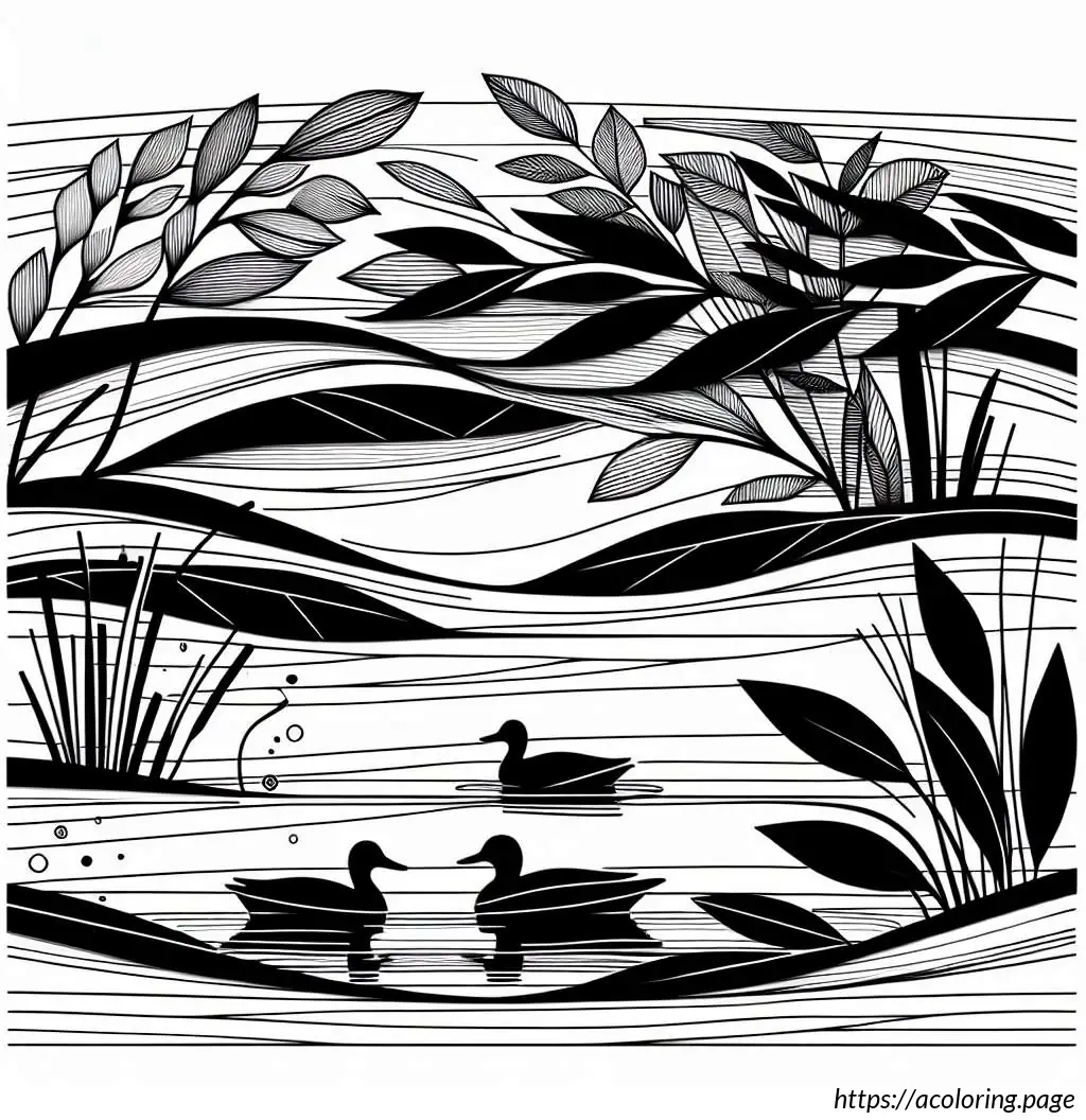 The image features a stylized, line-drawn depiction of a landscape with multiple layers and elements. At the top of the image, there are abstract shapes resembling leaves. Below these shapes, there are waving lines suggestive of grass or underwater plants. Central in the image are various body of water layers depicted by wavy, horizontal lines. Within these water-like layers, simple, line-drawn ducks are placed, floating tranquilly. The ducks vary slightly in shape and orientation, which adds a dynamic aspect to the scene. At the bottom of the image, a stair-like structure leads downwards, bordered by vertical lines that might represent either walls or more plant-like forms. The entire drawing is minimalist, using only lines without any shading or color, which emphasizes its abstract and tranquil nature.