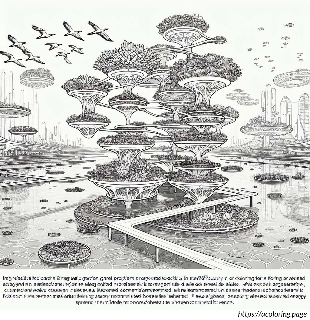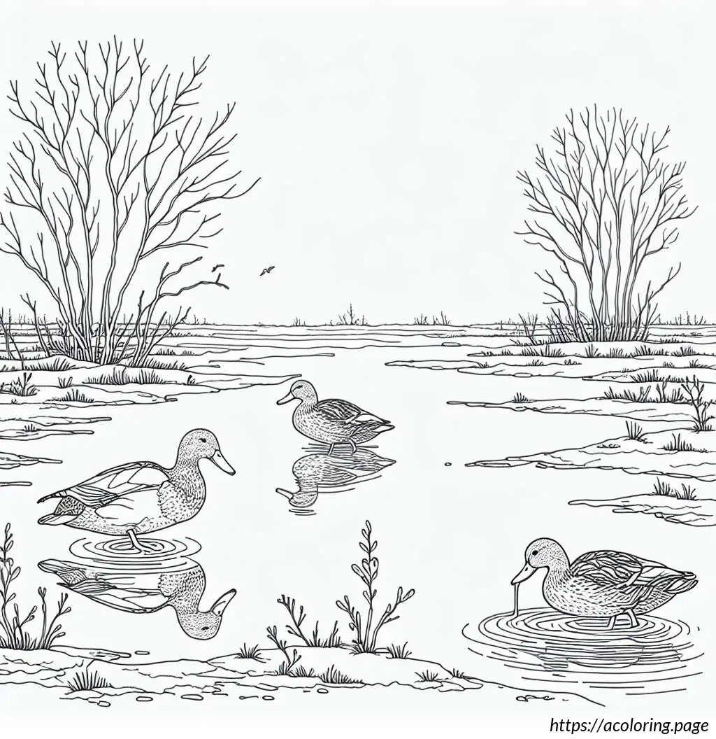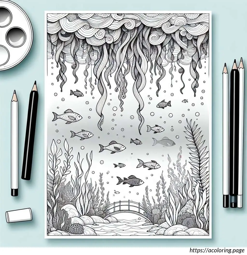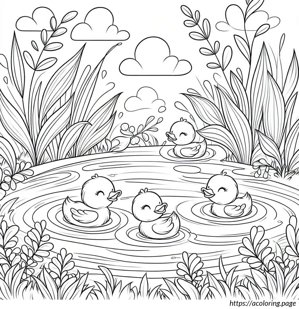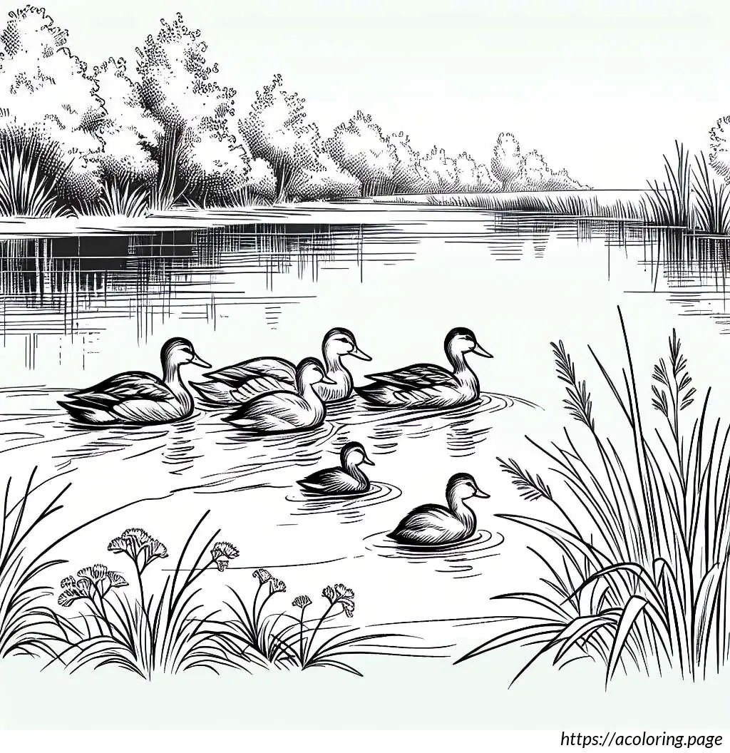The image features a stylized, line-drawn depiction of a landscape with multiple layers and elements. At the top of the image, there are abstract shapes resembling leaves. Below these shapes, there are waving lines suggestive of grass or underwater plants. Central in the image are various body of water layers depicted by wavy, horizontal lines. Within these water-like layers, simple, line-drawn ducks are placed, floating tranquilly. The ducks vary slightly in shape and orientation, which adds a dynamic aspect to the scene. At the bottom of the image, a stair-like structure leads downwards, bordered by vertical lines that might represent either walls or more plant-like forms. The entire drawing is minimalist, using only lines without any shading or color, which emphasizes its abstract and tranquil nature.