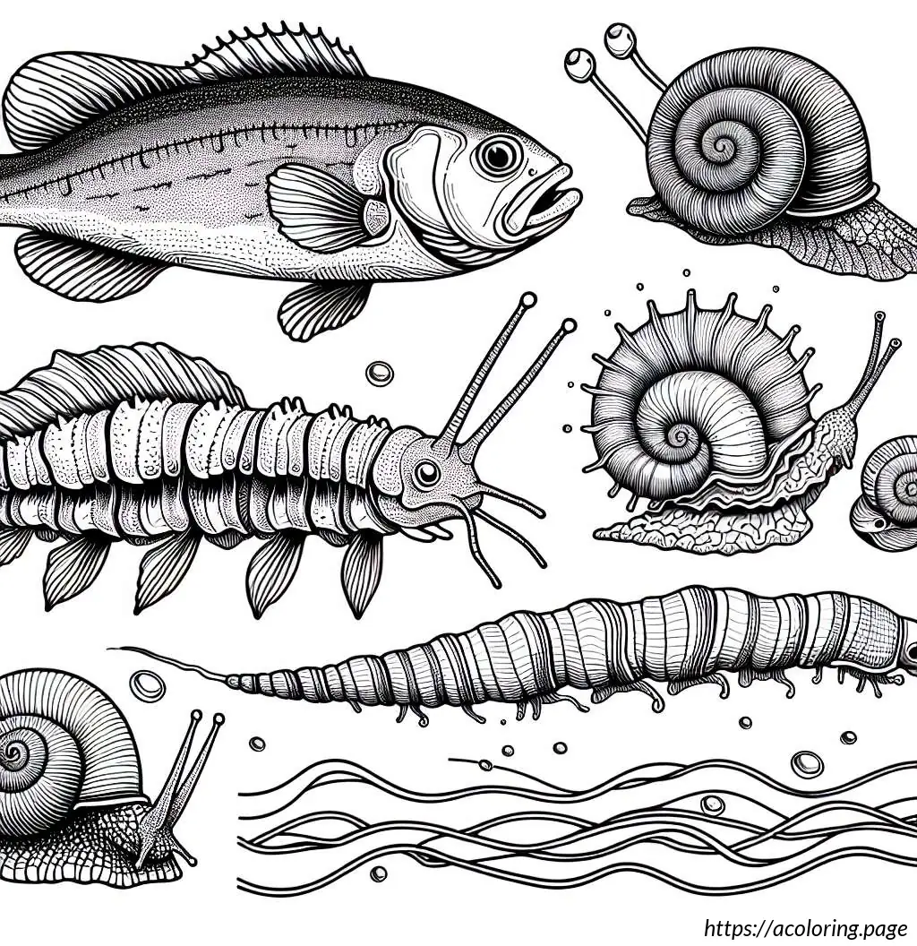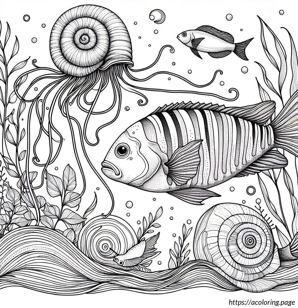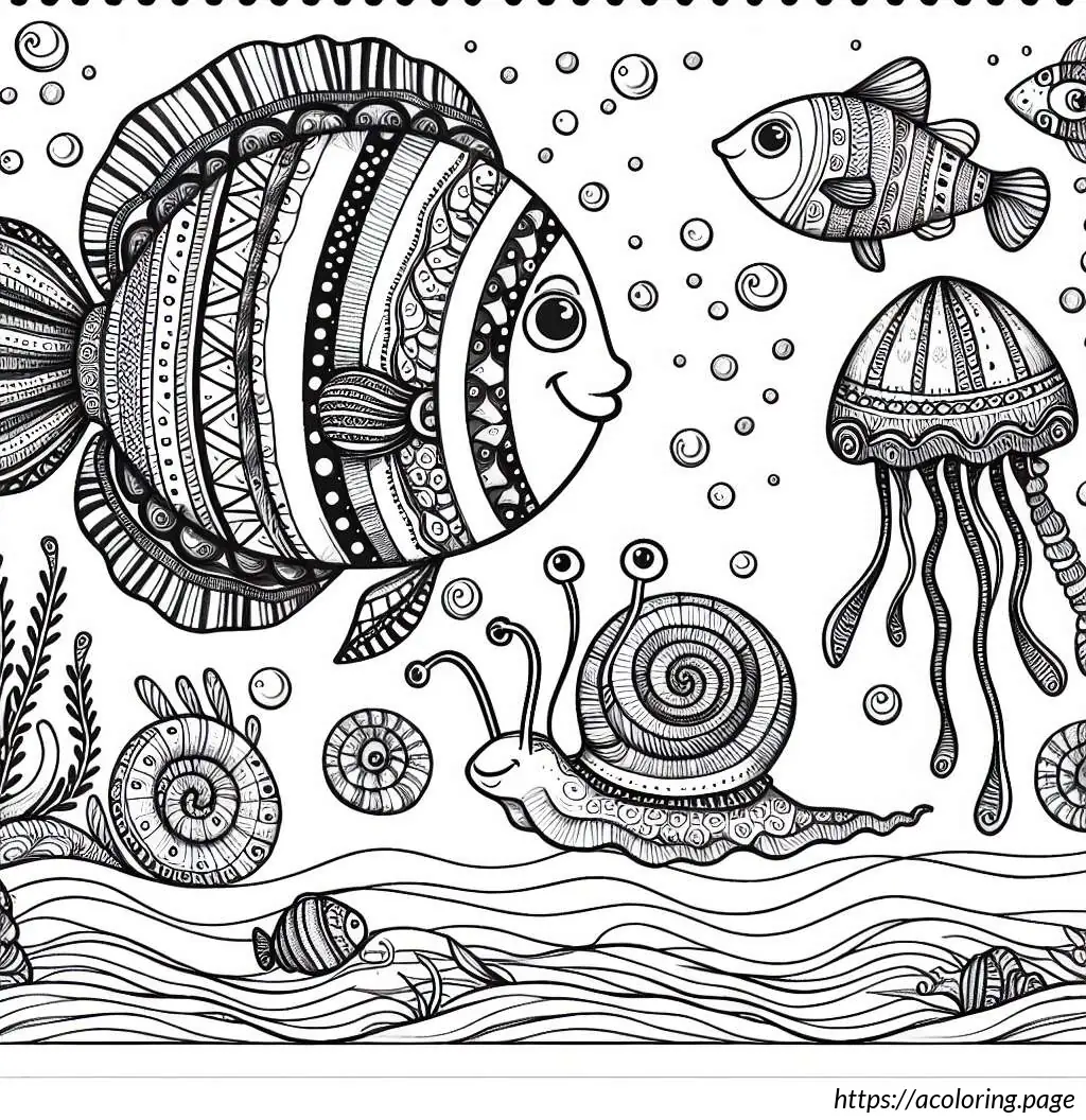 This image depicts a variety of stylized sea creatures and elements arranged in a whimsical, high-contrast black and white format, ideal for a coloring page. Most prominent is the large fish in the center, adorned with stripes and patterns on its body. Above and to the left of the central fish is a snail, characterized by its coiled shell and simple, cartoonish features. To the right, there is another small snail.