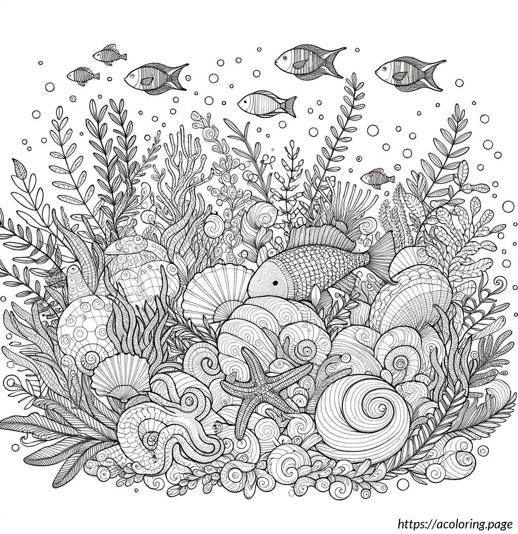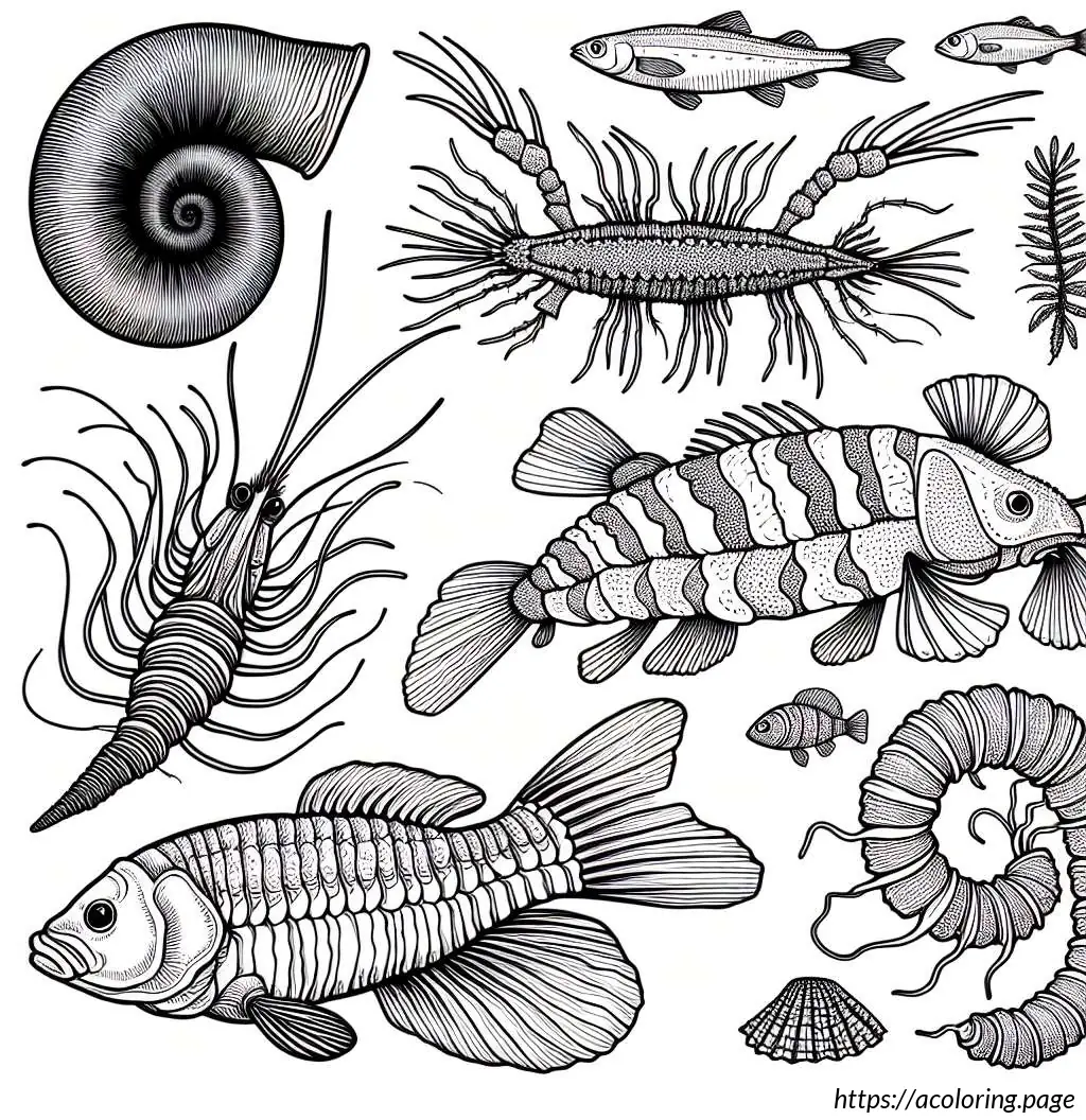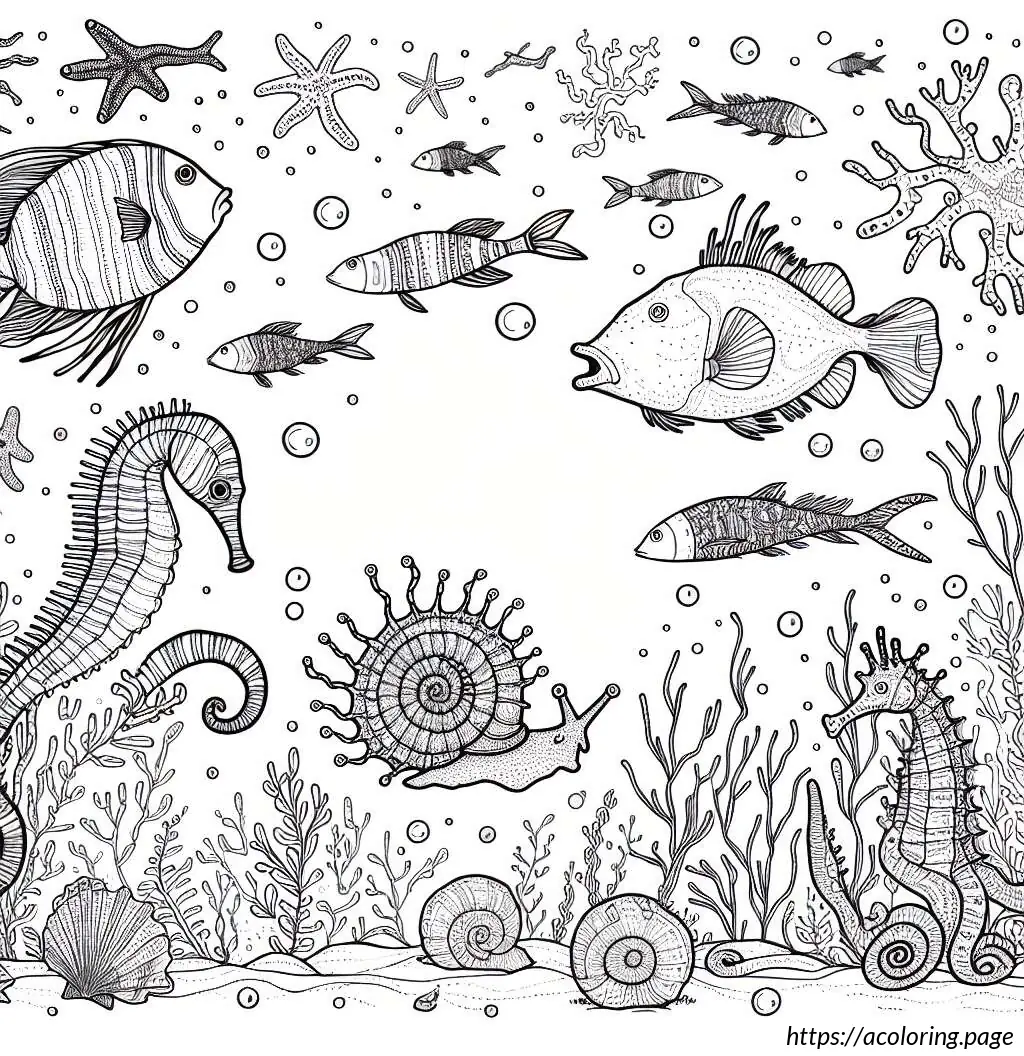 This image depicts a variety of stylized sea creatures and elements arranged in a whimsical, high-contrast black and white format, ideal for a coloring page. Most prominent is the large fish in the center, adorned with stripes and patterns on its body. Above and to the left of the central fish is a snail, characterized by its coiled shell and simple, cartoonish features. To the right, there is another small snail.
