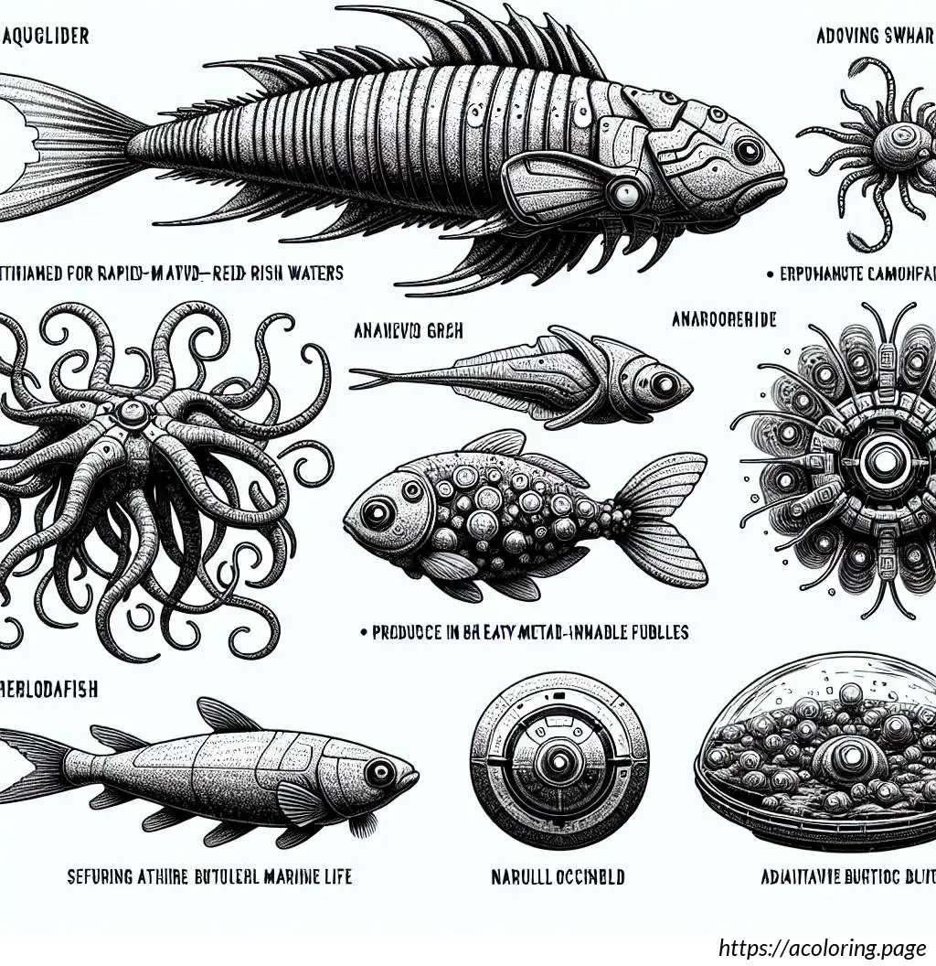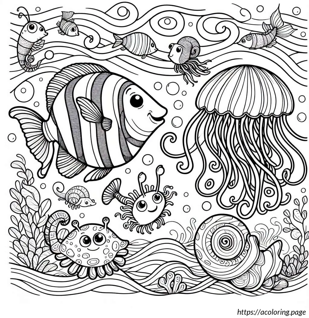 Below the central fish, there’s an illustration of a jellyfish, notable for its bell-shaped body and tentacles. Beside the jellyfish, a smaller, plump fish with scales and a distinct, smiling face swims. At the bottom of the image is a simpler depiction of a fish with fewer details, elongated in shape and seeming to swim along the bottom edge of the frame.