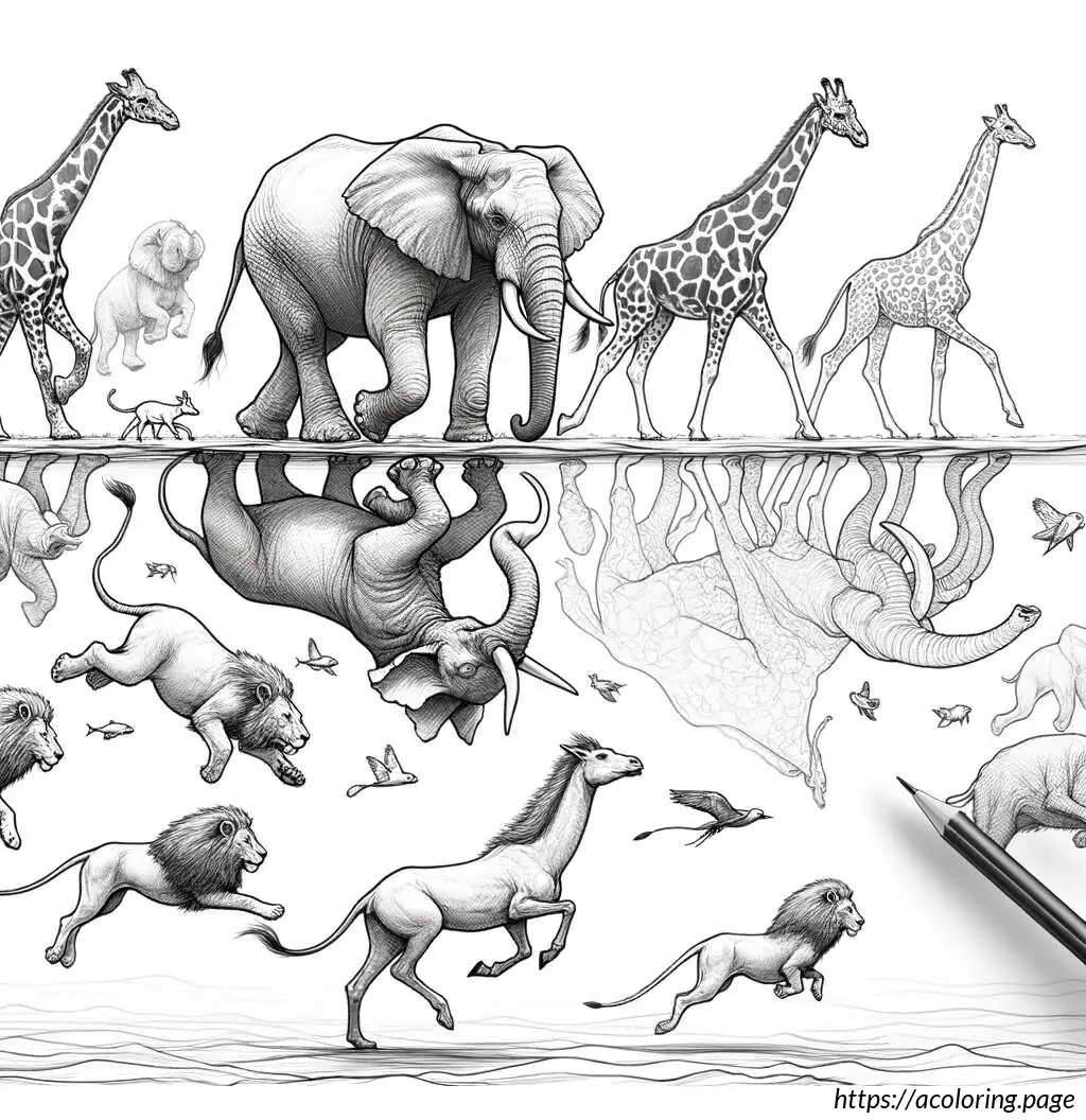 The background is filled with wavy lines that suggest water movement, adding a sense of underwater environment while enhancing the playful, dynamic nature of the scene. This illustration is likely designed for educational or recreational purposes, appealing especially to children for coloring activities.