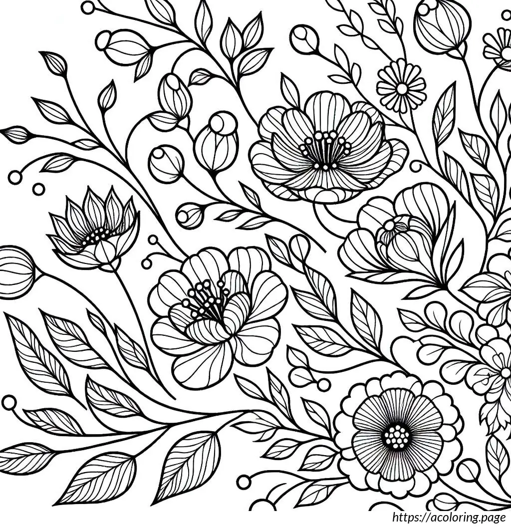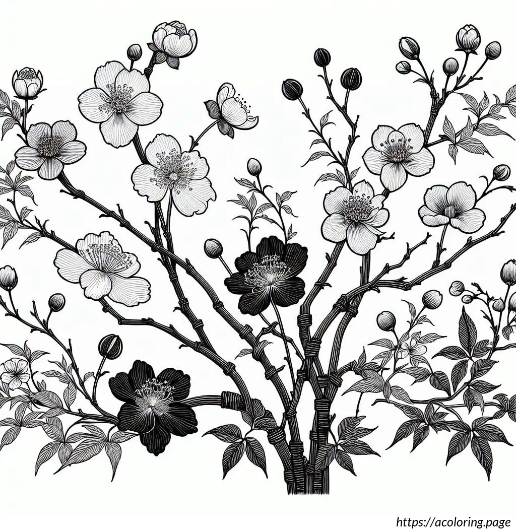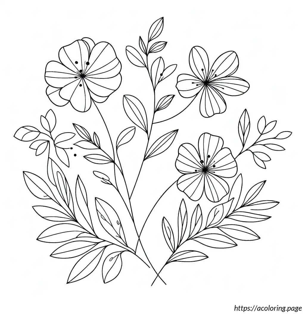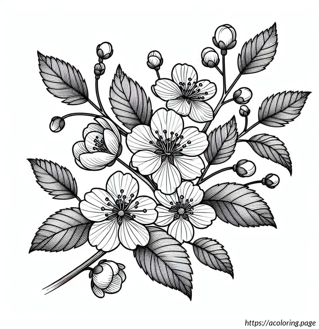 The image depicts a collection of floral elements in a line art style, suitable for coloring activities. It features several blossoms of varying sizes and stages of bloom, along with leaves and buds. The flowers, which could resemble a type of cherry blossom or similar simple petal arrangement, are five-petaled with a center marked by several dots, indicating the stamens. The leaves are shown with smooth edges, and some are visible behind or between the flowers, enhancing the composition’s natural and dense floral feel. There are also buds just beginning to open, adding to the variety of growth stages presented. The overall arrangement is somewhat stylized and compact, making the illustration engaging and suitable for artistic embellishment.