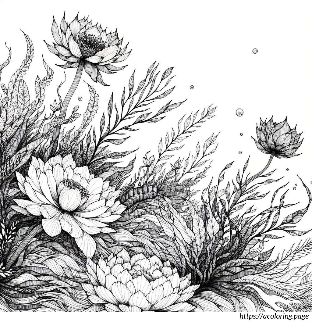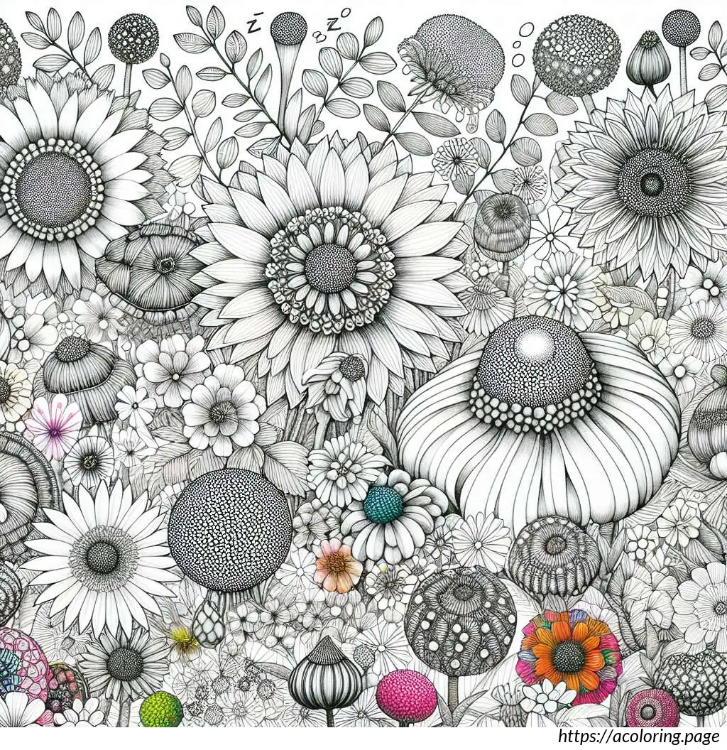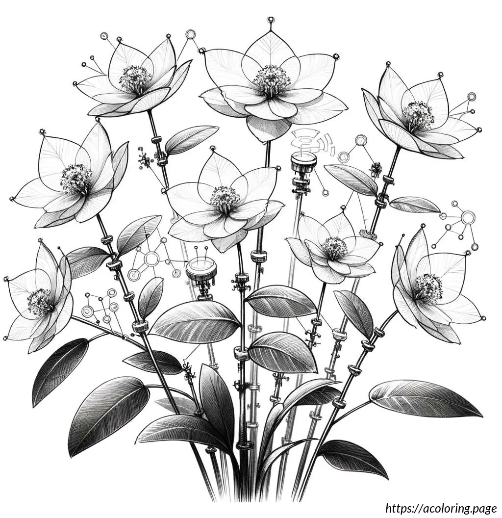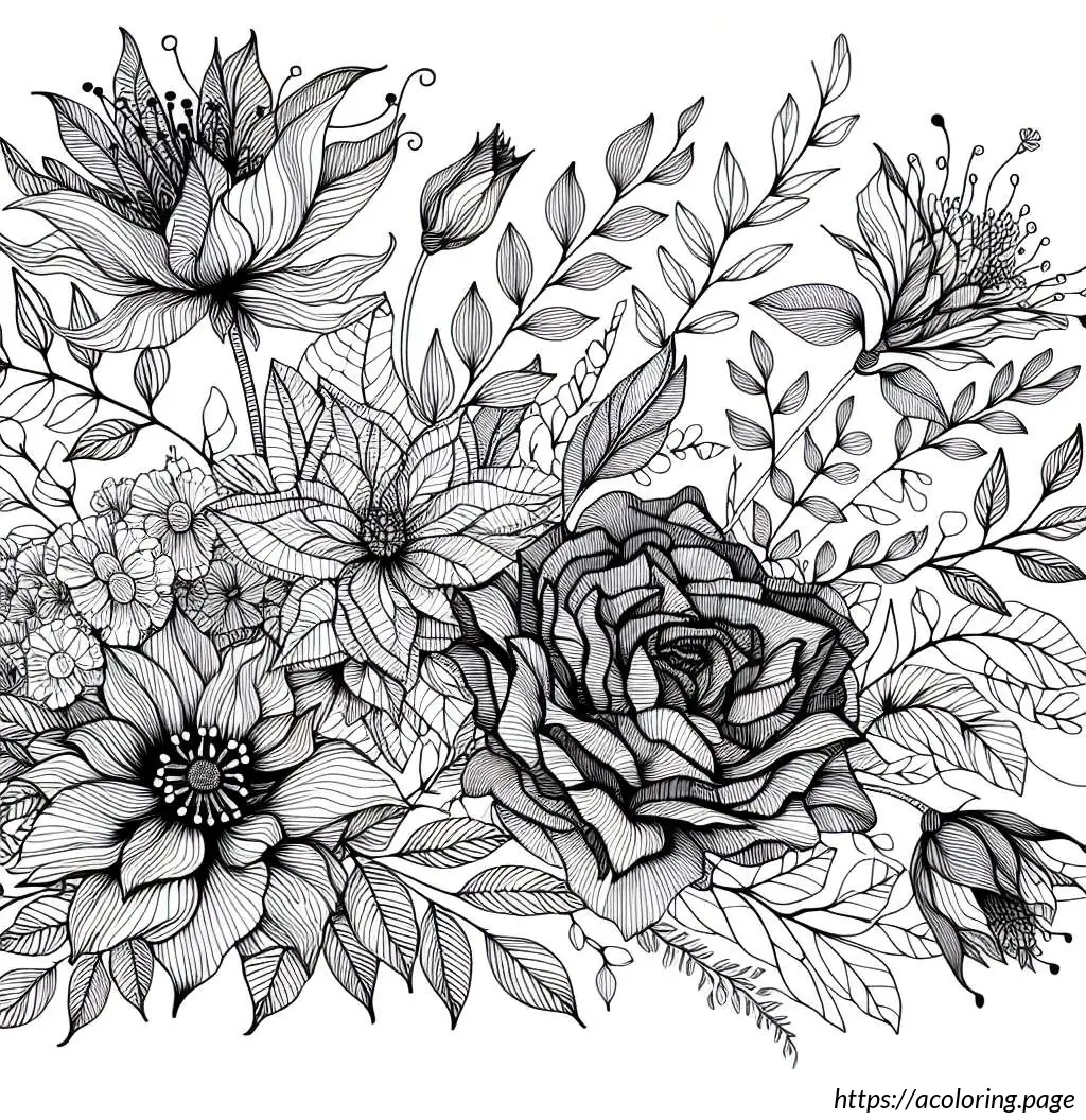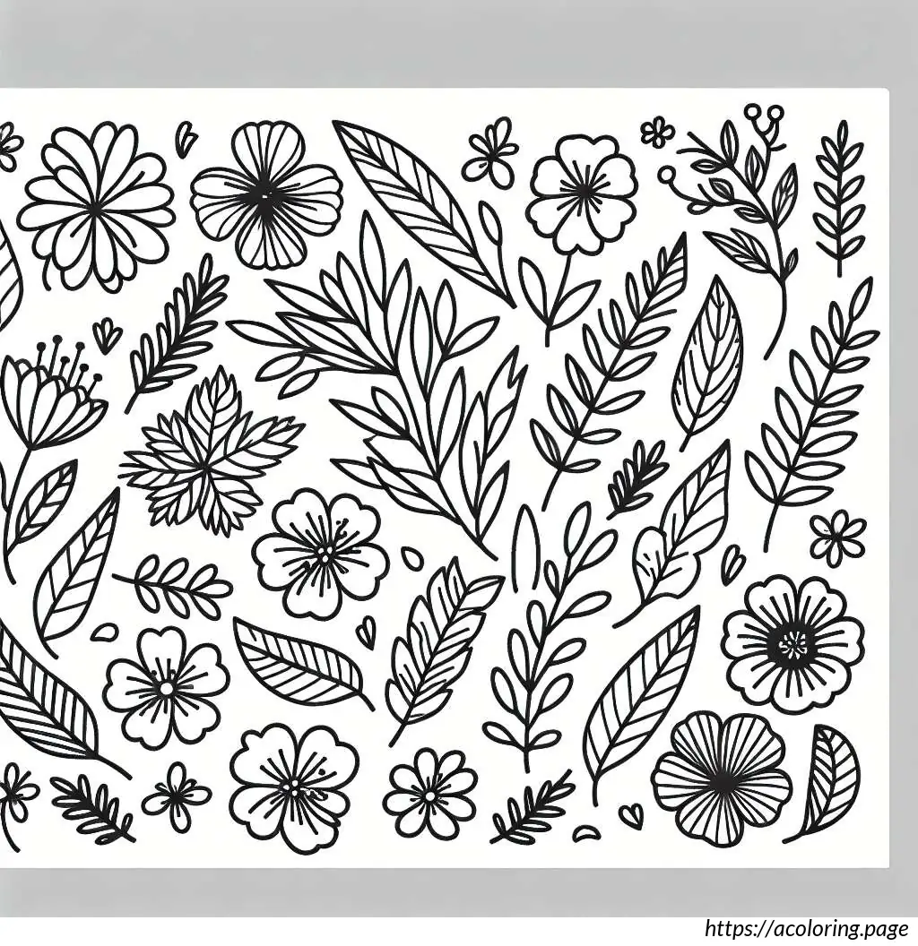 The image depicts a collection of floral elements in a line art style, suitable for coloring activities. It features several blossoms of varying sizes and stages of bloom, along with leaves and buds. The flowers, which could resemble a type of cherry blossom or similar simple petal arrangement, are five-petaled with a center marked by several dots, indicating the stamens. The leaves are shown with smooth edges, and some are visible behind or between the flowers, enhancing the composition’s natural and dense floral feel. There are also buds just beginning to open, adding to the variety of growth stages presented. The overall arrangement is somewhat stylized and compact, making the illustration engaging and suitable for artistic embellishment.