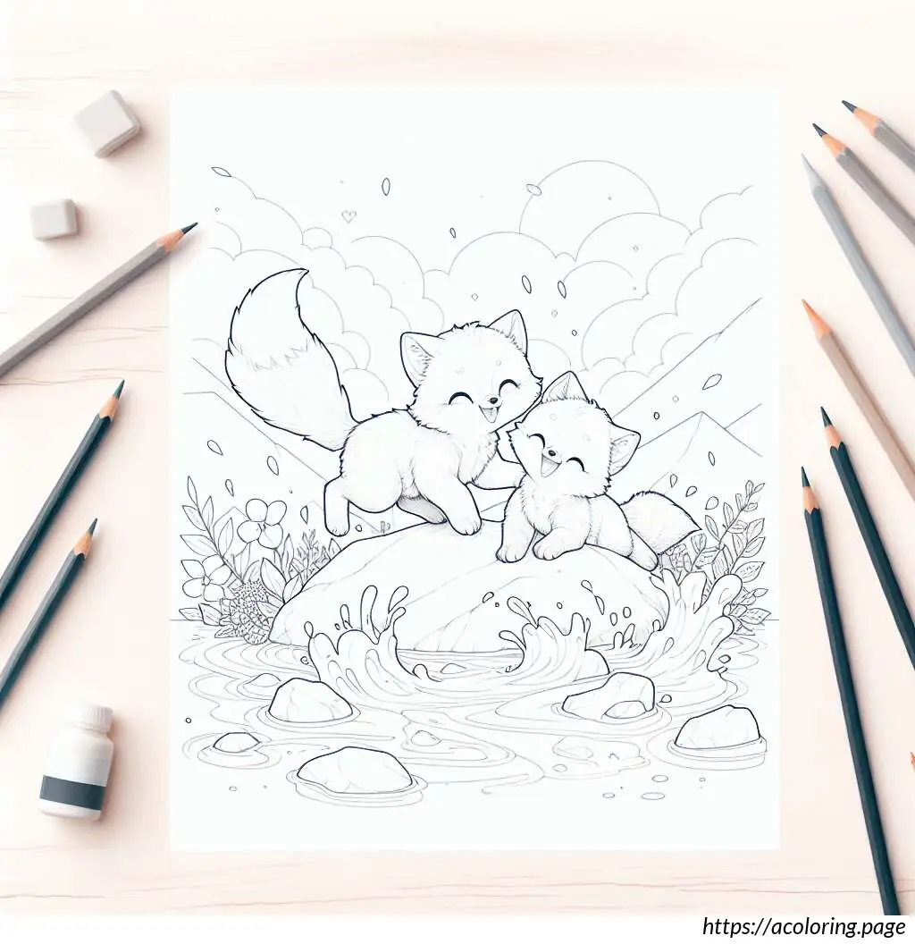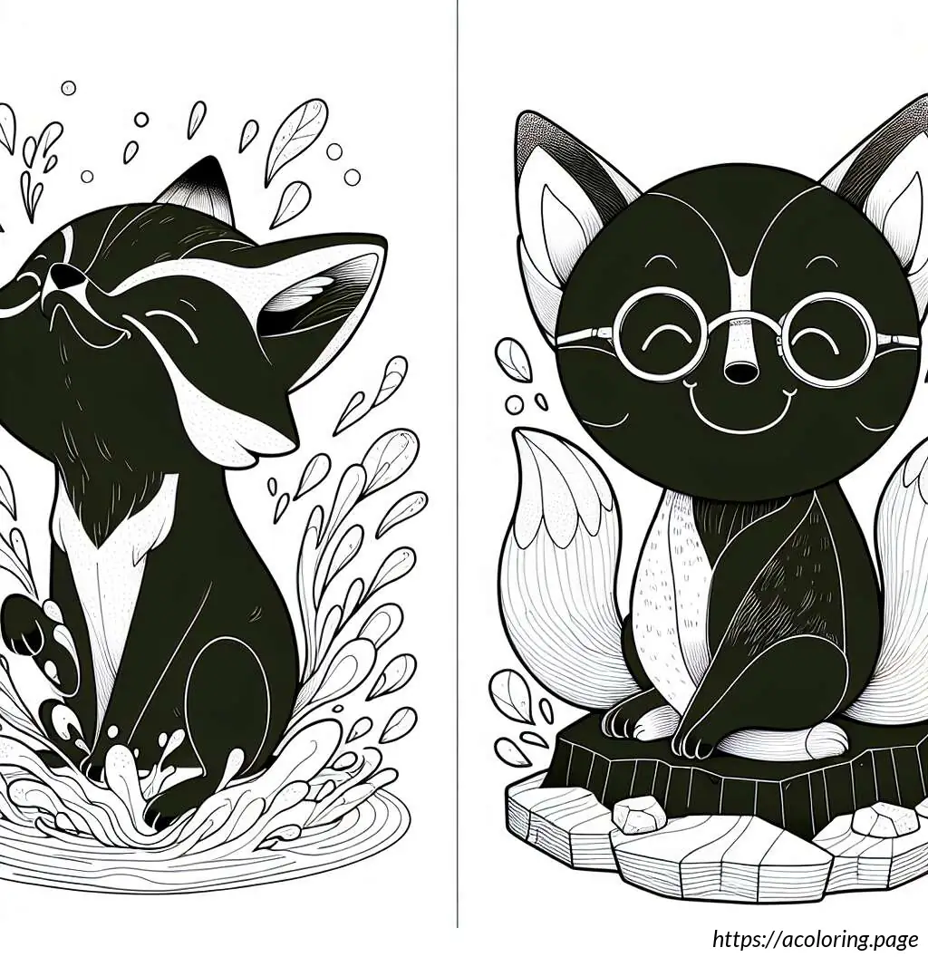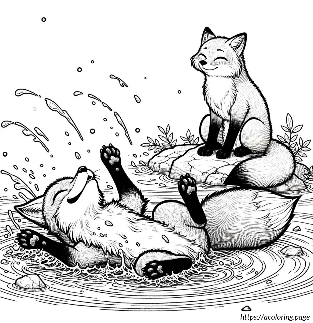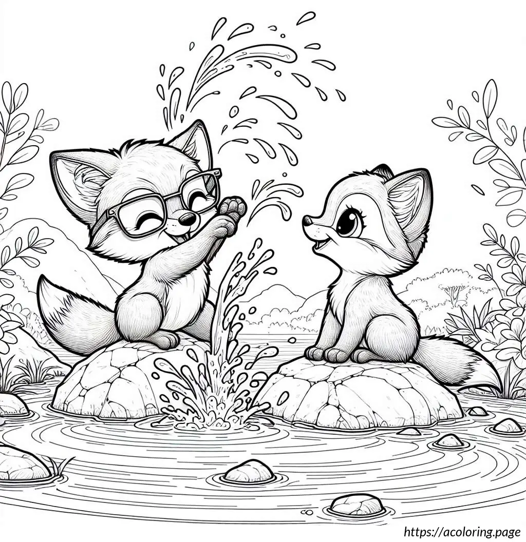The image shows a playful and cute scene with two cartoon fox cubs. One cub, on the left, appears to be splashing water with its paw, creating a dynamic spray of droplets. The other cub, on the right, wears glasses and seems to be smiling, possibly enjoying the playful water splash. They’re both perched atop a rock or mound, suggesting a setting by a water source like a stream or pond. The scene is outlined in a simple, clear line art style suitable for coloring activities, emphasizing the jovial and innocent nature of the moment.