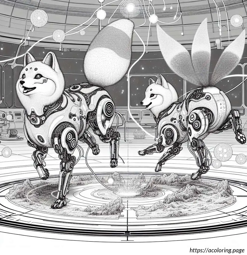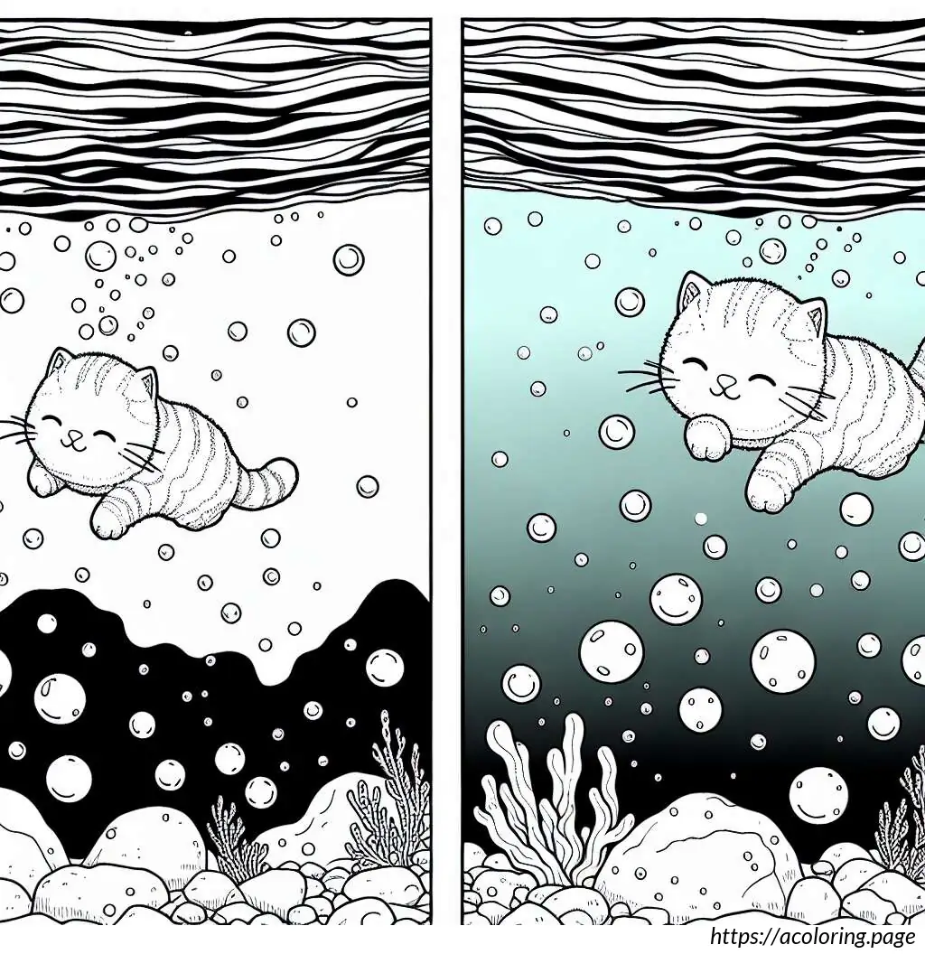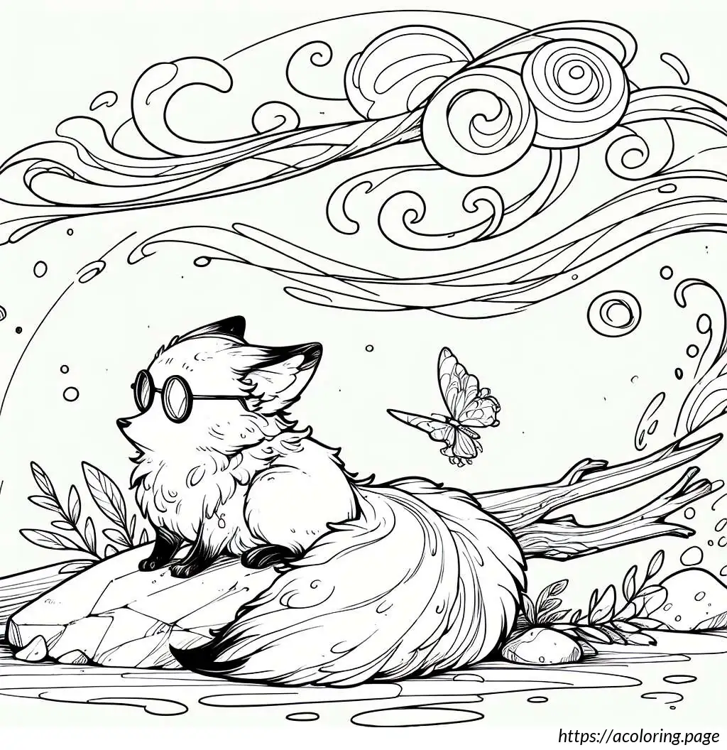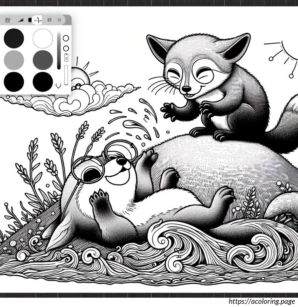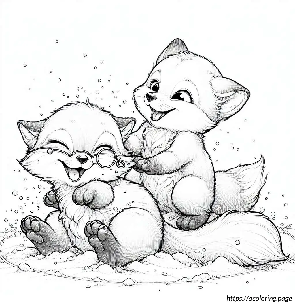 The image shows a playful and cute scene with two cartoon fox cubs. One cub, on the left, appears to be splashing water with its paw, creating a dynamic spray of droplets. The other cub, on the right, wears glasses and seems to be smiling, possibly enjoying the playful water splash. They’re both perched atop a rock or mound, suggesting a setting by a water source like a stream or pond. The scene is outlined in a simple, clear line art style suitable for coloring activities, emphasizing the jovial and innocent nature of the moment.