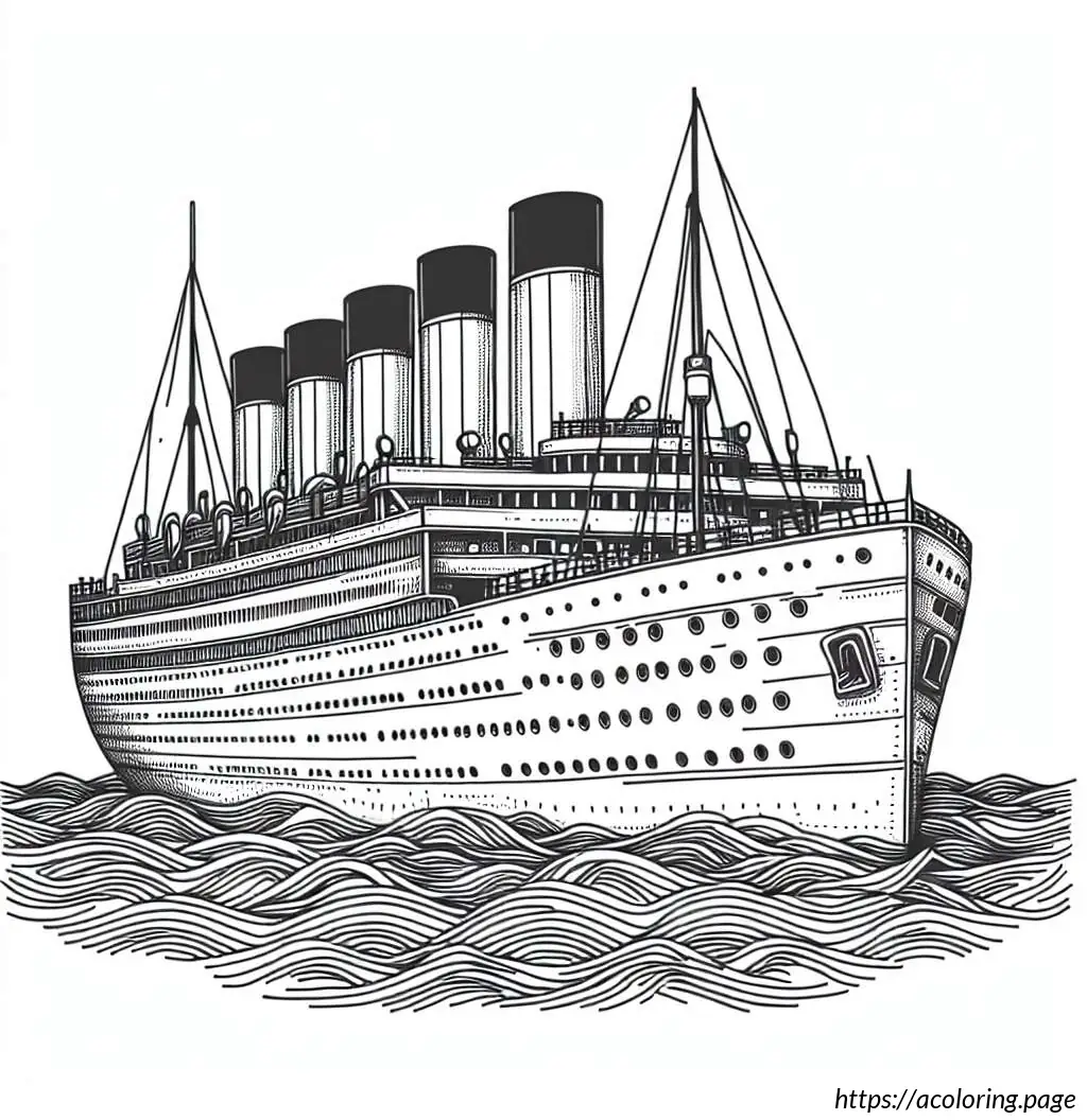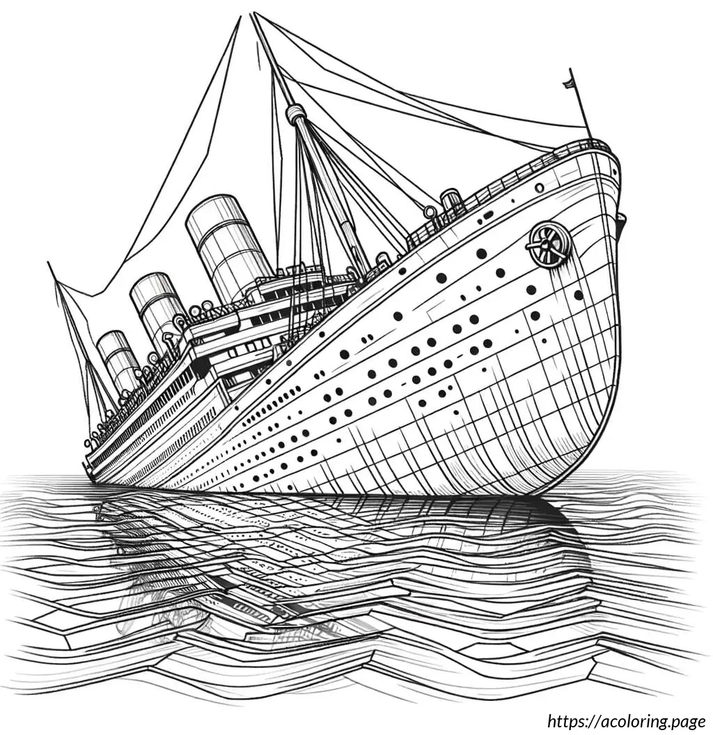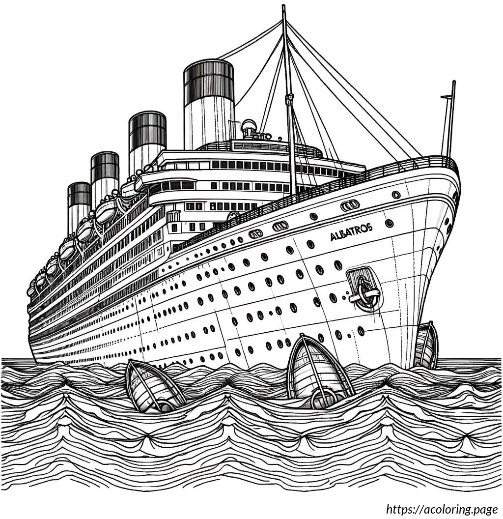 The image is a simple, black and white line drawing of a cruise ship shown at a tilted angle, suggesting it might be sinking. The name “ALBATROSS” is prominently displayed vertically along one side of the ship. The ship has several rows of porthole windows, and multiple levels of decks with railing details visible. Additionally, there are three visible lifeboats attached to the side facing the viewer. The sea lines indicated below the ship, combined with wavy lines above, suggest movement of water, possibly due to the ship’s precarious situation. There is no detailed shading or color, relying solely on outlines to define shapes and details.