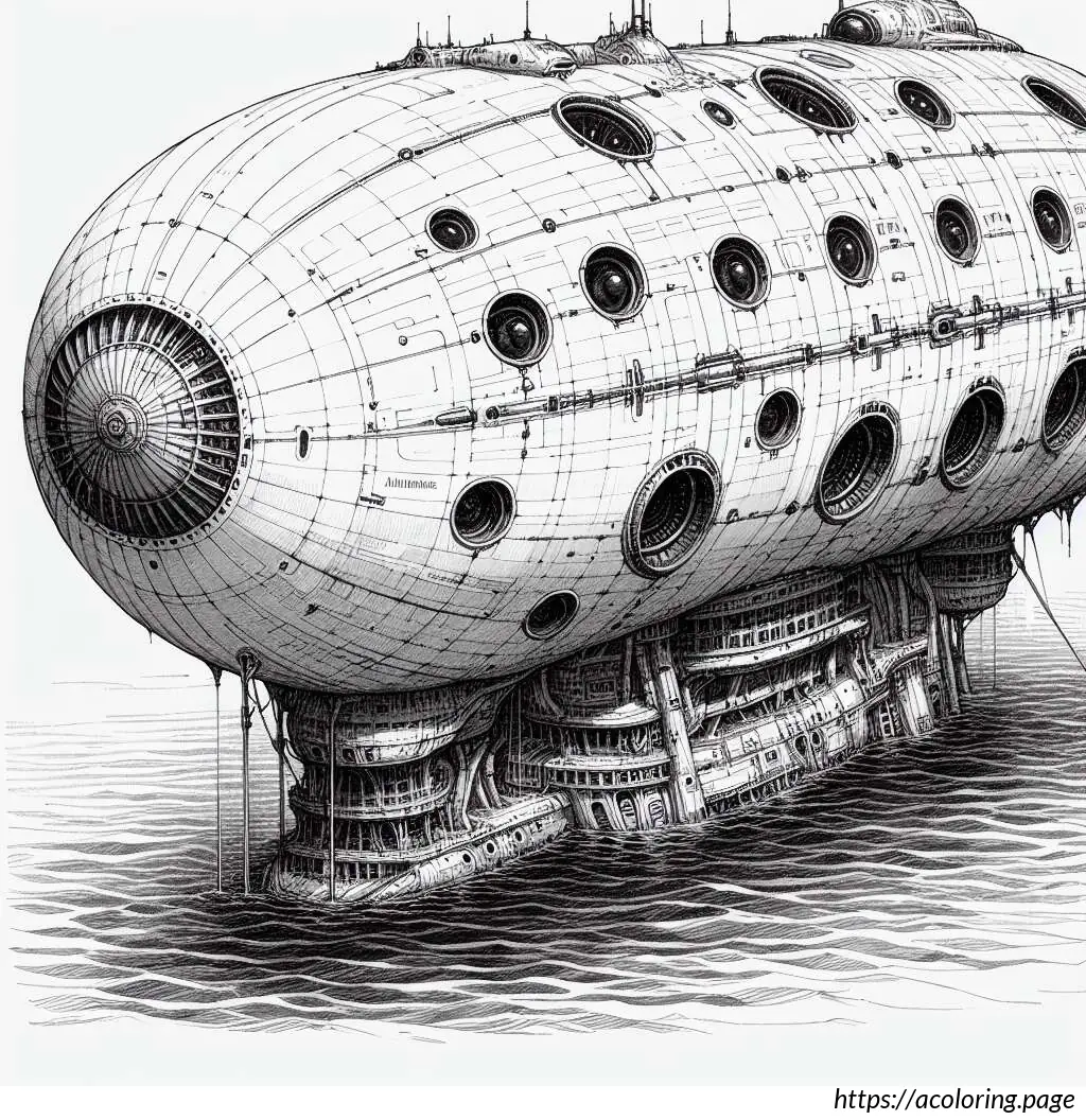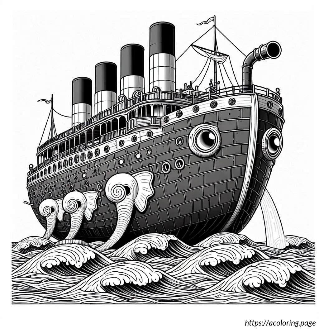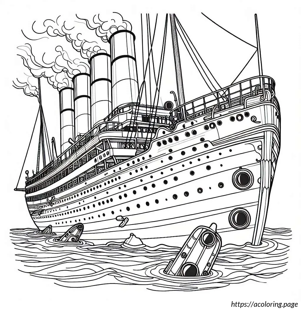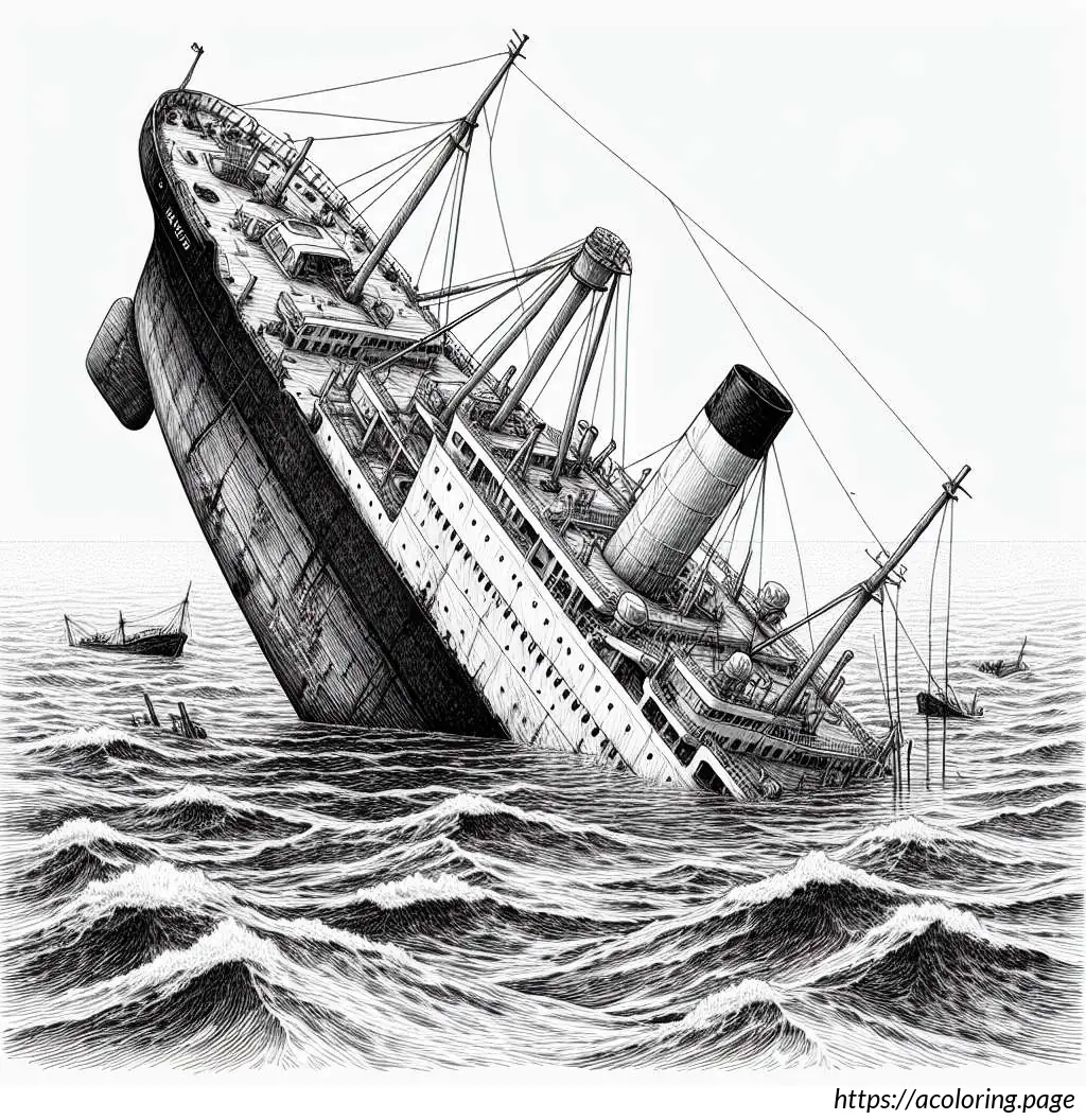 The image is a simple, black and white line drawing of a cruise ship shown at a tilted angle, suggesting it might be sinking. The name “ALBATROSS” is prominently displayed vertically along one side of the ship. The ship has several rows of porthole windows, and multiple levels of decks with railing details visible. Additionally, there are three visible lifeboats attached to the side facing the viewer. The sea lines indicated below the ship, combined with wavy lines above, suggest movement of water, possibly due to the ship’s precarious situation. There is no detailed shading or color, relying solely on outlines to define shapes and details.