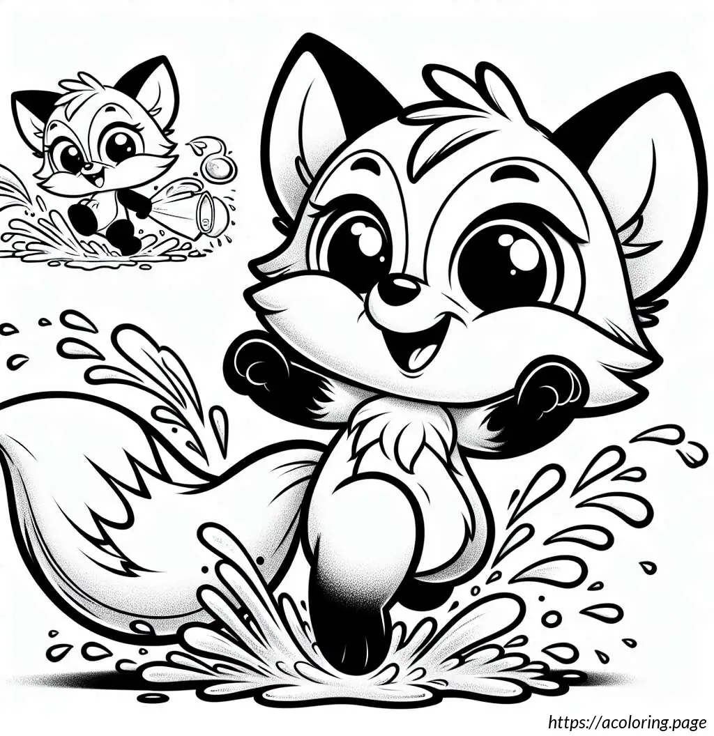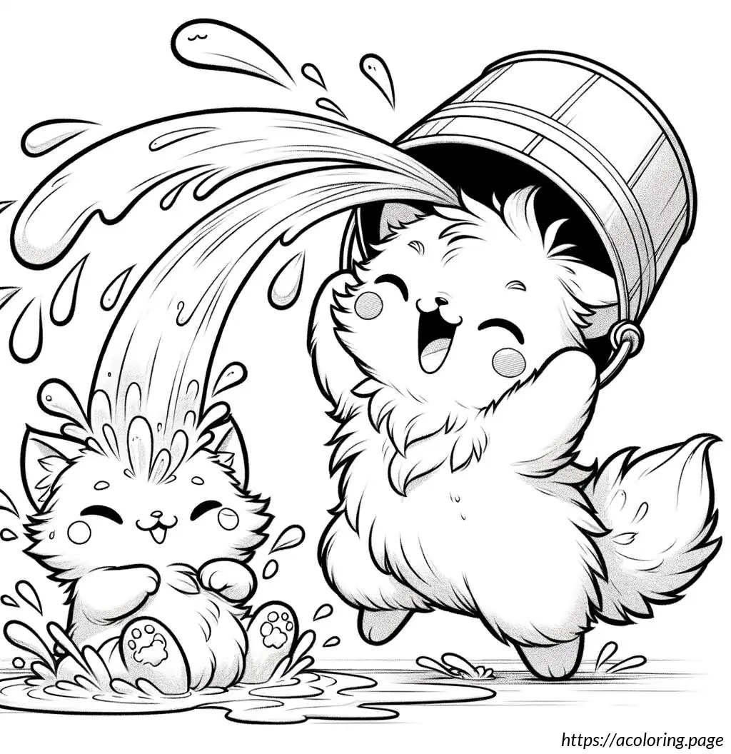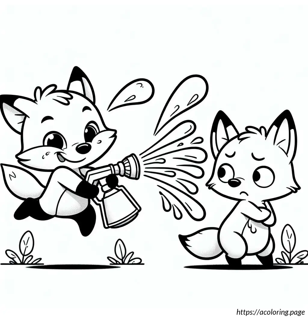 The image is a black and white line drawing featuring two cartoon-style fox characters. The fox on the left, with bushy fur and an expressive face, seems jubilant and is running while holding what appears to be a large bucket. This fox is in the motion of splashing a liquid from the bucket towards the other fox. The second fox, on the right, has a playful expression and appears to be either dancing or recoiling from being splashed by the first fox. Both characters have stylized features like large eyes, fluffy tails, and oversized paws, enhancing their playful and imaginary aesthetic. The scene is dynamic and conveys a sense of fun and mischief.