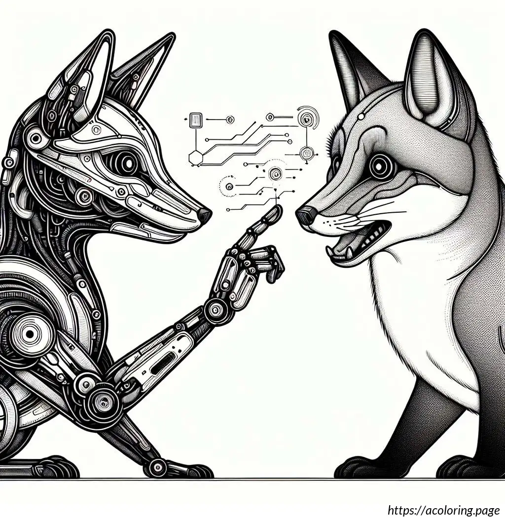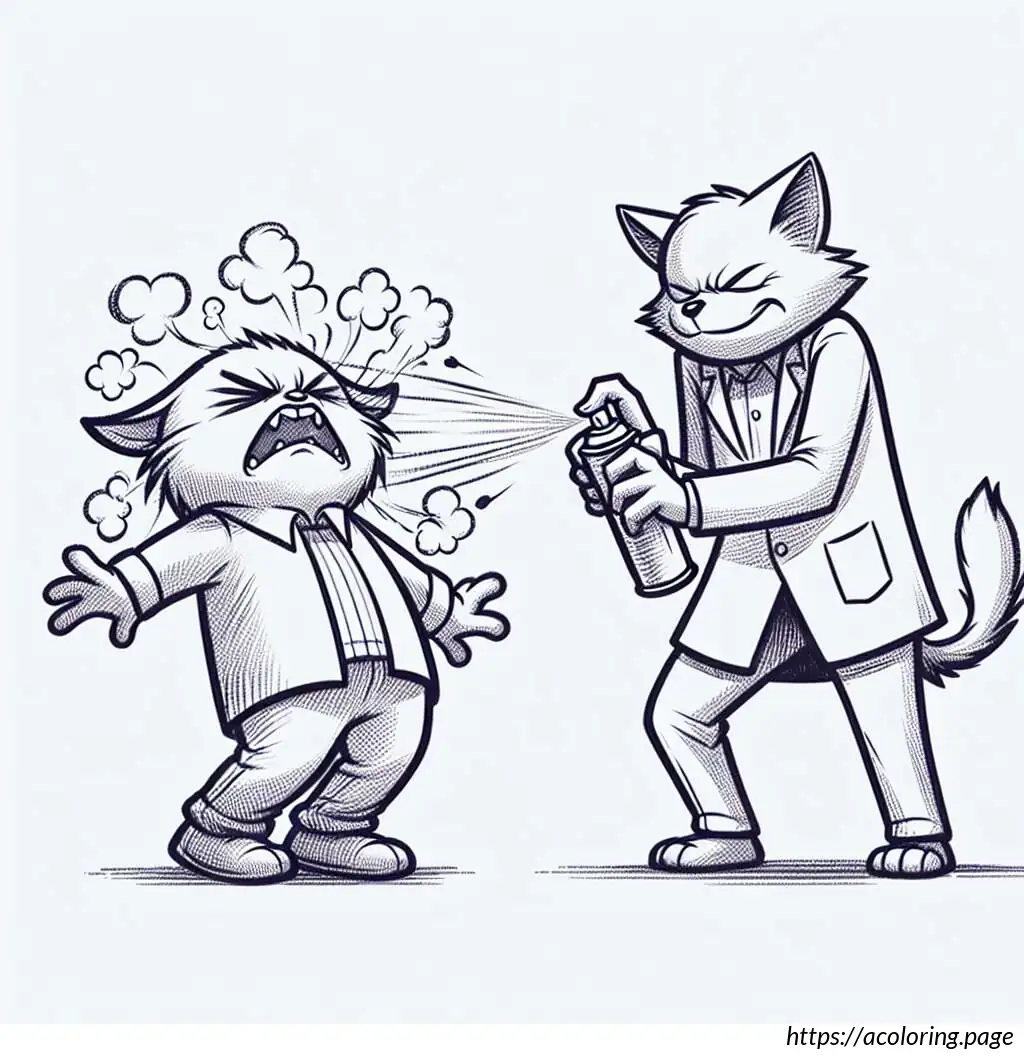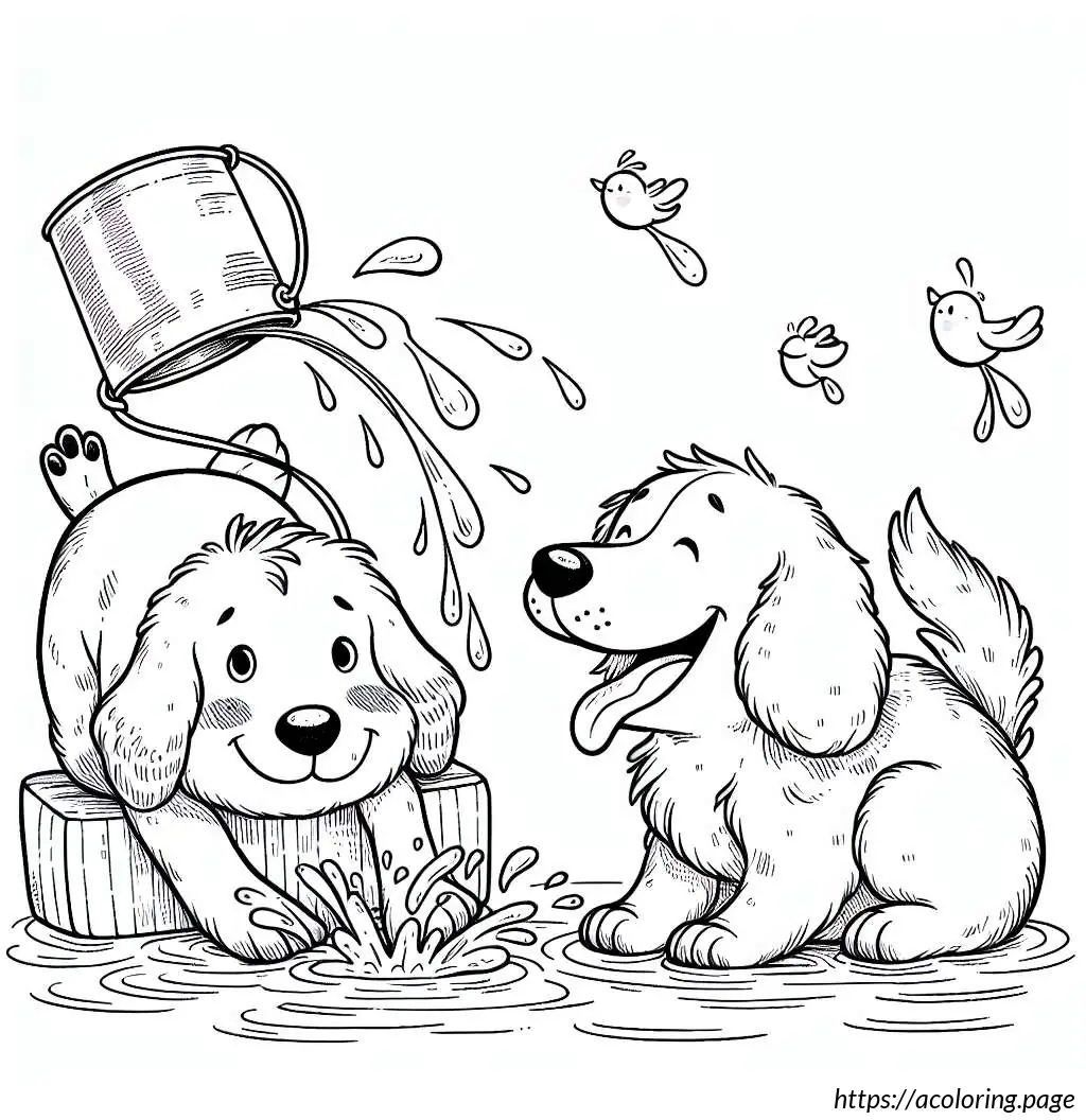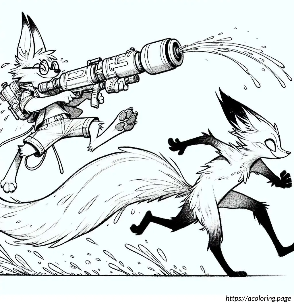 The image is a black and white line drawing featuring two cartoon-style fox characters. The fox on the left, with bushy fur and an expressive face, seems jubilant and is running while holding what appears to be a large bucket. This fox is in the motion of splashing a liquid from the bucket towards the other fox. The second fox, on the right, has a playful expression and appears to be either dancing or recoiling from being splashed by the first fox. Both characters have stylized features like large eyes, fluffy tails, and oversized paws, enhancing their playful and imaginary aesthetic. The scene is dynamic and conveys a sense of fun and mischief.