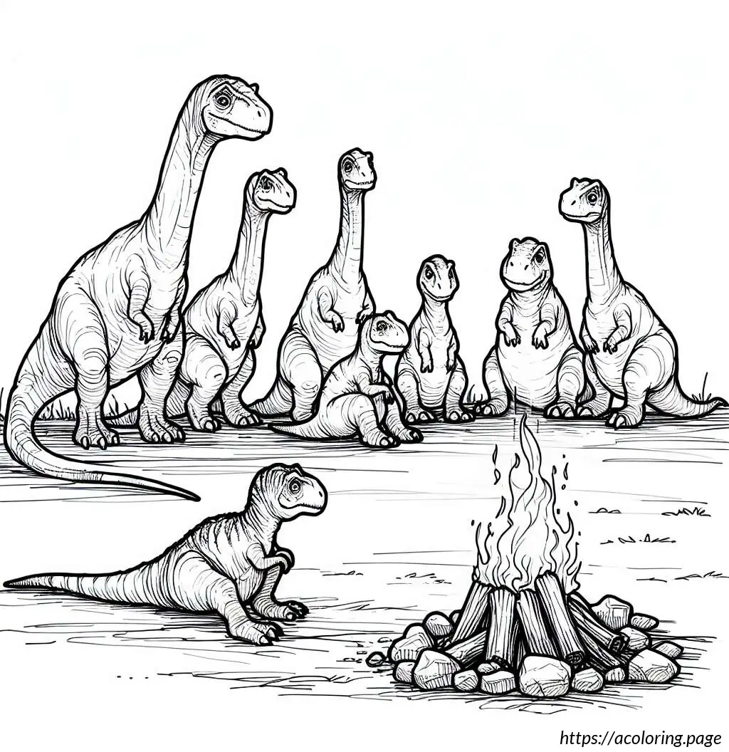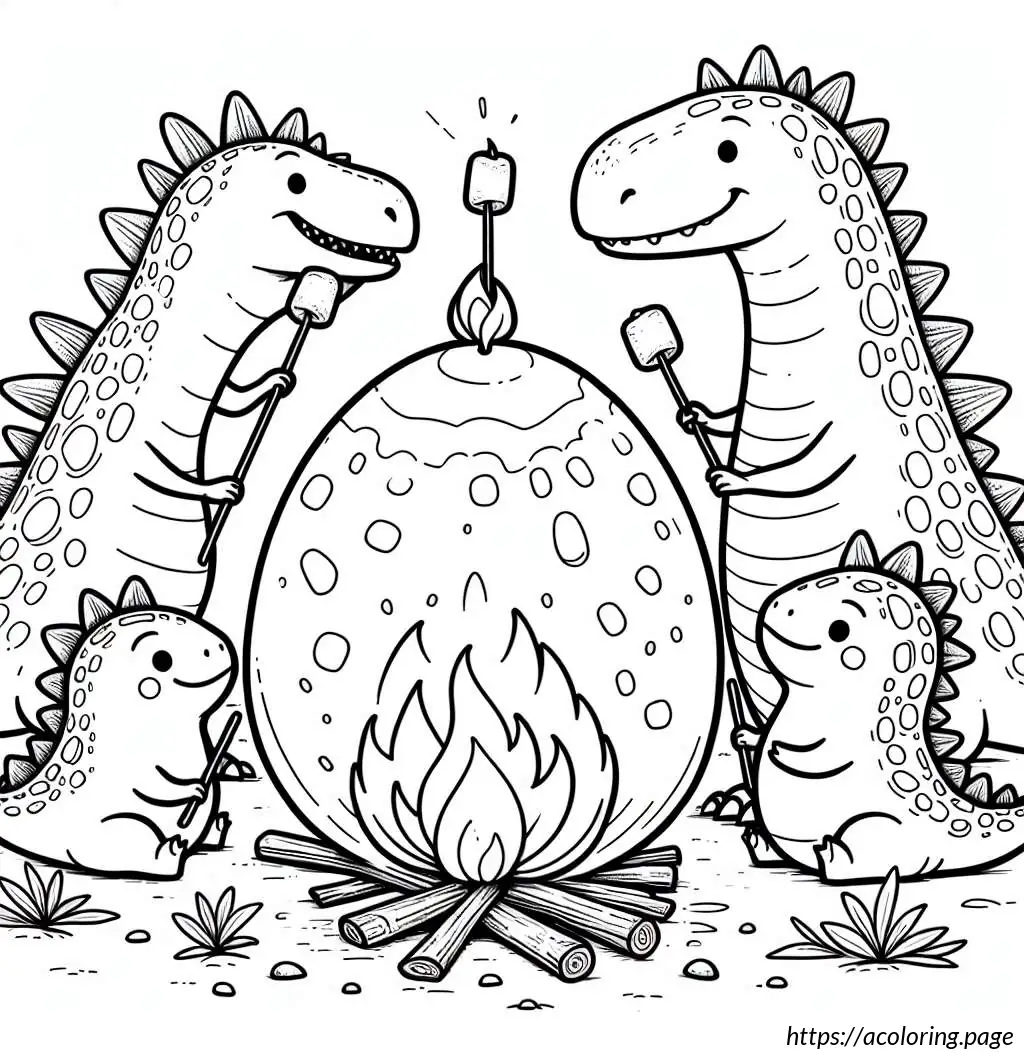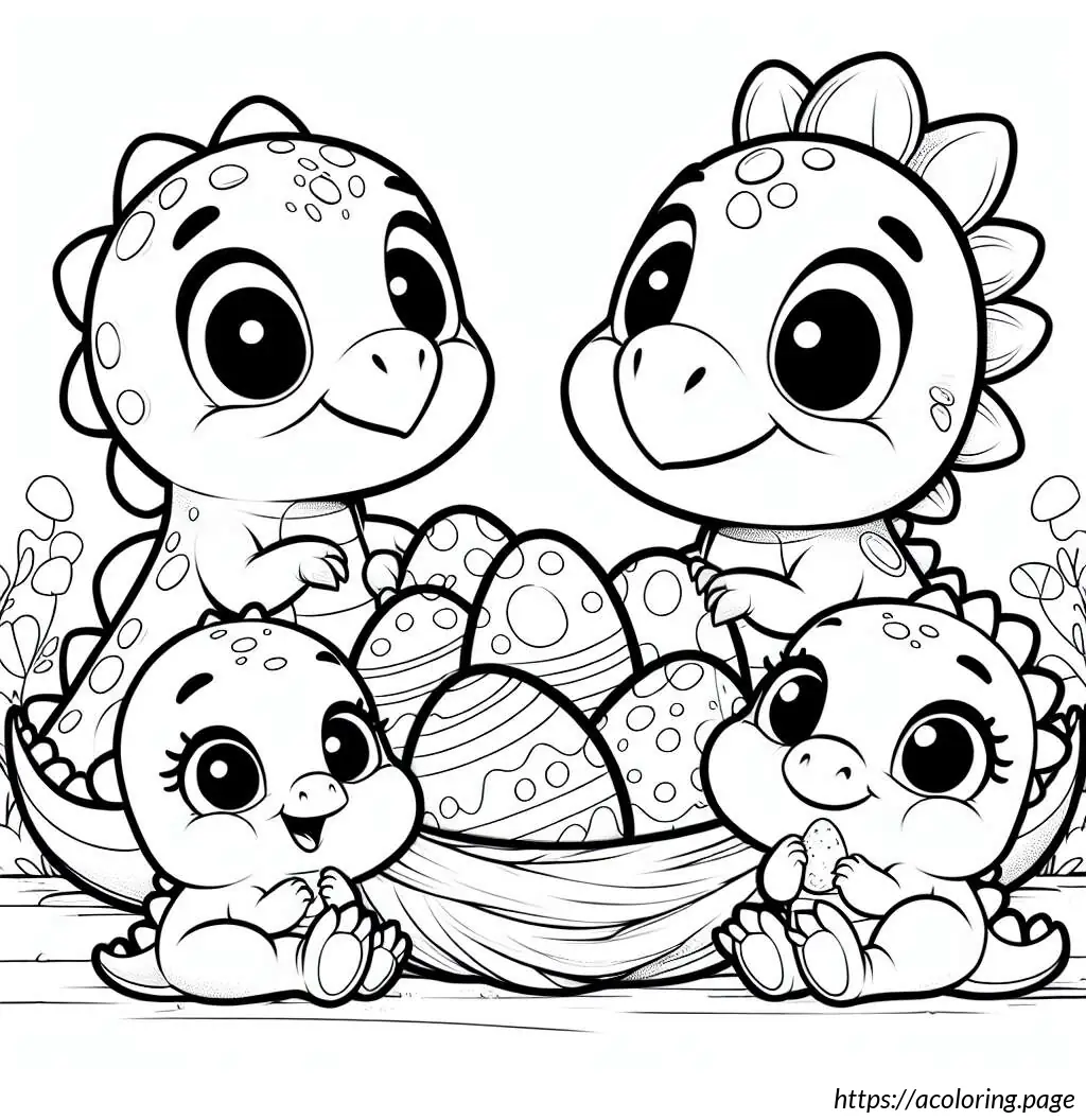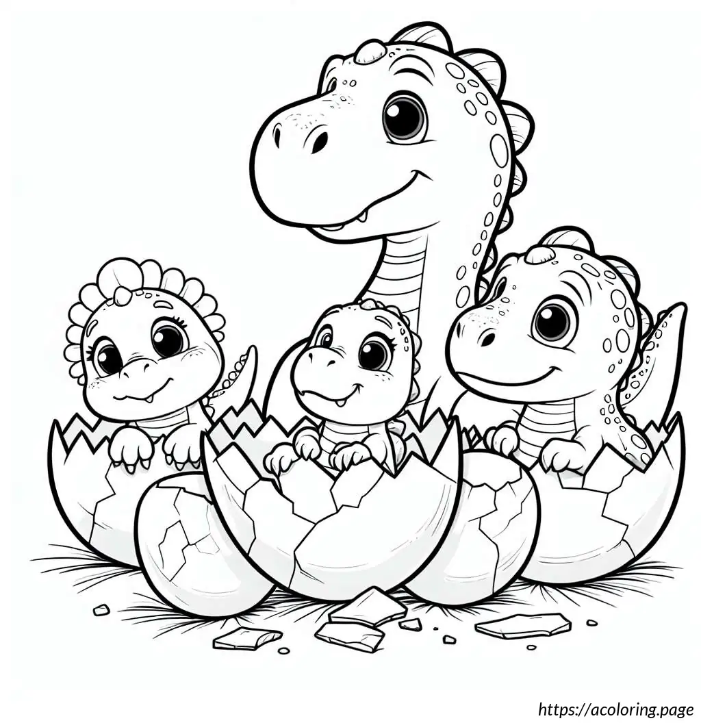 The eggs in the center seem to have just hatched, as evidenced by the cracked shells and the presence of baby dinosaurs. The scene is cheerful, likely representing a family or communal moment of new members being welcomed. The simplicity of the drawing and its monochromatic nature suggest it might be intended for coloring activities.