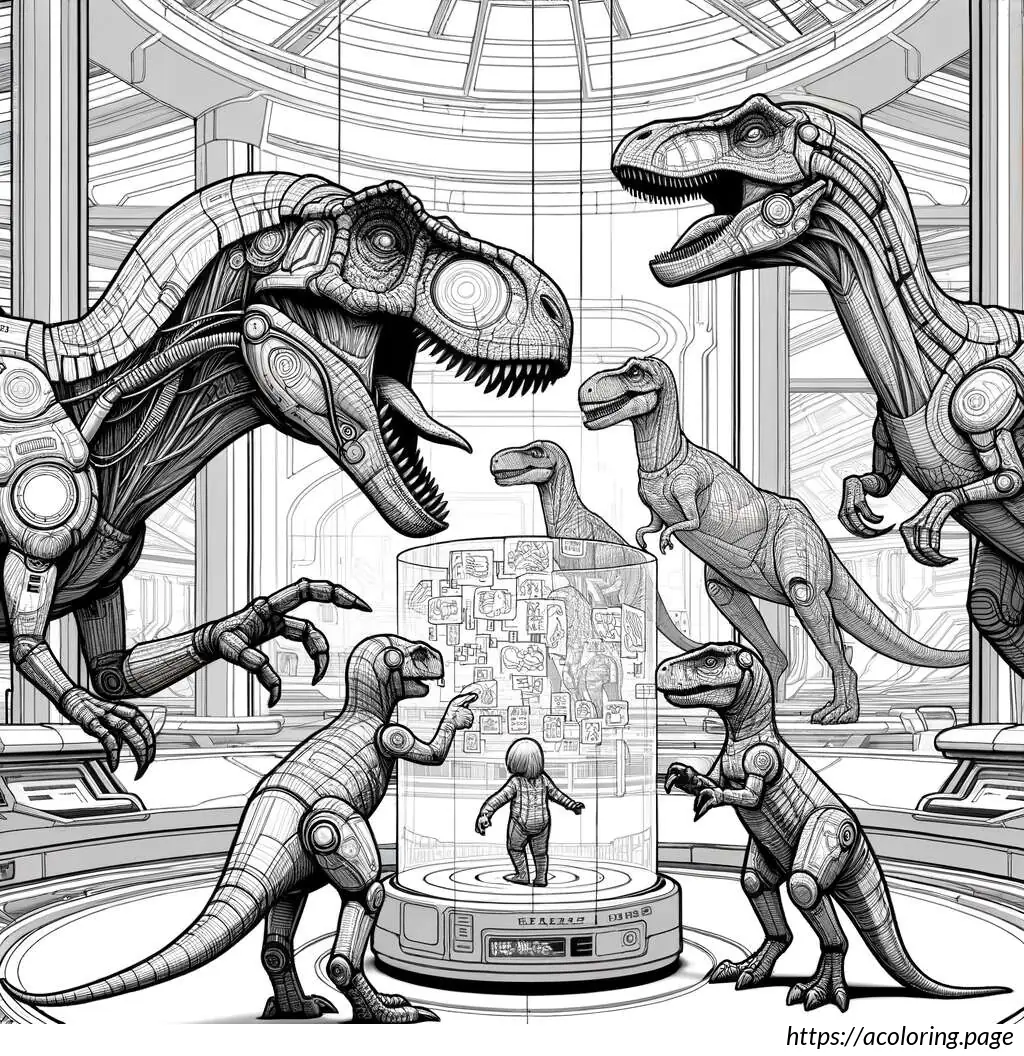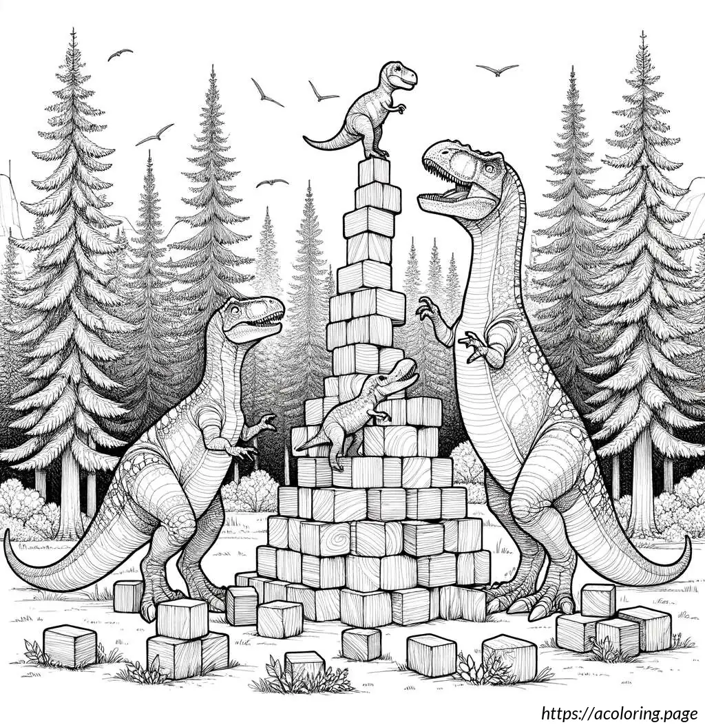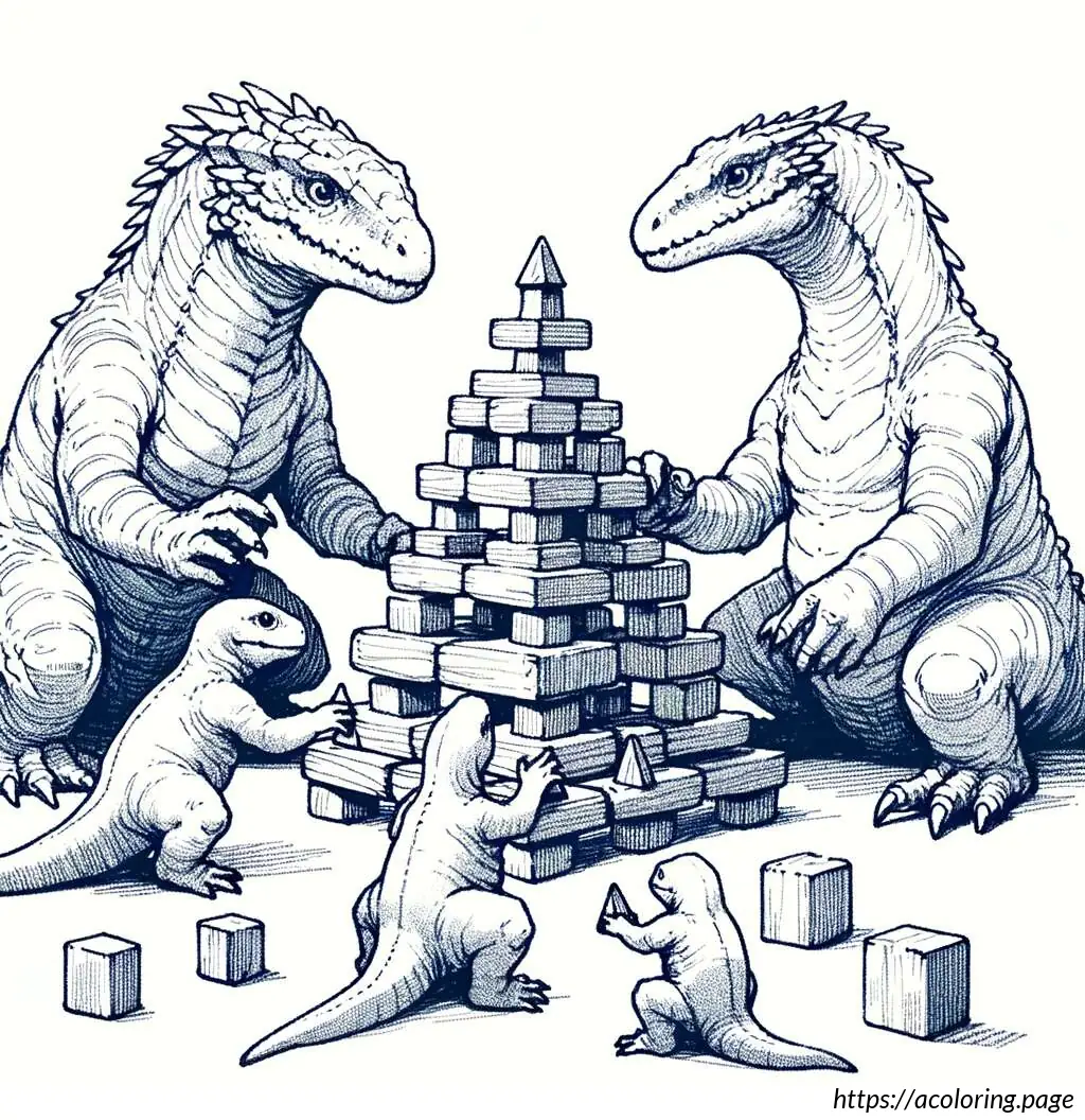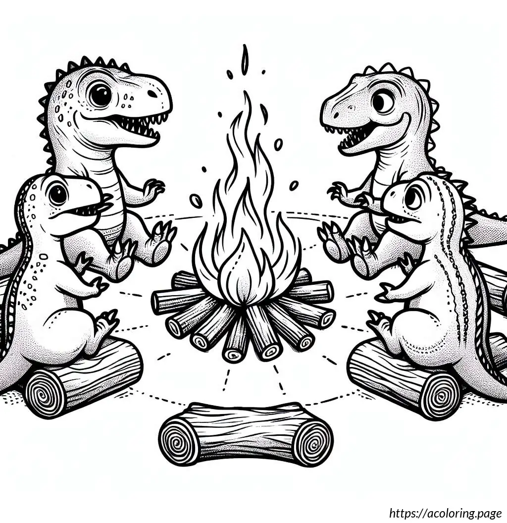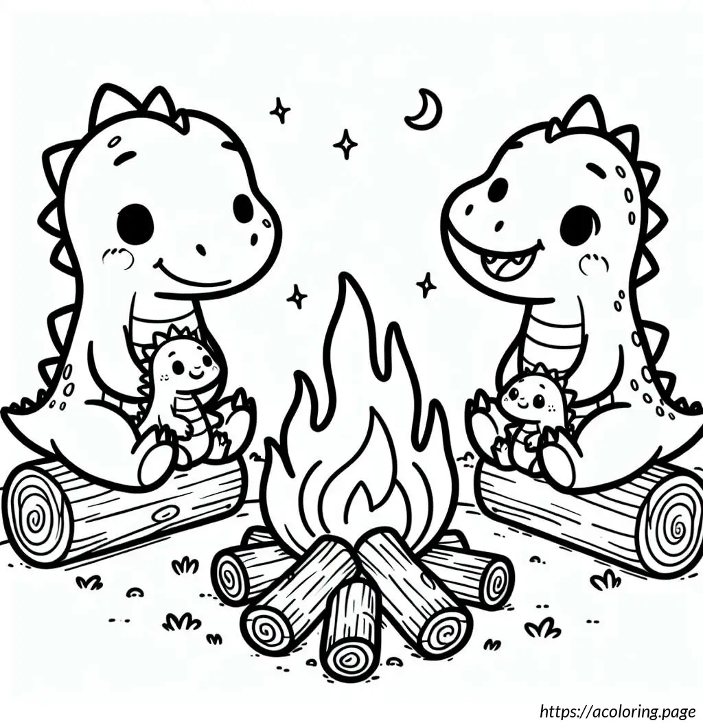 The eggs in the center seem to have just hatched, as evidenced by the cracked shells and the presence of baby dinosaurs. The scene is cheerful, likely representing a family or communal moment of new members being welcomed. The simplicity of the drawing and its monochromatic nature suggest it might be intended for coloring activities.