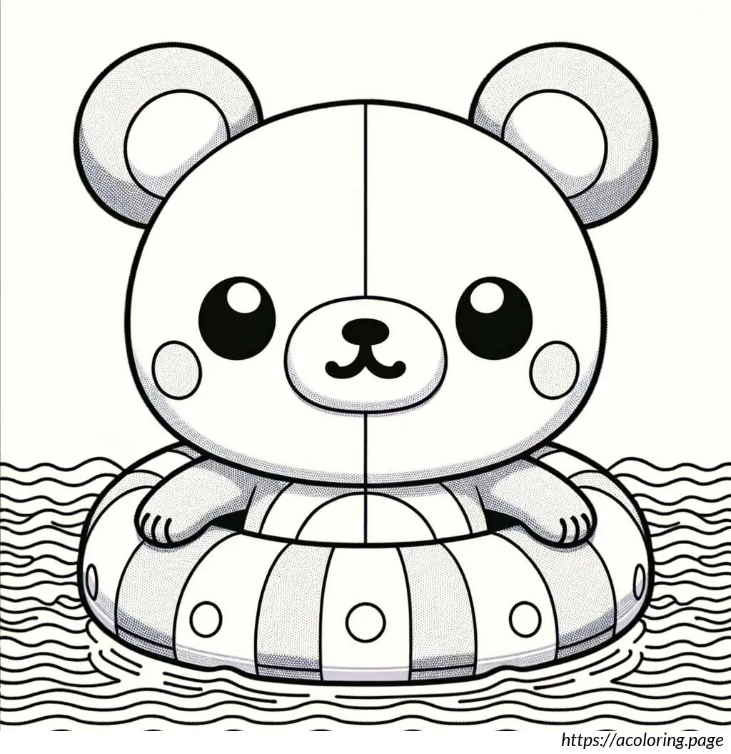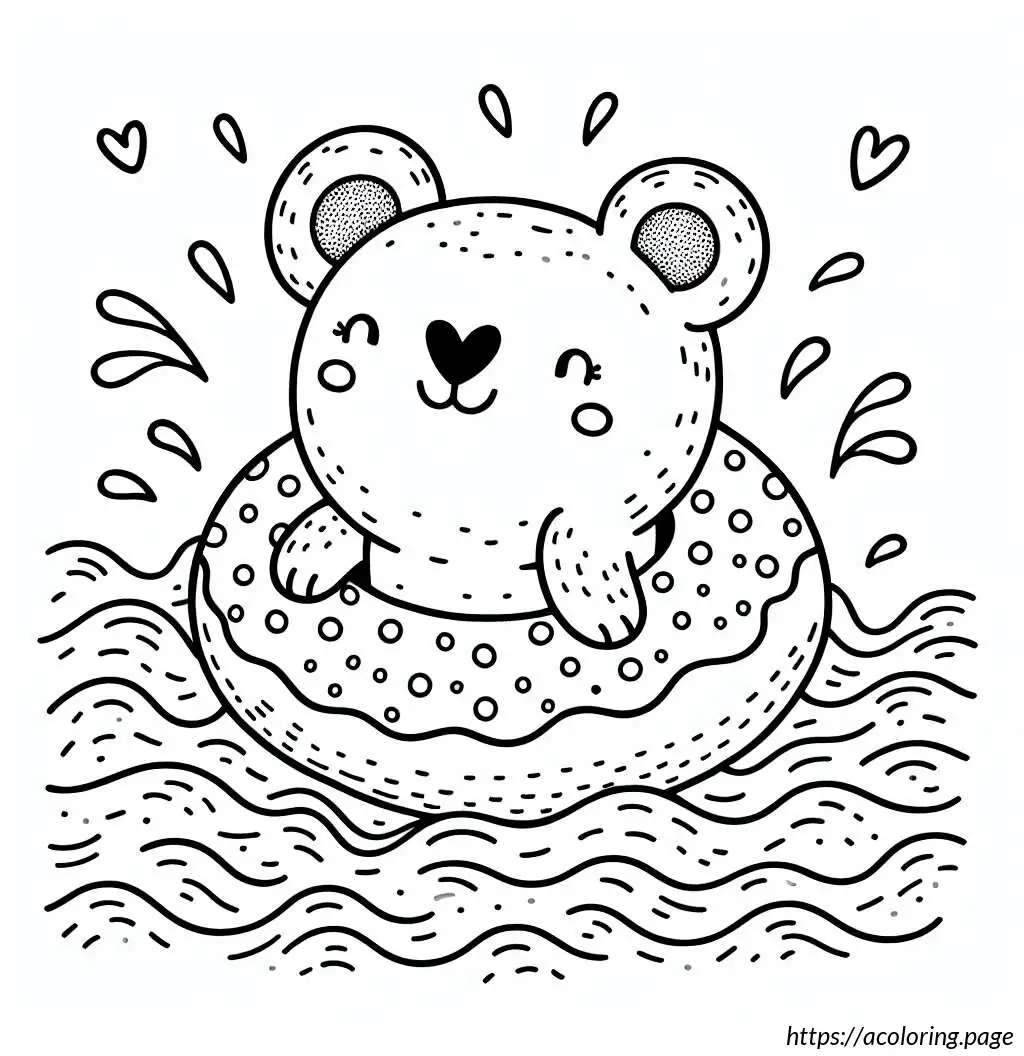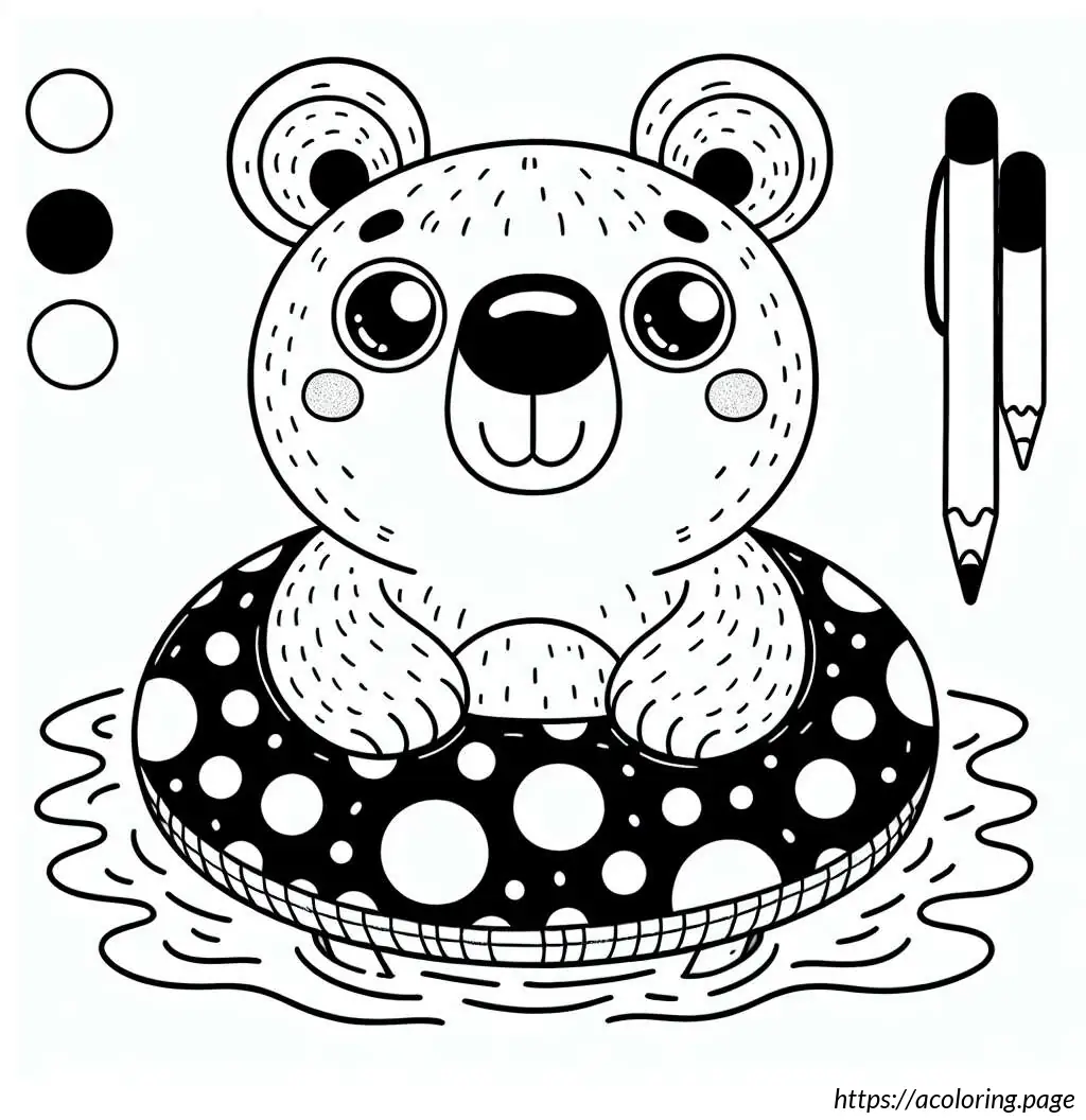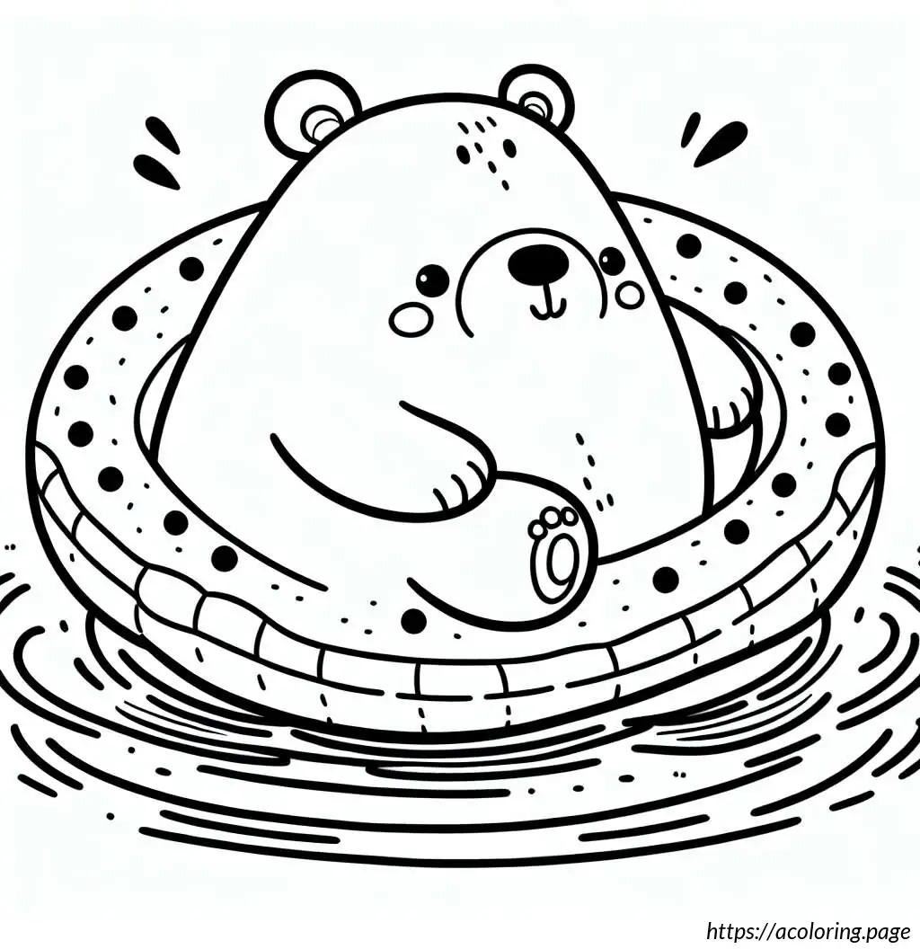 This is a black-and-white line drawing of a cartoon bear. The bear is standing waist-high in water, wearing a round, polka-dotted swimming ring around its midsection. The swimming ring is decorated with several large, darker circles scattered across its surface. The bear has a simple, stylized design with prominent, round eyes and a large, triangular nose at the center of its face. There are small freckle-like dots below the bear’s nose. The bear appears to be smiling slightly. The background indicates wavy lines representing water, suggesting the bear is in a pool or body of water.