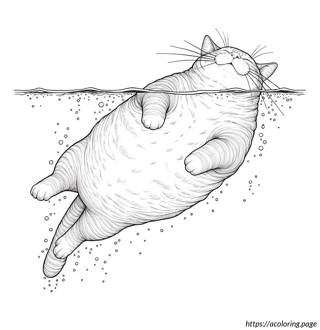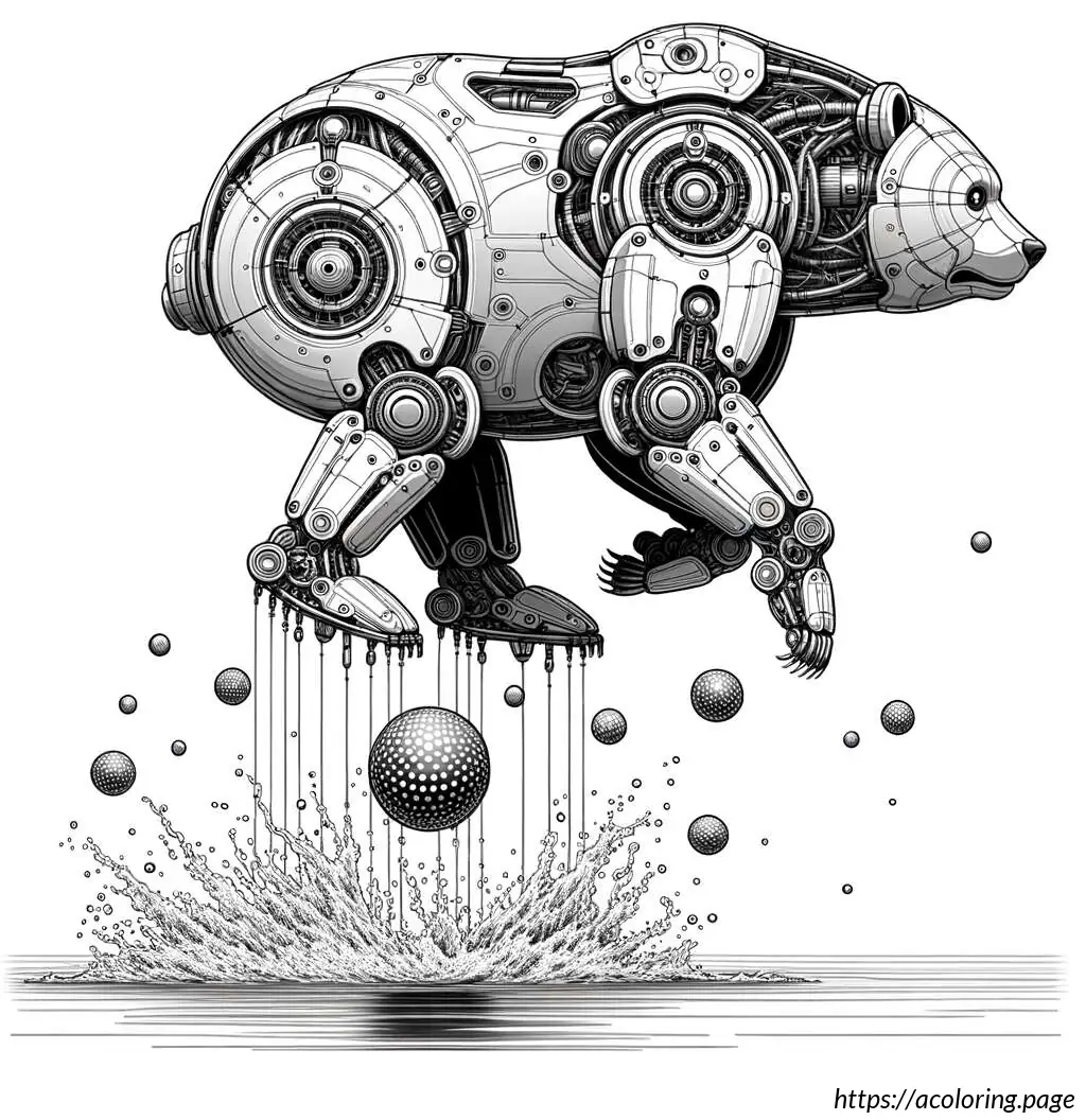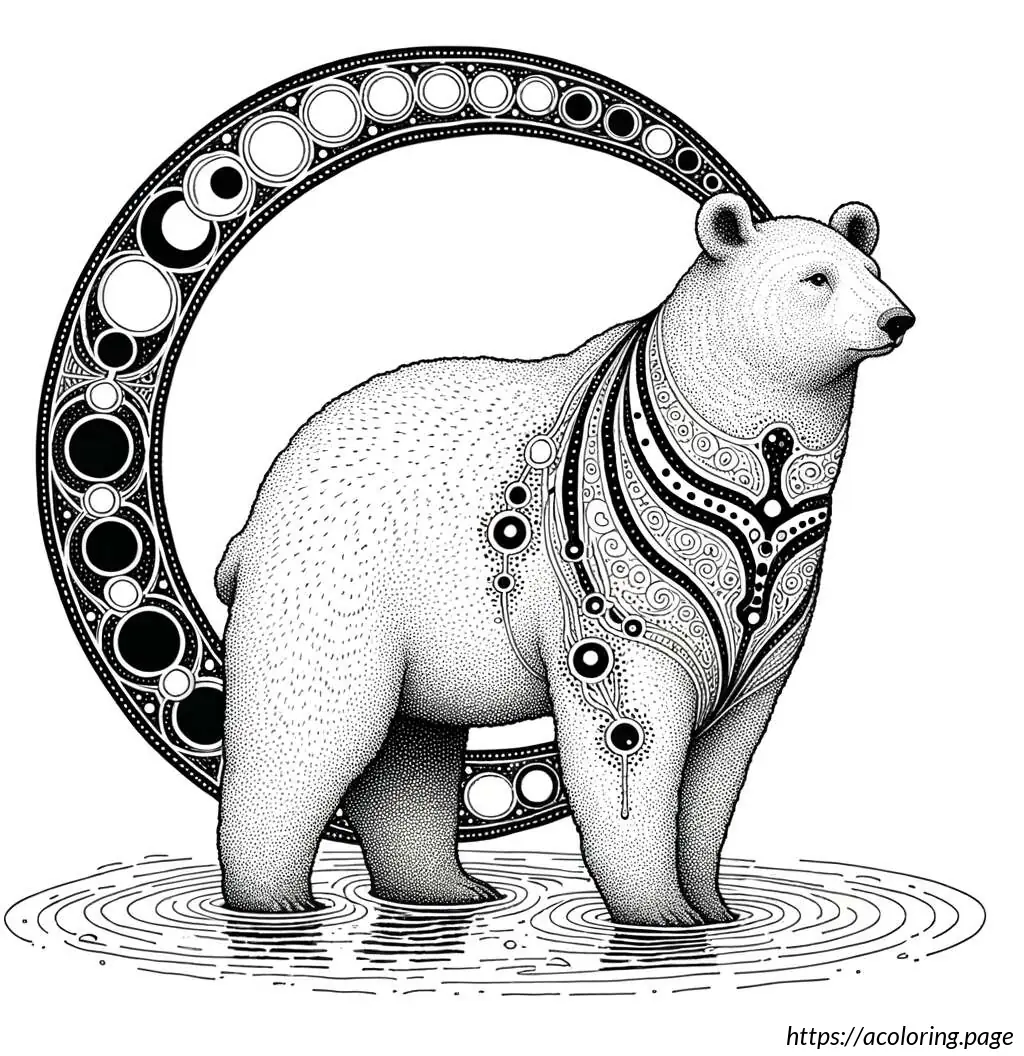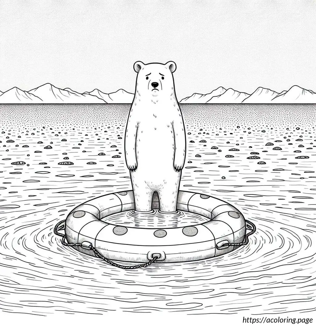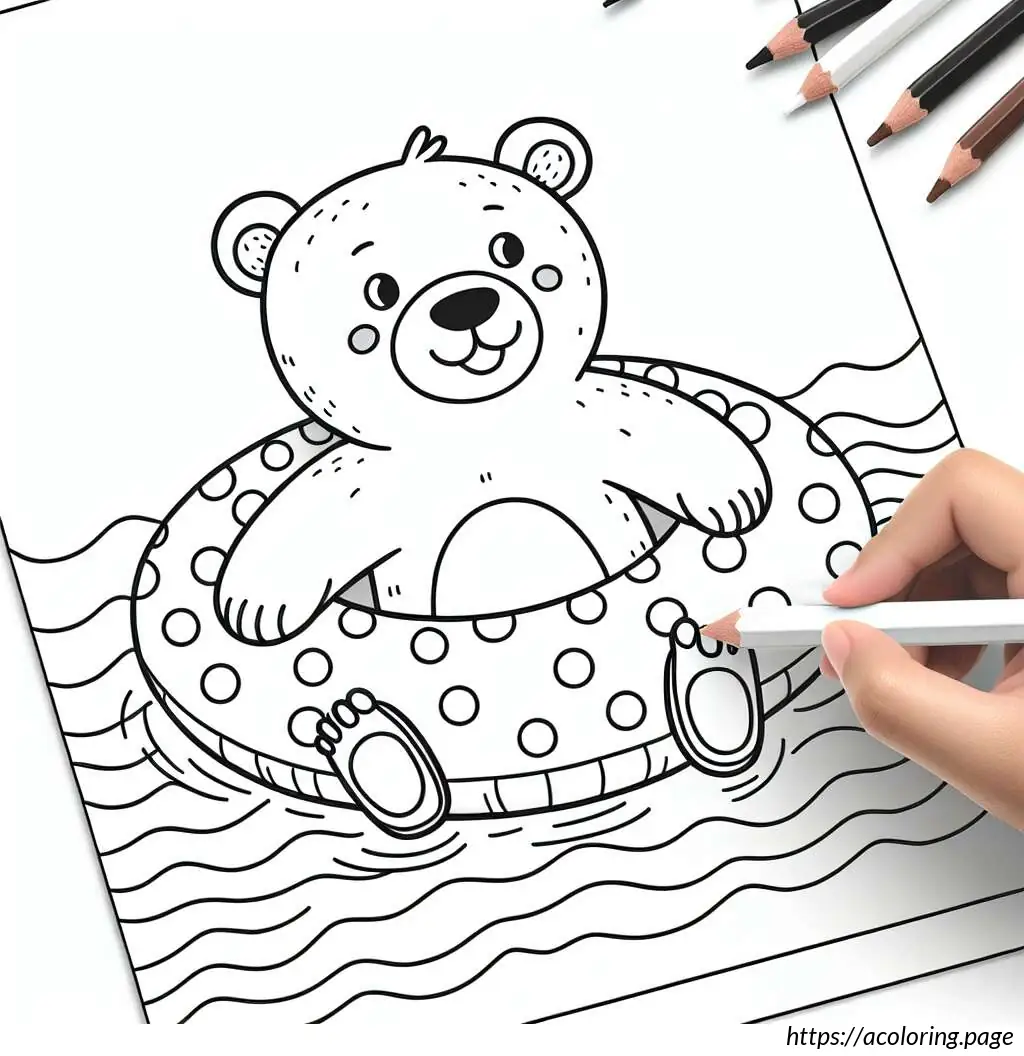 This is a black-and-white line drawing of a cartoon bear. The bear is standing waist-high in water, wearing a round, polka-dotted swimming ring around its midsection. The swimming ring is decorated with several large, darker circles scattered across its surface. The bear has a simple, stylized design with prominent, round eyes and a large, triangular nose at the center of its face. There are small freckle-like dots below the bear’s nose. The bear appears to be smiling slightly. The background indicates wavy lines representing water, suggesting the bear is in a pool or body of water.