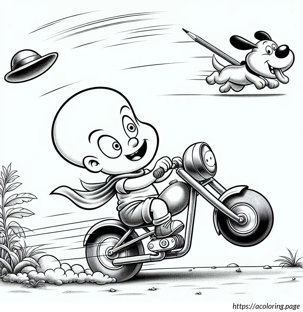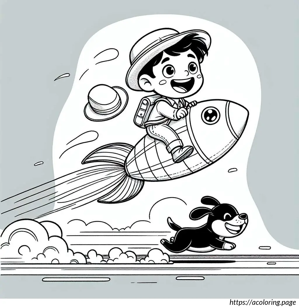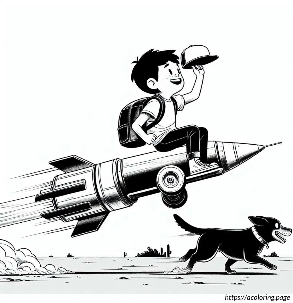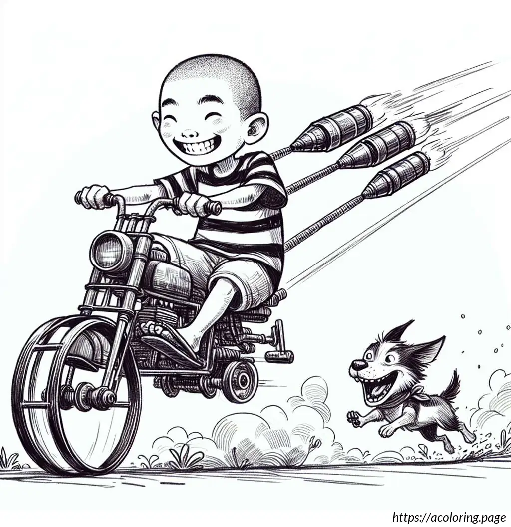 This cartoon-style black and white drawing depicts a bald young boy riding a makeshift rocket bike, accompanied by a speeding small dog. The scene is dynamic and cheerful. The boy is smiling widely and wearing a striped t-shirt, and he has lost one sandal, which flies behind him in the air. The rocket bike, created from a combination of a motorcycle body and attached rockets, emits fumes and energy at the back, indicating high speed. The small dog, with an open mouth that suggests excitement or barking, runs alongside the bike almost keeping up with its pace. The background is minimalistic, just suggesting a rough path or road through sketchy lines.