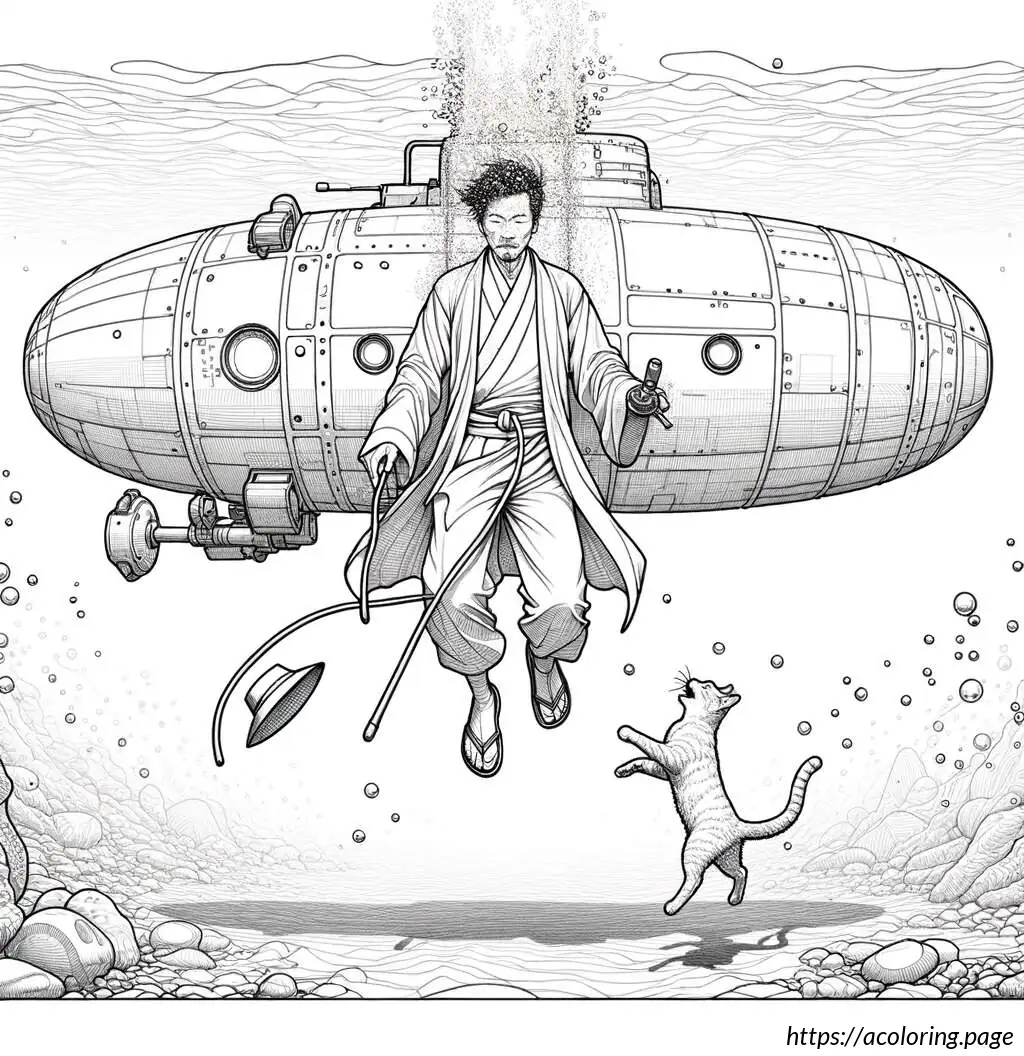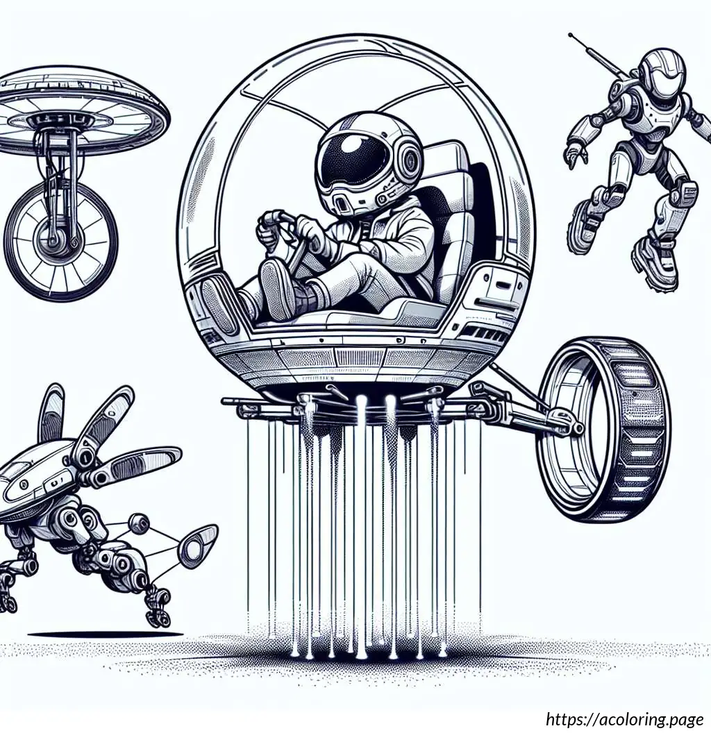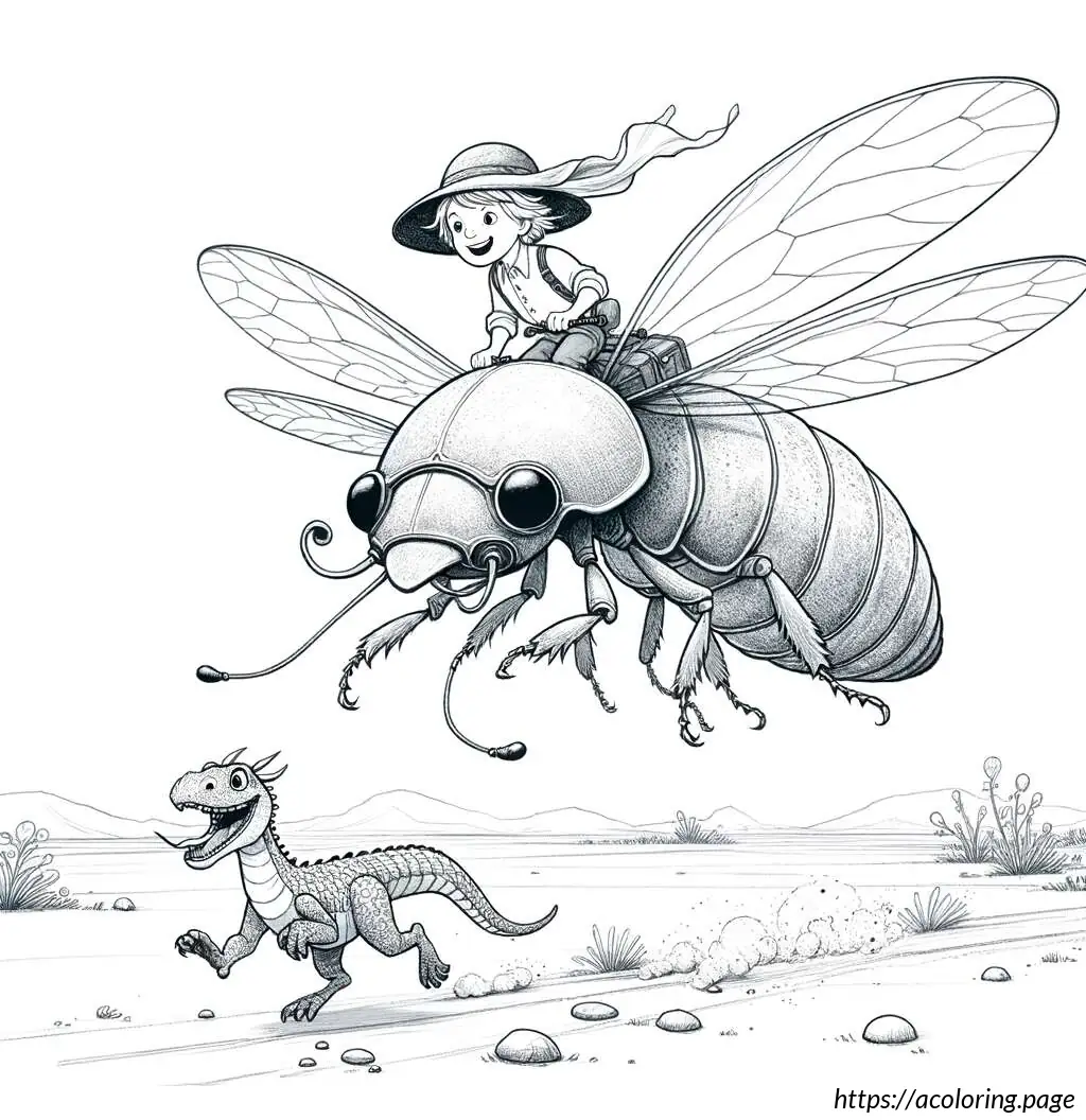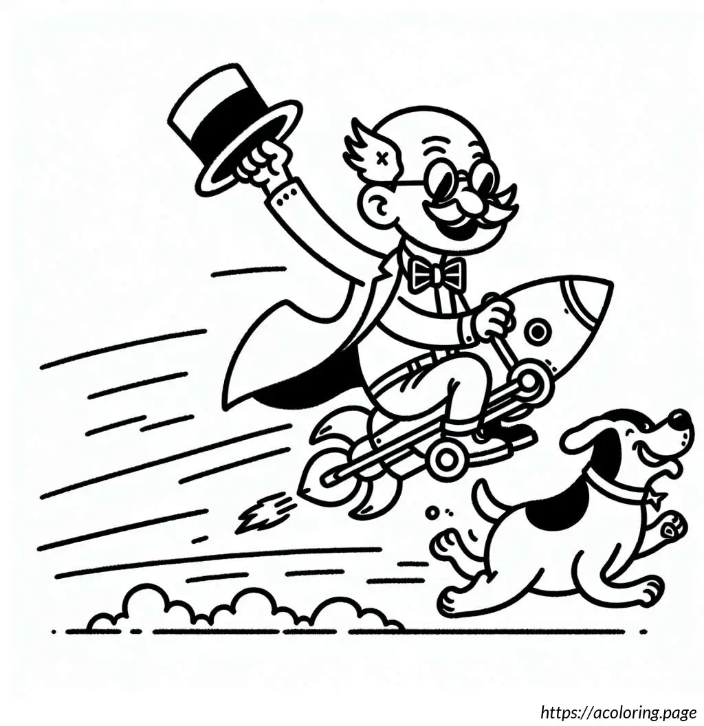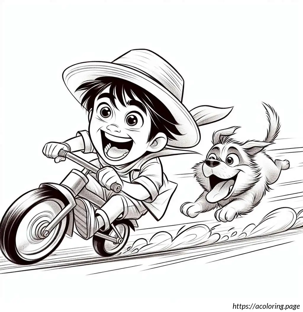This cartoon-style black and white drawing depicts a bald young boy riding a makeshift rocket bike, accompanied by a speeding small dog. The scene is dynamic and cheerful. The boy is smiling widely and wearing a striped t-shirt, and he has lost one sandal, which flies behind him in the air. The rocket bike, created from a combination of a motorcycle body and attached rockets, emits fumes and energy at the back, indicating high speed. The small dog, with an open mouth that suggests excitement or barking, runs alongside the bike almost keeping up with its pace. The background is minimalistic, just suggesting a rough path or road through sketchy lines.