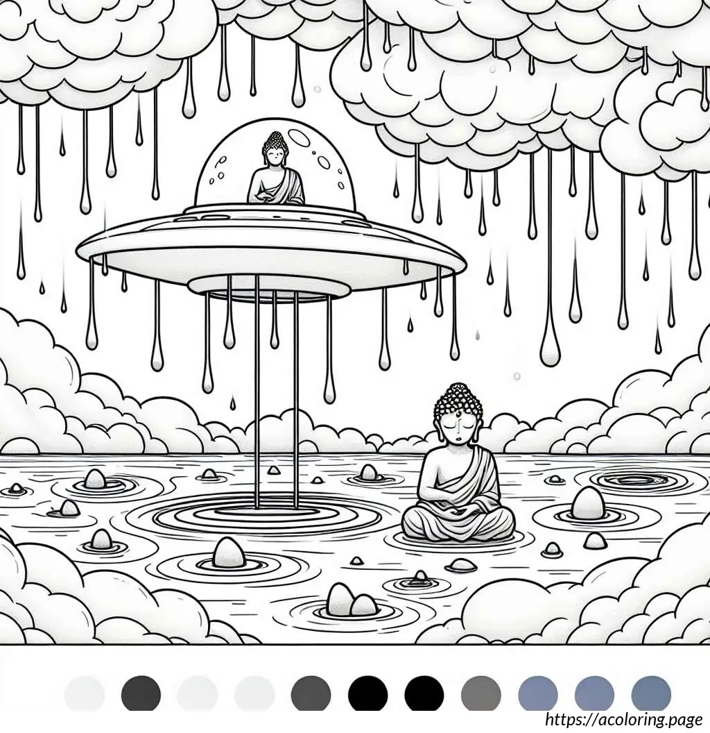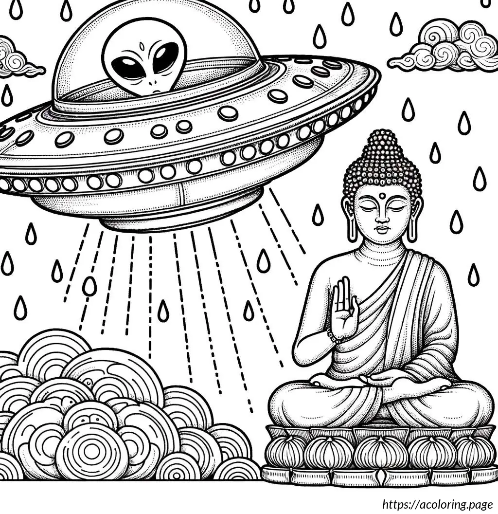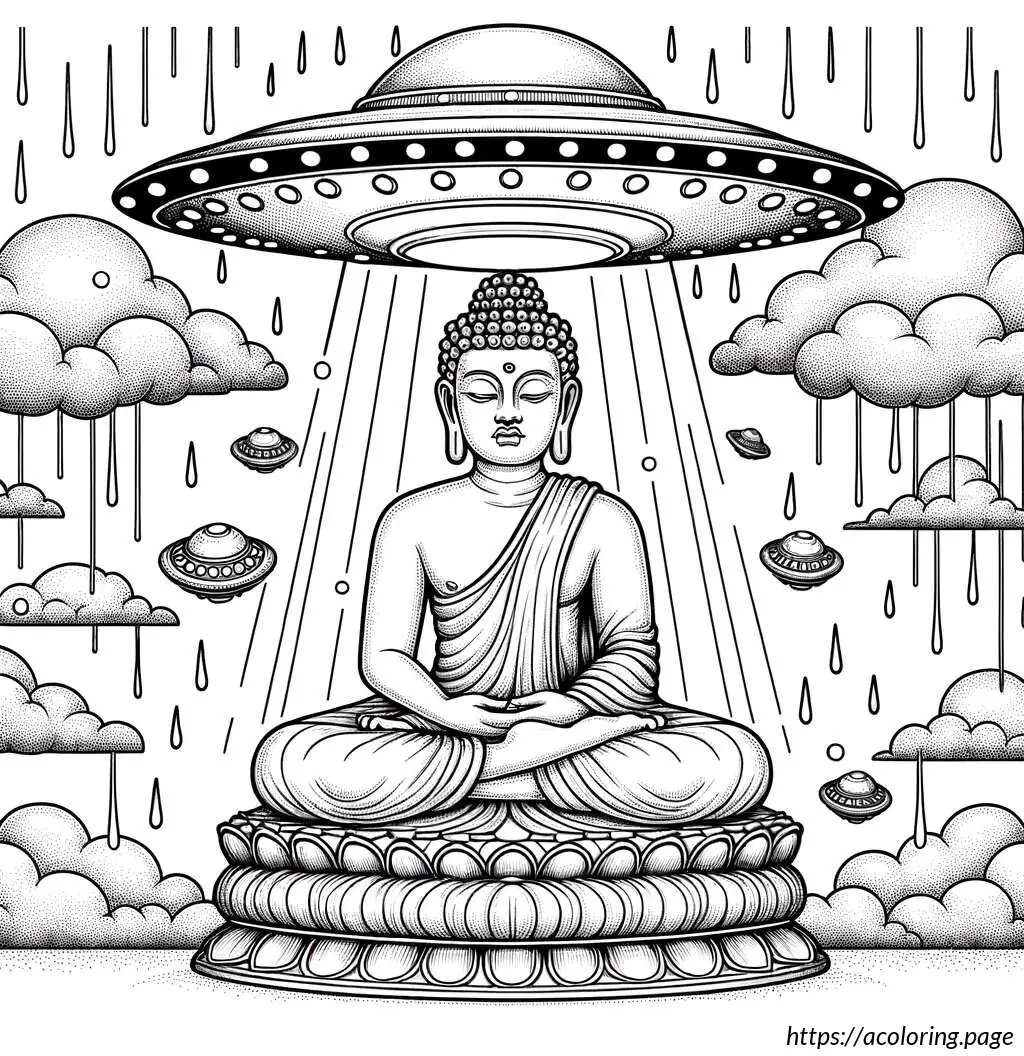 In the background and towards the top of the image, there is a flying saucer-style UFO. The UFO is depicted with a classic round shape, large enough relative to the Buddha to suggest a significant size. It emits several dots that might represent lights, and there are raindrops falling all around the scene, indicating a rainy setting. The clouds and rain add to the atmosphere, creating a somewhat surreal juxtaposition between the calm Buddha and the mysterious UFO. This contrast may suggest themes of tranquility amidst unusual or extraordinary circumstances.