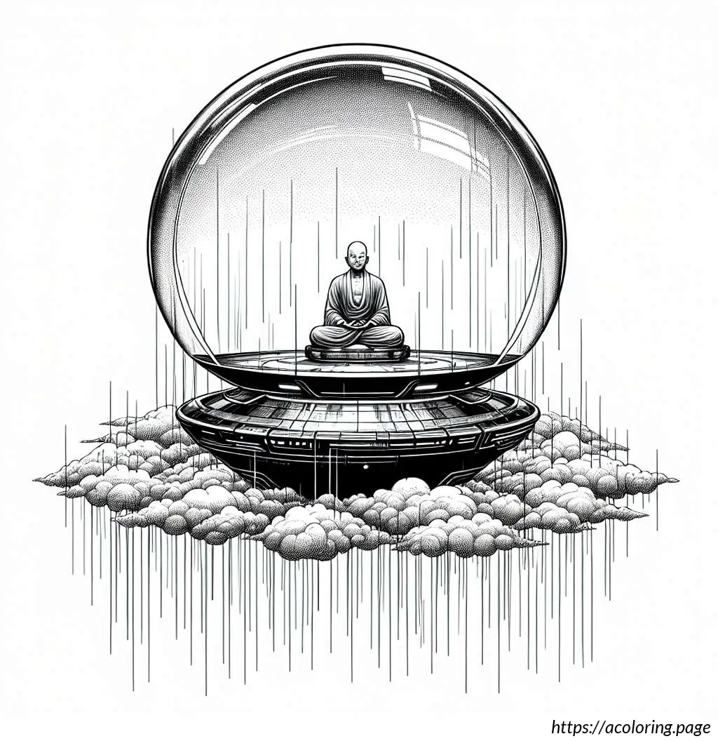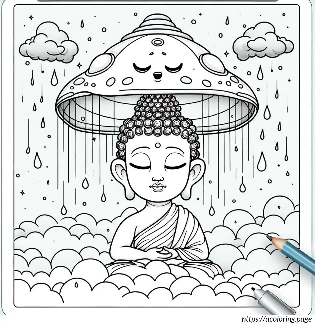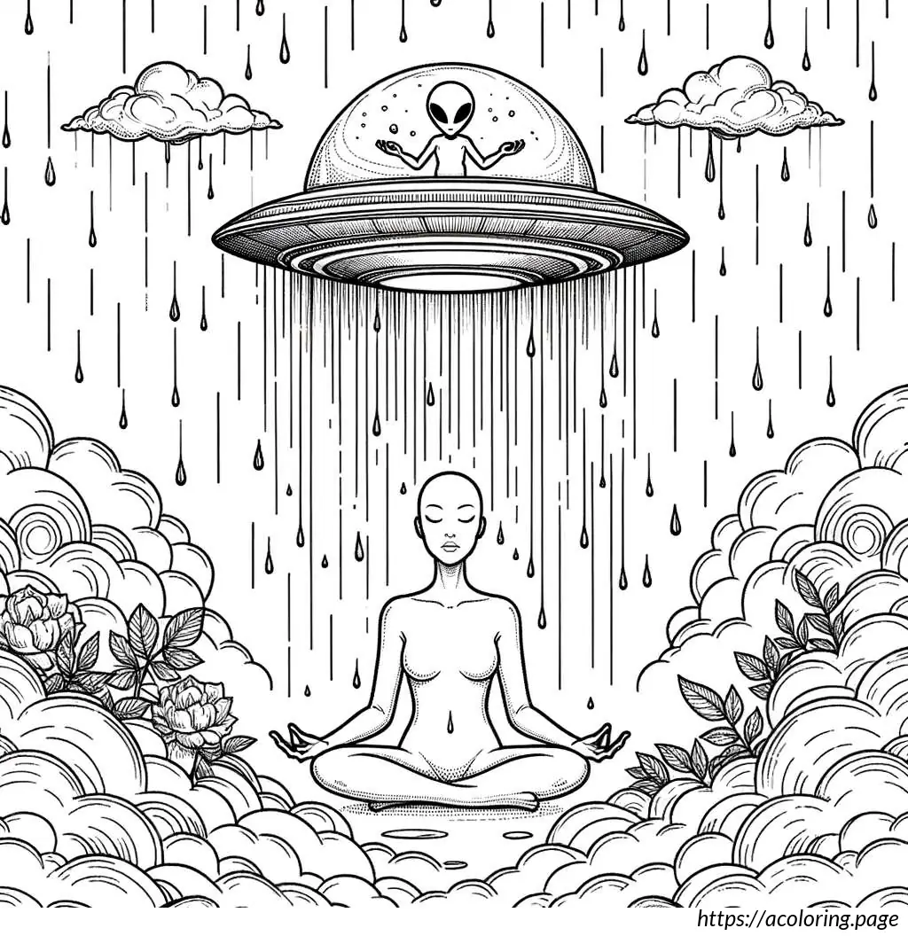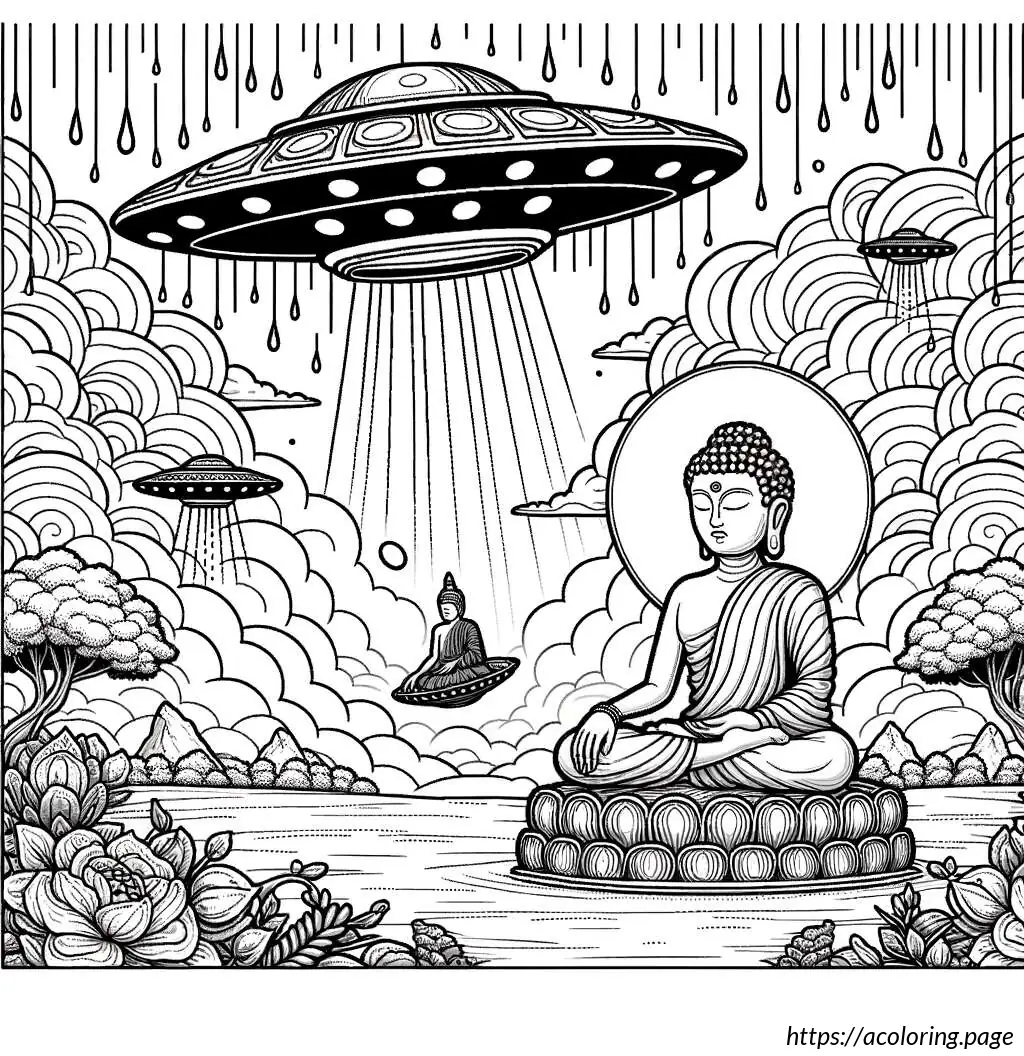 In the background and towards the top of the image, there is a flying saucer-style UFO. The UFO is depicted with a classic round shape, large enough relative to the Buddha to suggest a significant size. It emits several dots that might represent lights, and there are raindrops falling all around the scene, indicating a rainy setting. The clouds and rain add to the atmosphere, creating a somewhat surreal juxtaposition between the calm Buddha and the mysterious UFO. This contrast may suggest themes of tranquility amidst unusual or extraordinary circumstances.