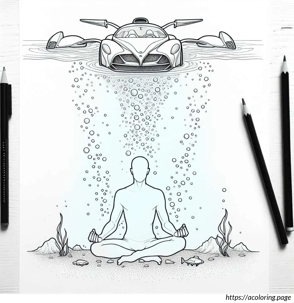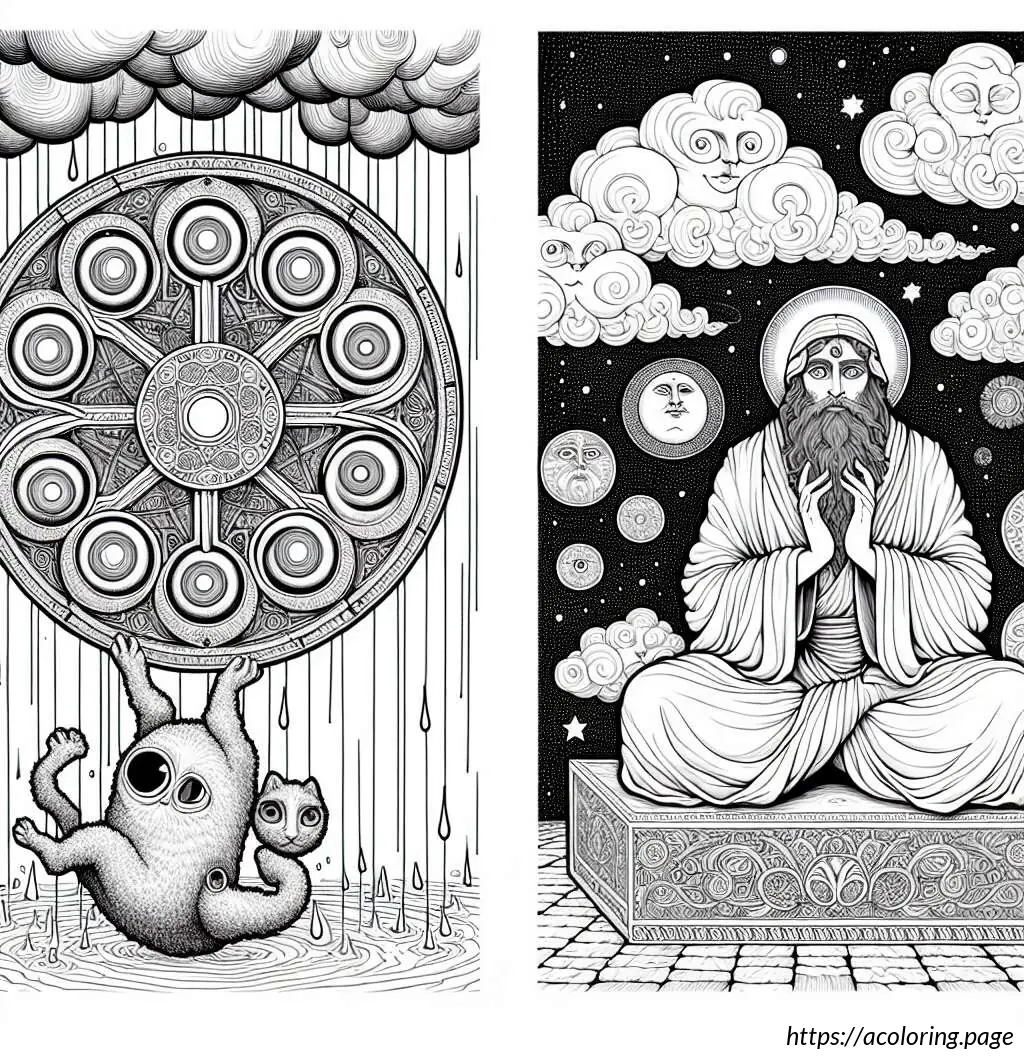This image is a black and white line drawing featuring two main elements. In the foreground, there is a depiction of a seated Buddha statue. The Buddha is shown meditating, with eyes closed, hands placed together in the lap, draped in robes, and seated in a traditional meditation pose atop a pedestal, which appears to be surrounded by clouds. The Buddha’s facial expression is serene, suggesting a state of deep meditation or enlightenment.