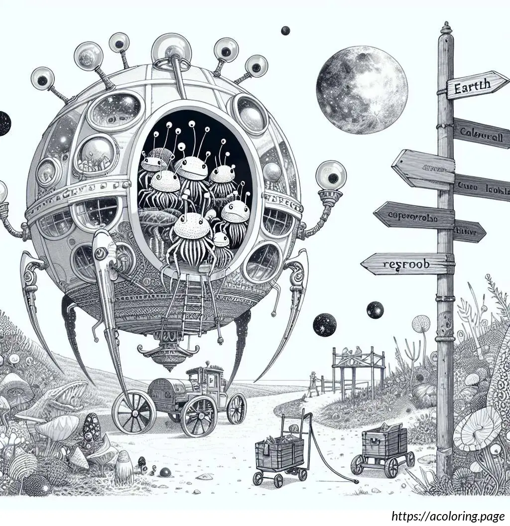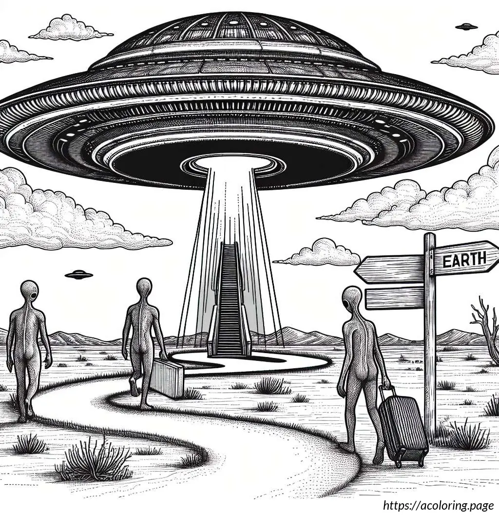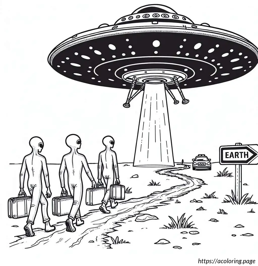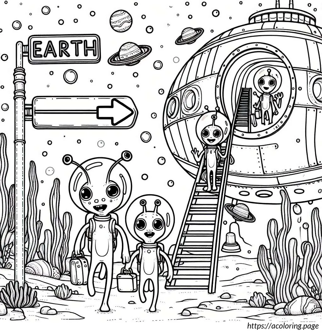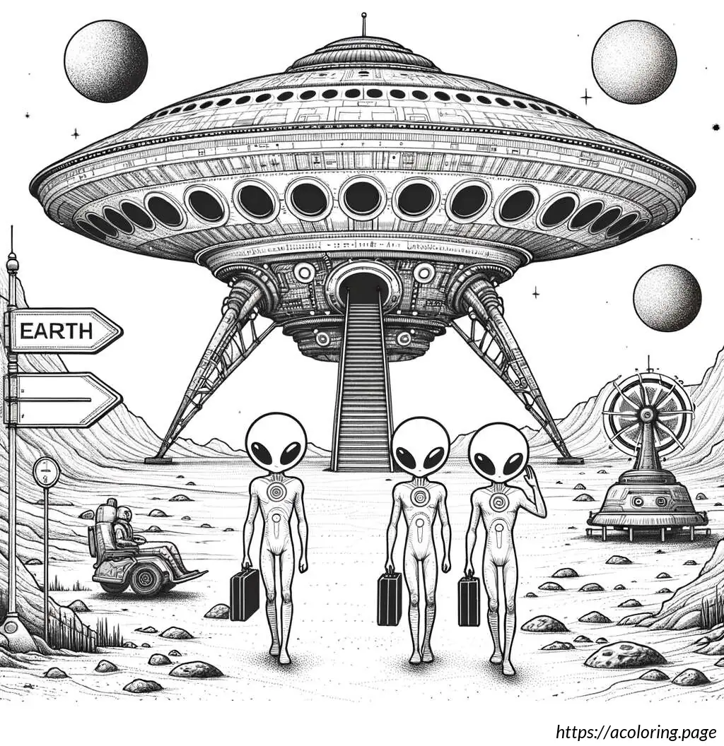 On the left side of the image, there’s a sign that reads “EARTH” with an arrow pointing to the right, next to an icon of a flying saucer, suggesting a directional sign for arriving visitors.