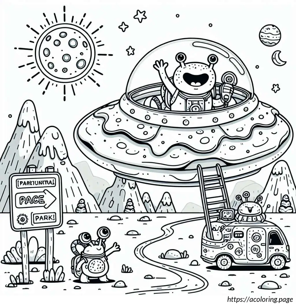 The background and foreground are minimally detailed, indicating a barren landscape beneath a clear sky. The overall tone of the image is light-hearted and comedic, emphasizing a playful take on the concept of aliens visiting Earth.