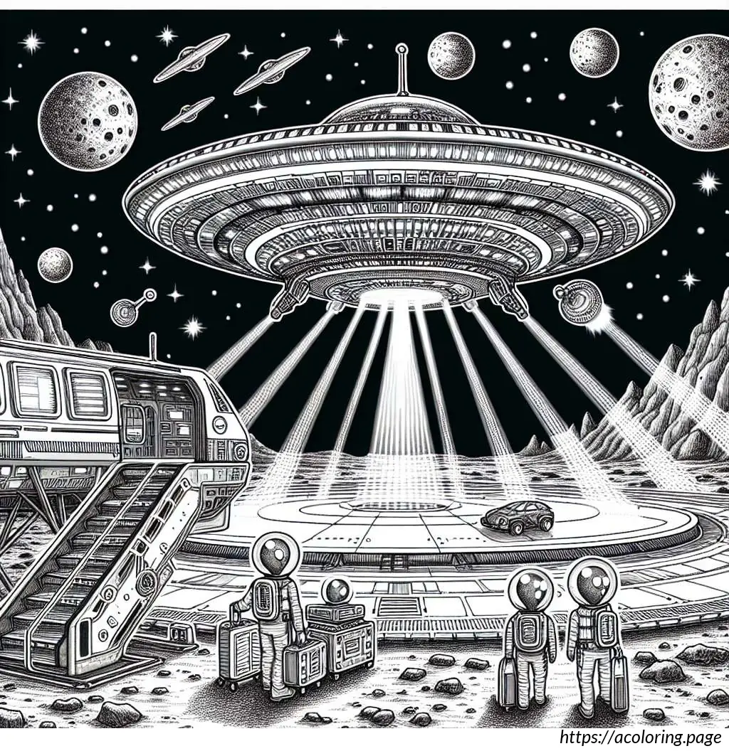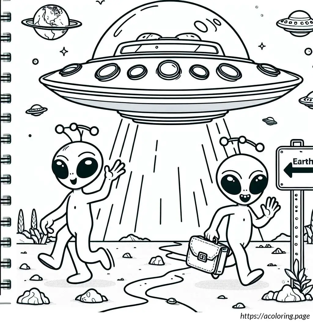 This image depicts a whimsical extraterrestrial scene involving two cartoon aliens arriving at or departing Earth. The scene includes a large flying saucer, which is prominently featured in the upper part of the image. The saucer is detailed with multiple lights or windows and has a staircase extending from its center, reaching down to the ground.
