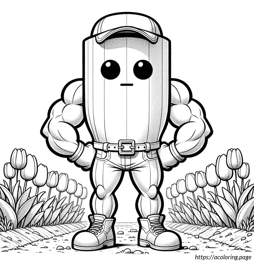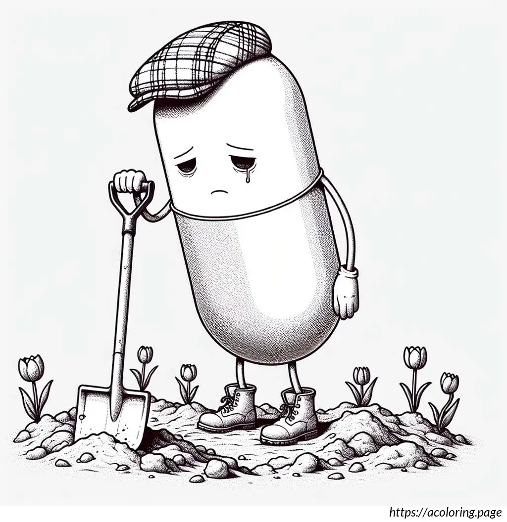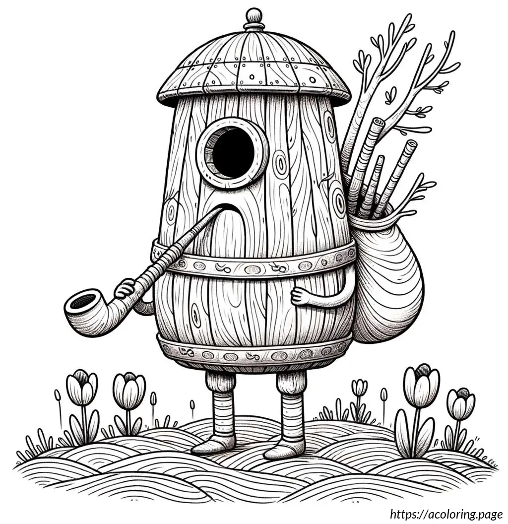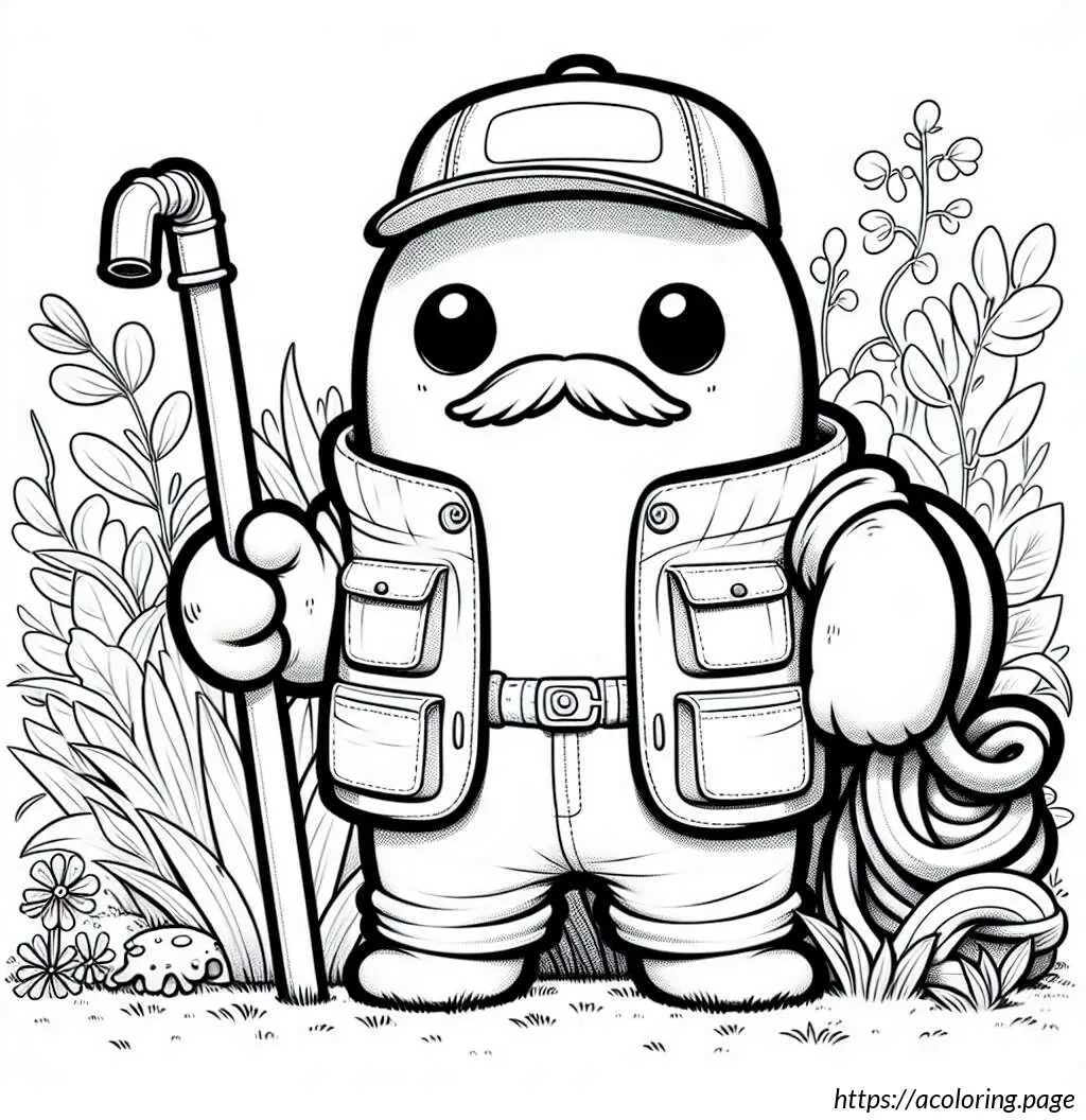 This image is a black-and-white line drawing depicting a cartoon character resembling a cylindrical, anthropomorphic creature. The character is accessorized in a manner suggesting it is engaged in an outdoor activity, possibly gardening: