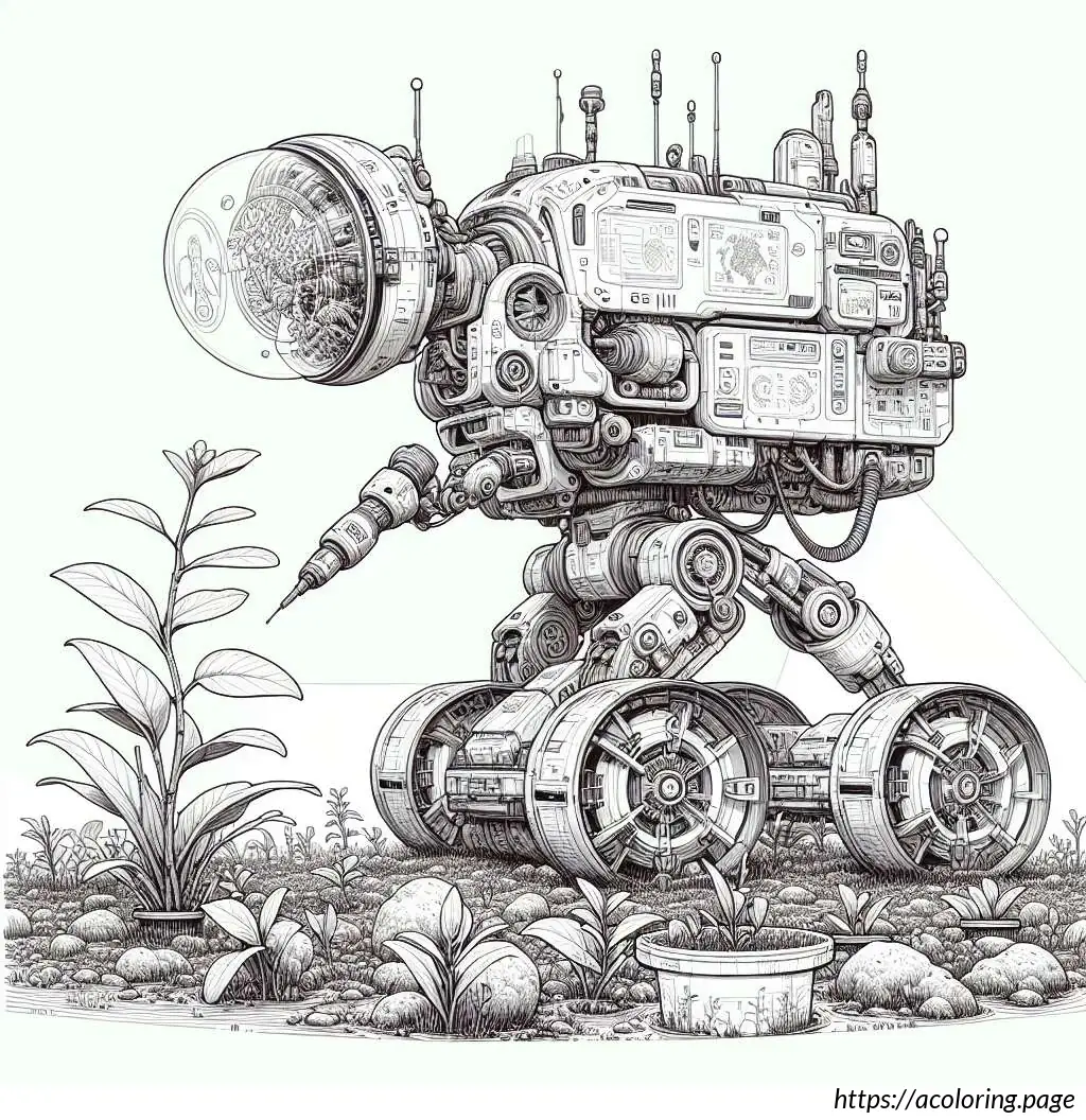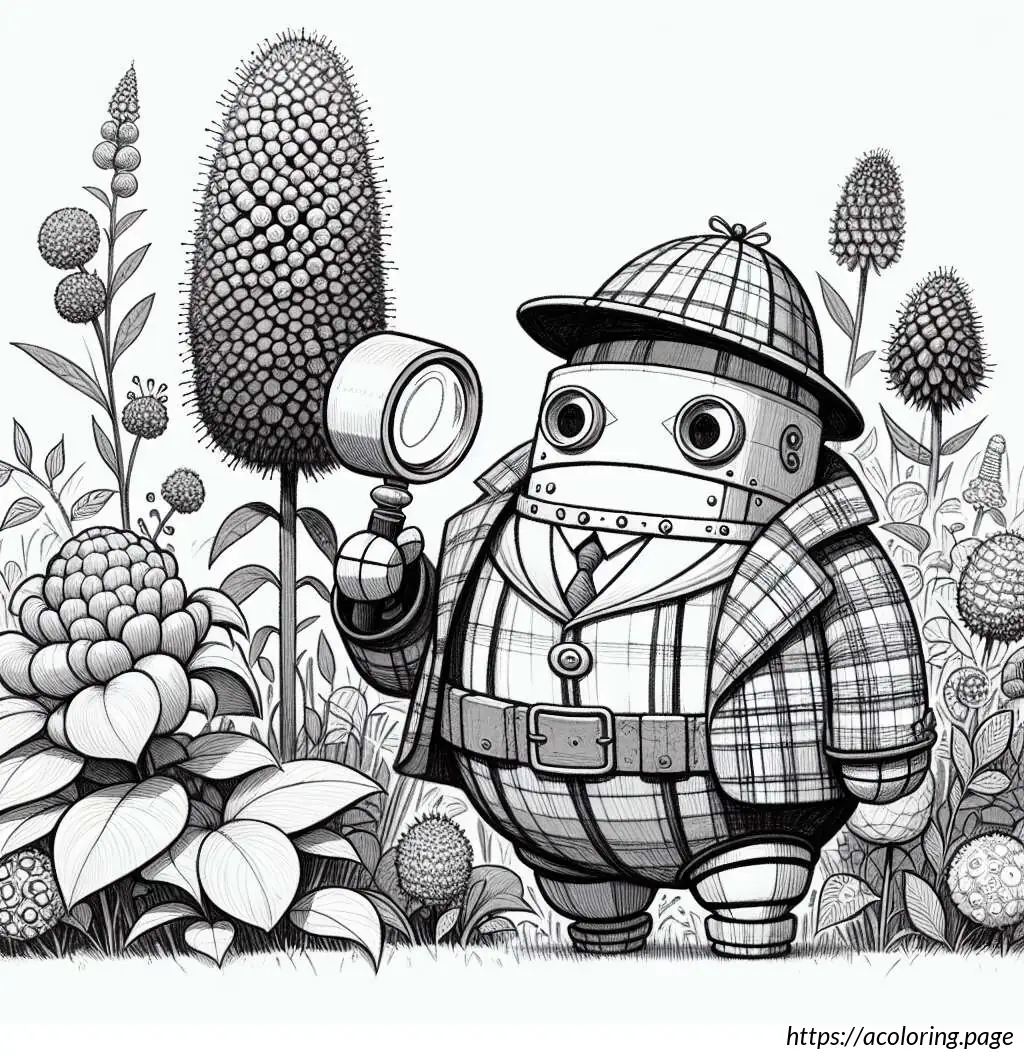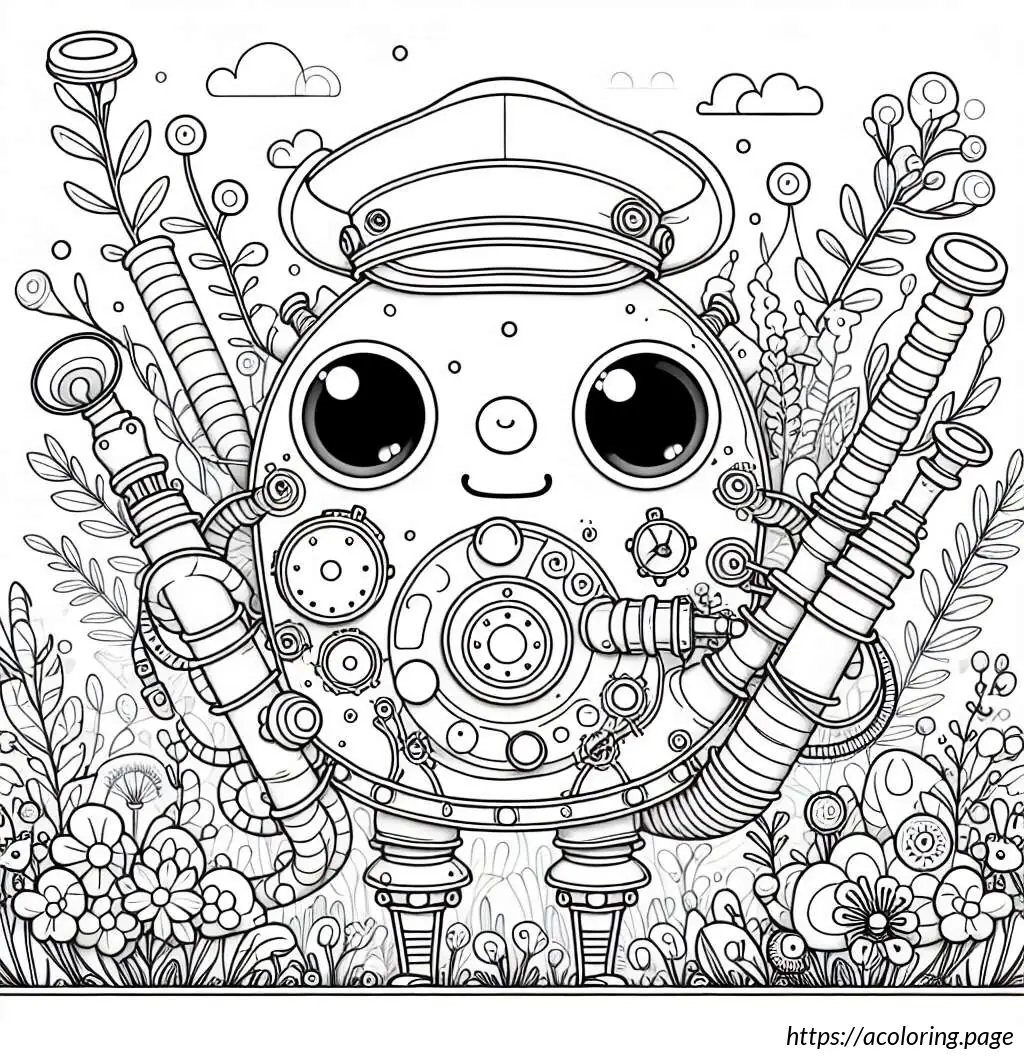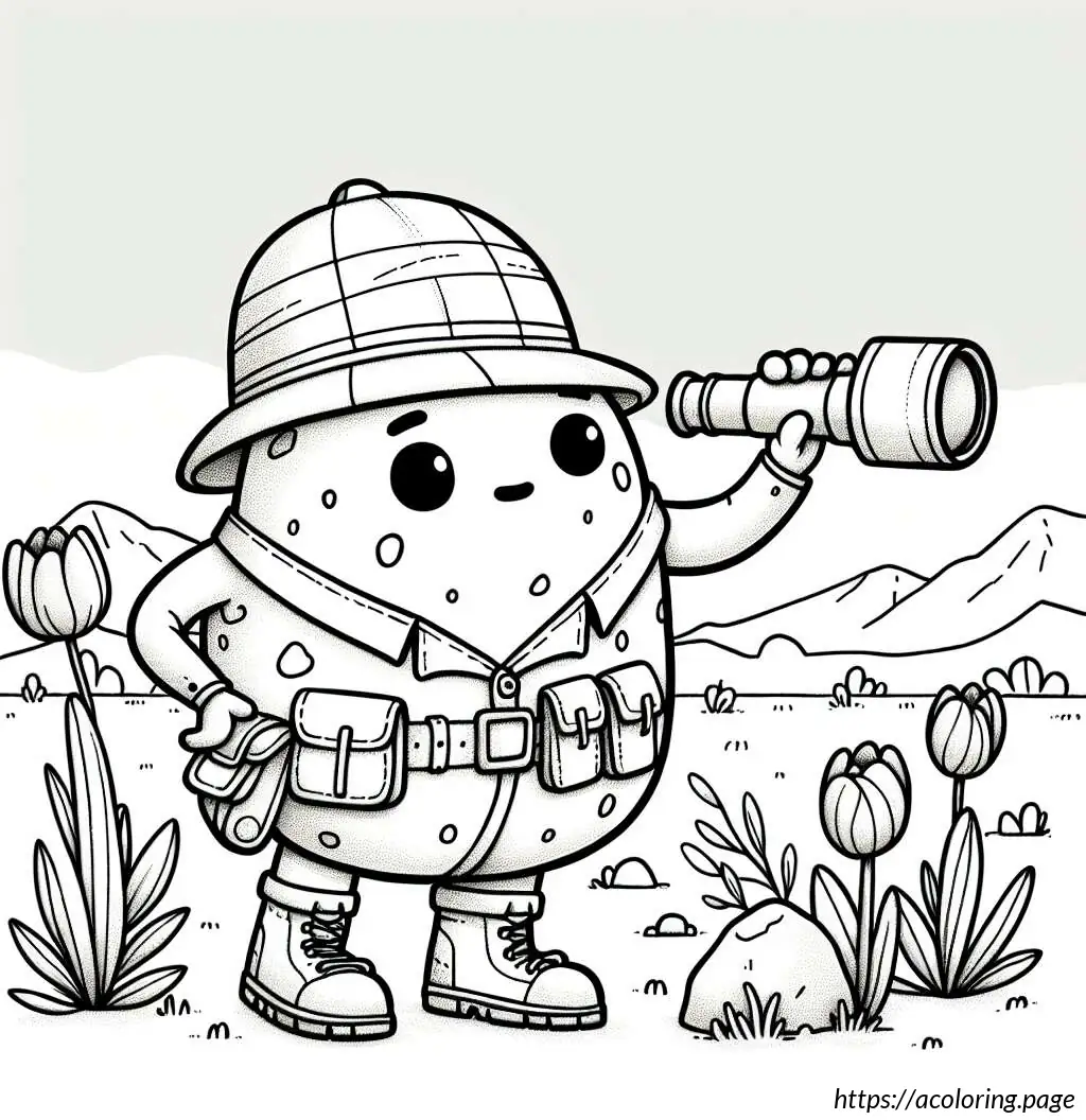 This image is a black-and-white line drawing depicting a cartoon character resembling a cylindrical, anthropomorphic creature. The character is accessorized in a manner suggesting it is engaged in an outdoor activity, possibly gardening: