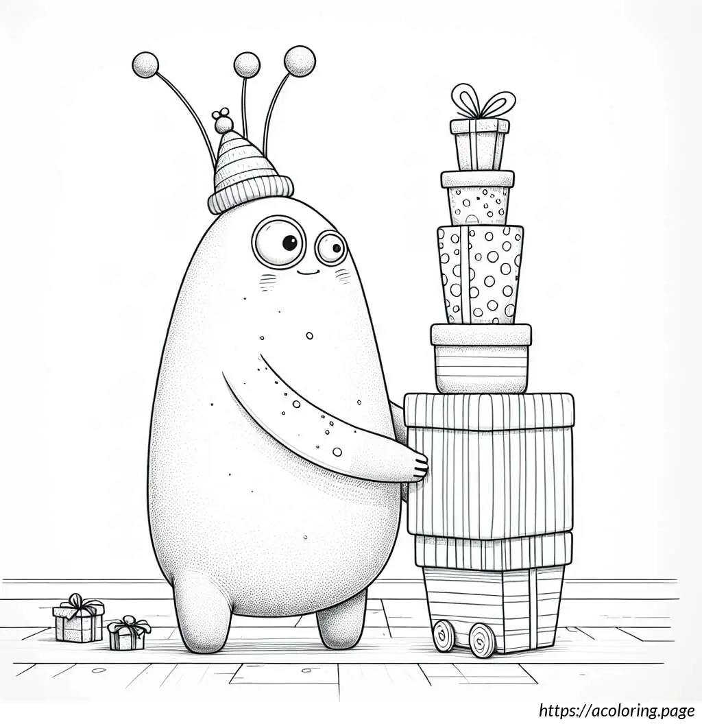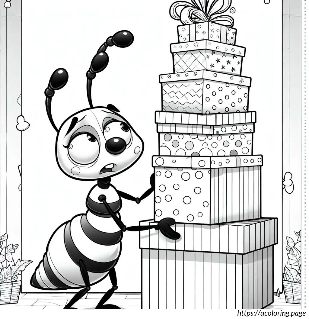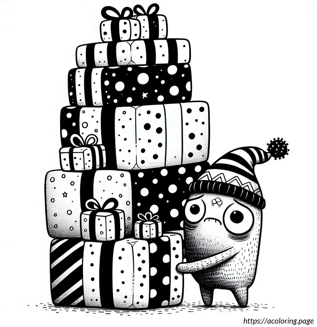 The image depicts a cartoon-style character carrying a large stack of gift boxes. The character appears a bit overwhelmed and is looking upwards with wide eyes towards the top of the stack it’s carrying. It has ant-like antennas and stands upright on two legs. The gift boxes vary in design and size, with features such as stars, dots, and ribbons. The bottom gift box is much larger than the others, adorned with a polka dot pattern, and the box on top has a simple bow. The background shows a simple indoor setting, indicating a room with an implied corner. Overall, it’s a playful illustration, possibly representing the challenges of balancing multiple tasks or responsibilities.